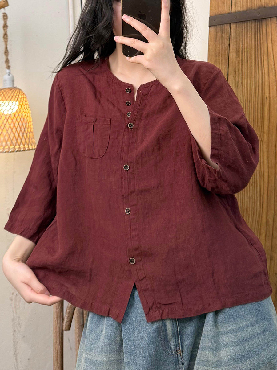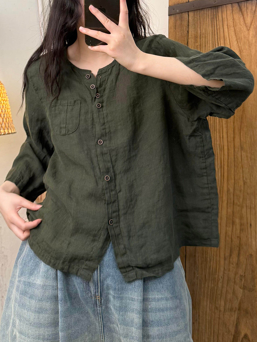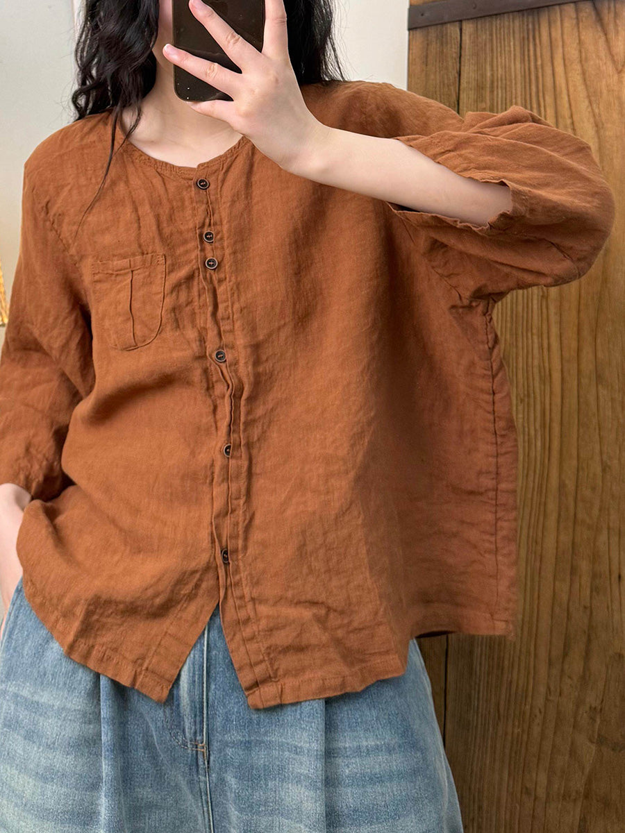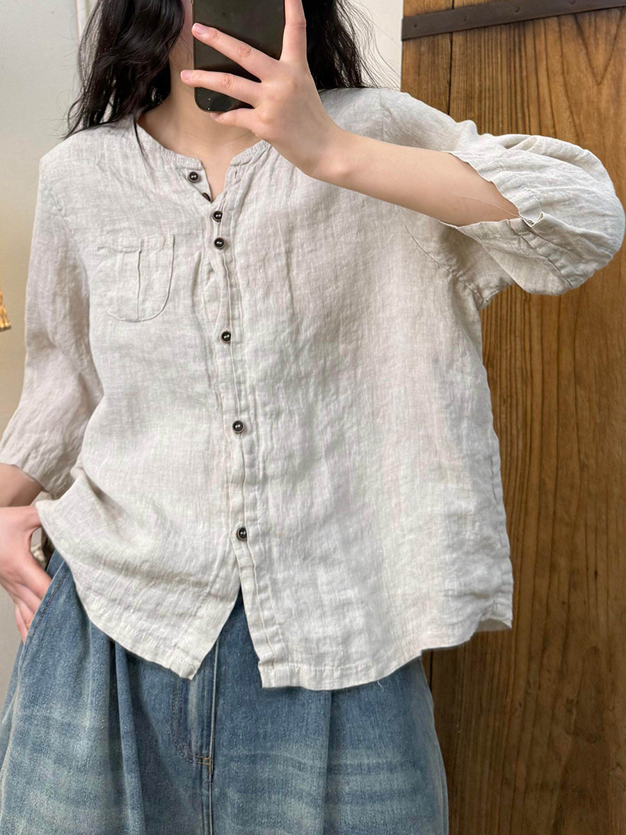 Women Artsy Summer Pure Color O-Neck Linen Shirt