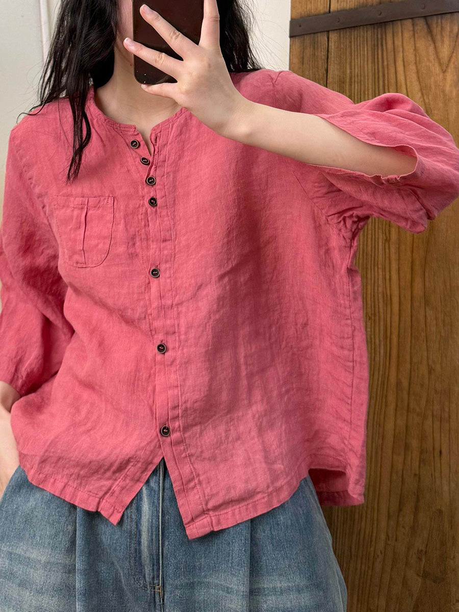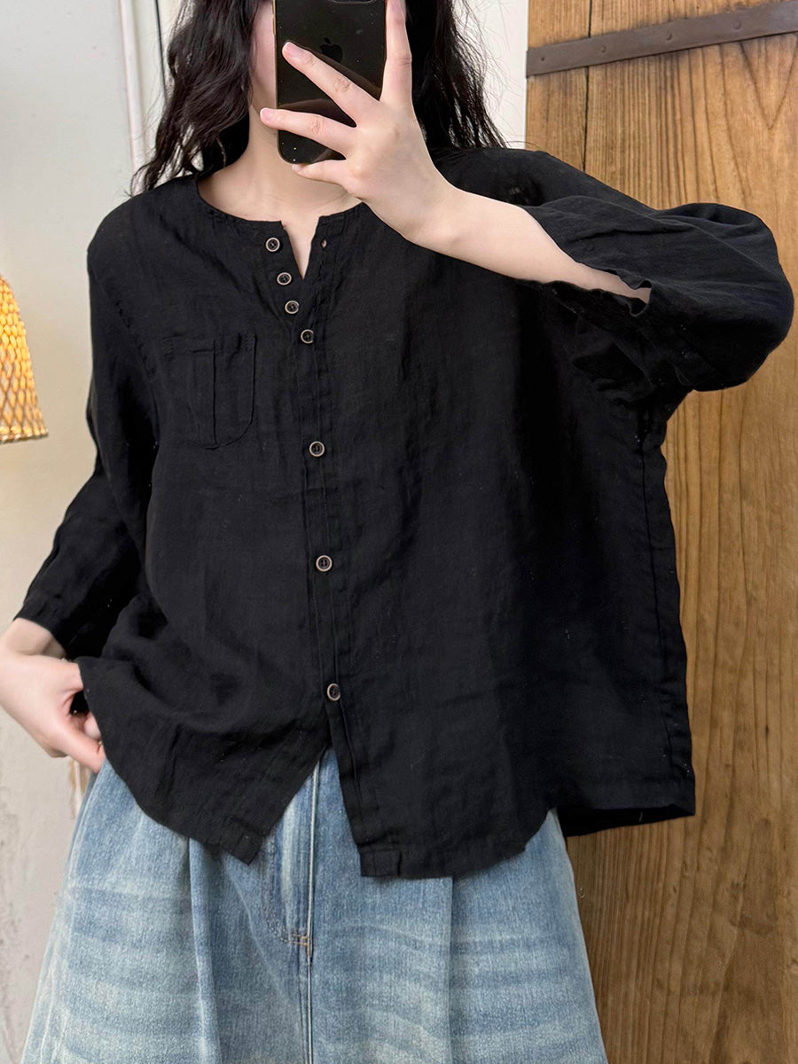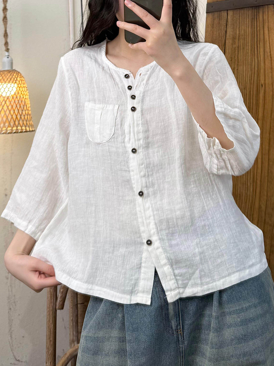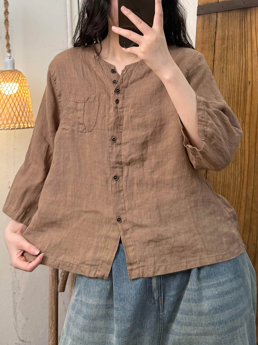 Women Artsy Summer Pure Color O-Neck Linen Shirt