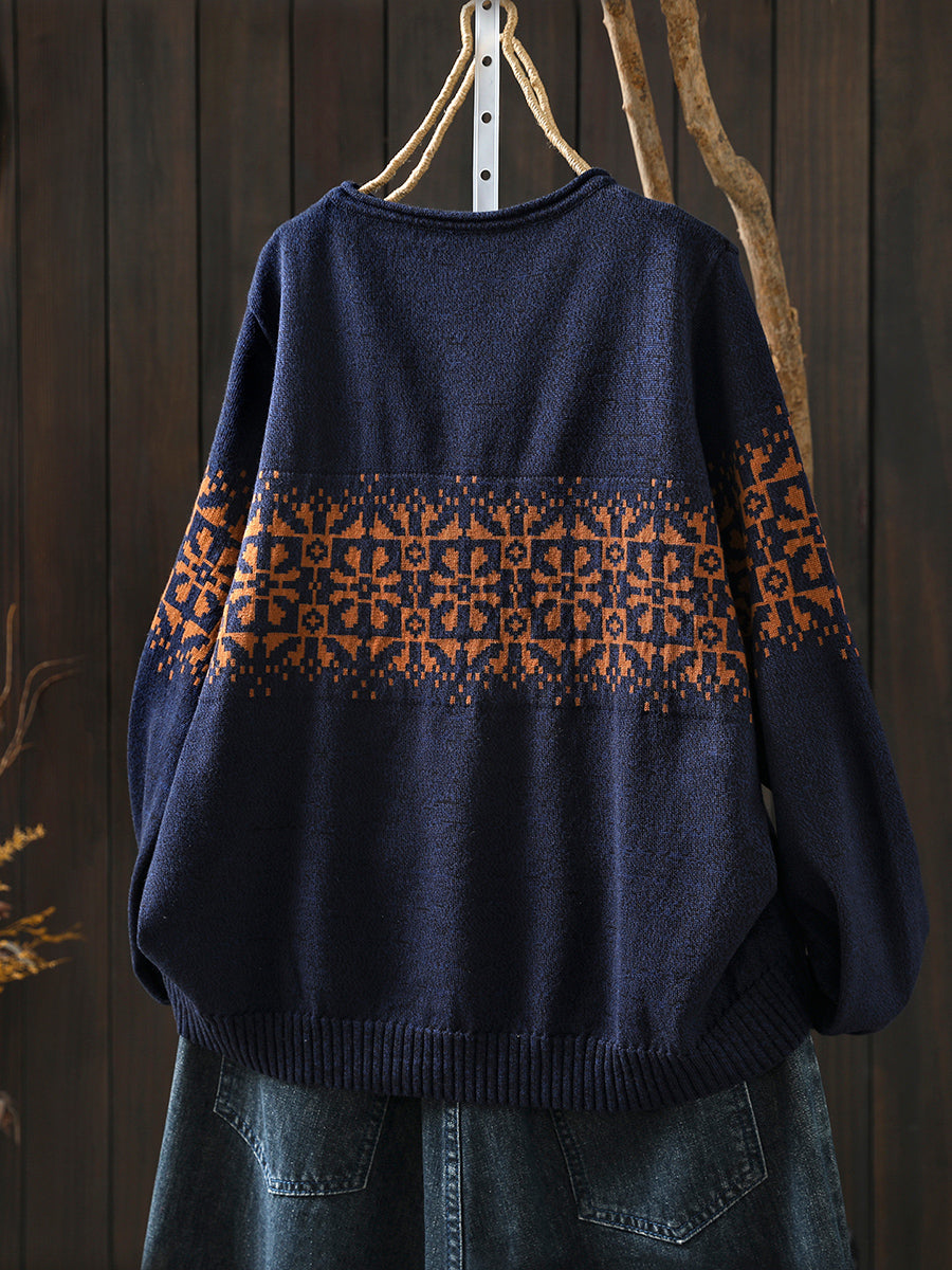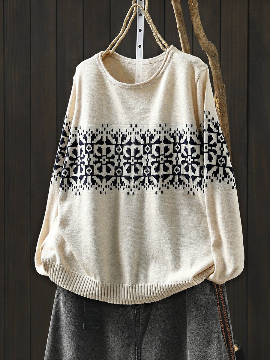Women Autumn Artsy Flower Knitted O-Neck Sweater