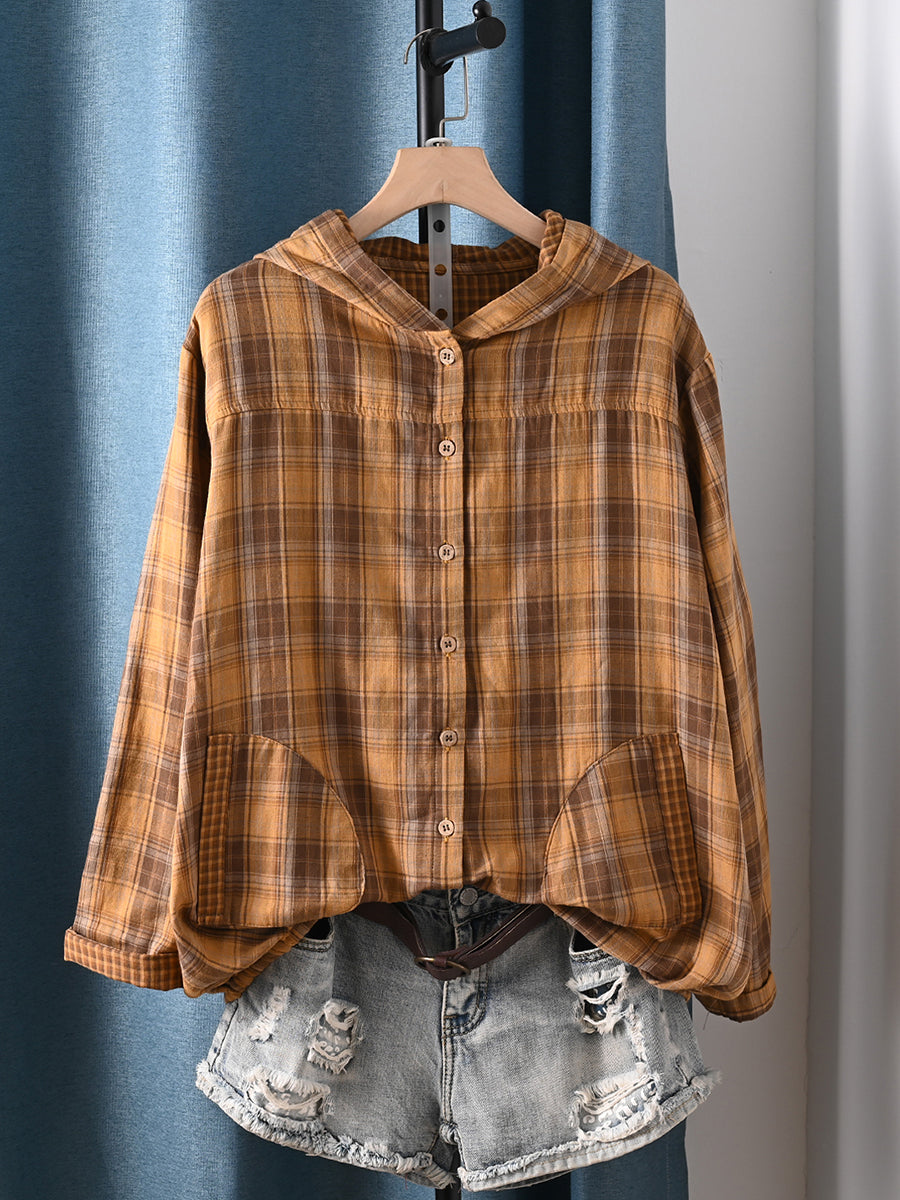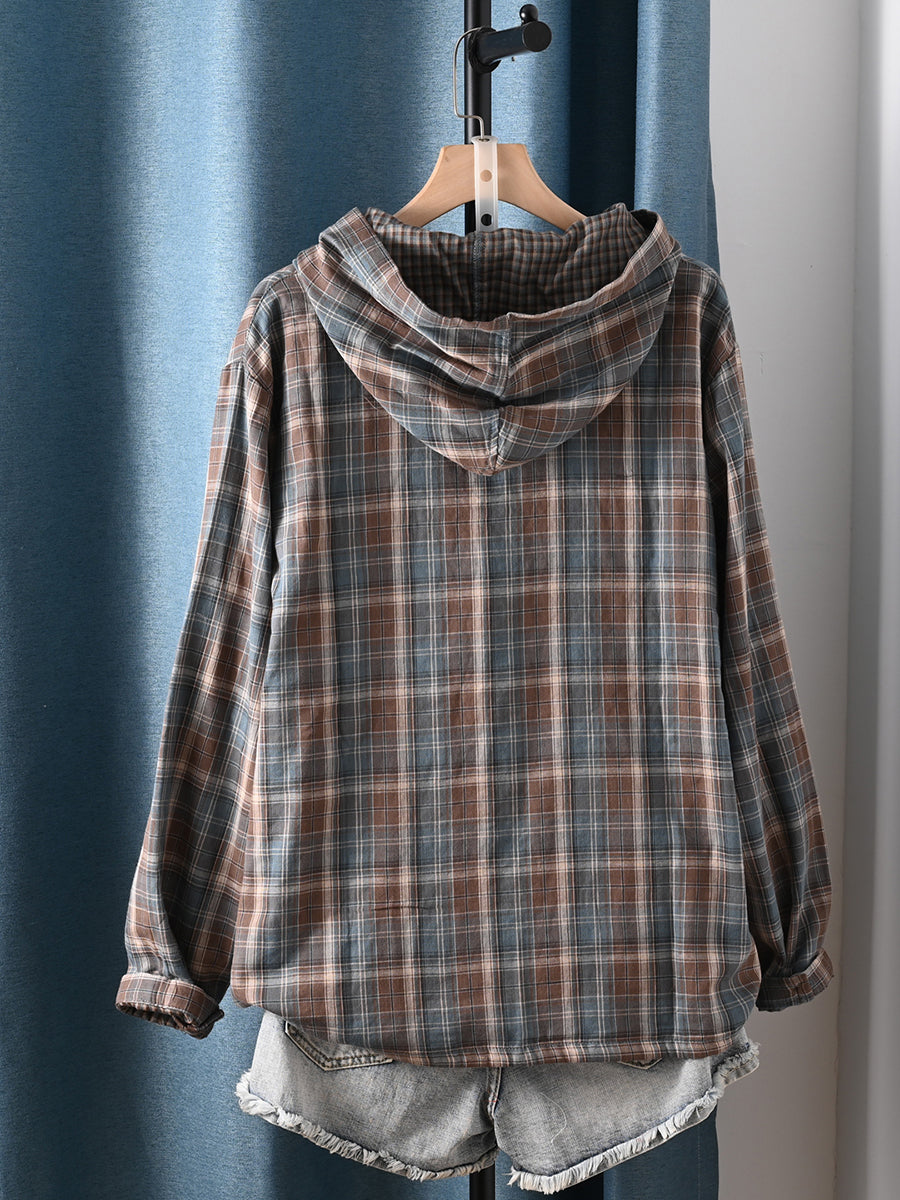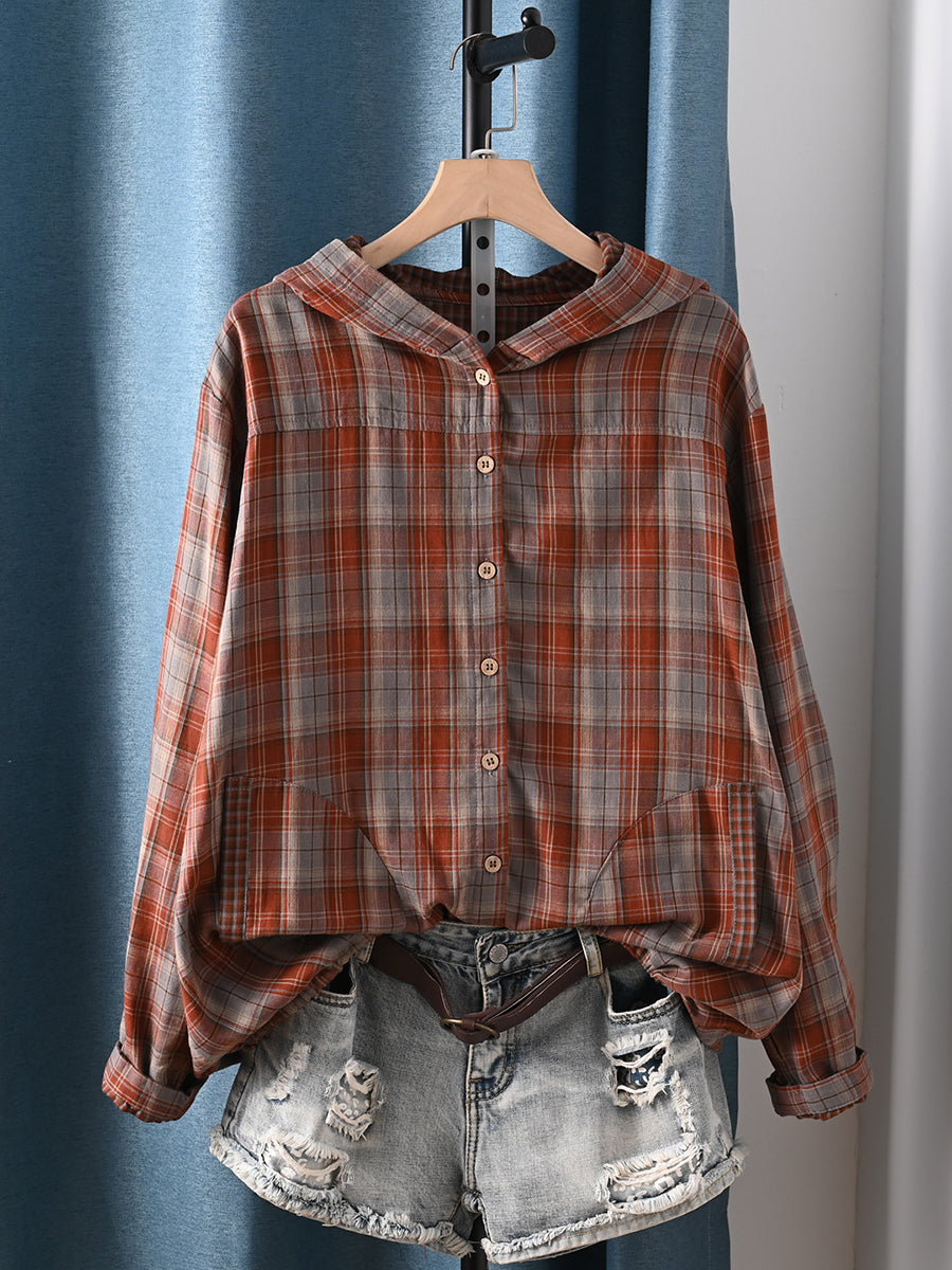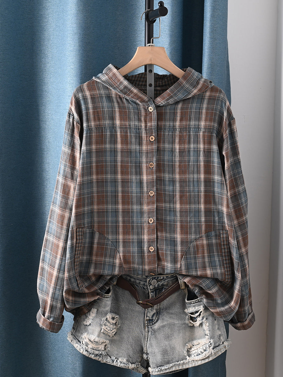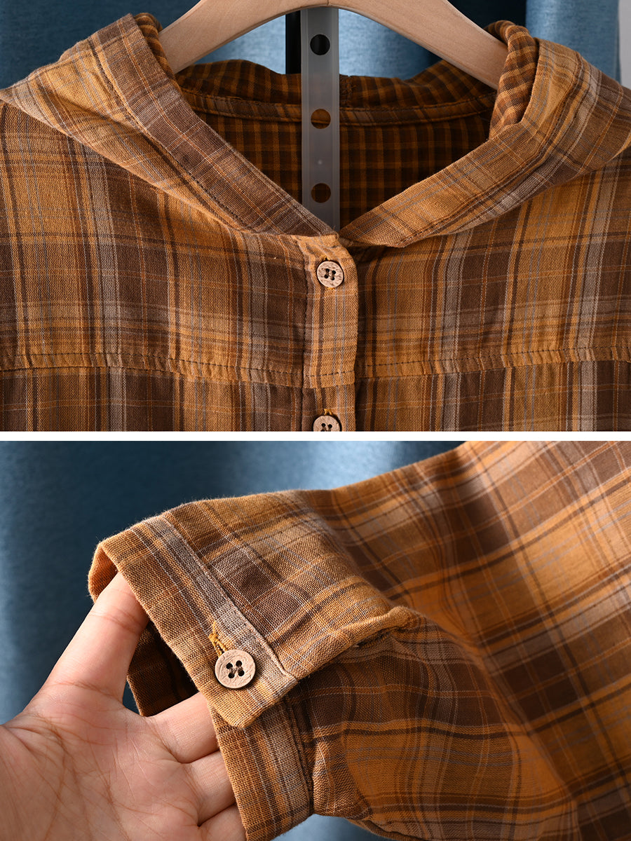 Women Autumn Artsy Plaid Hooded 100%Cotton Blouse