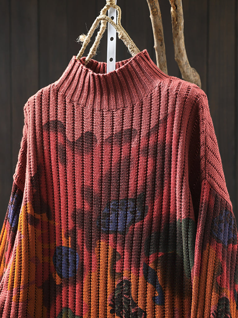 Women Autumn Artsy Flower Half-Turtleneck Sweater