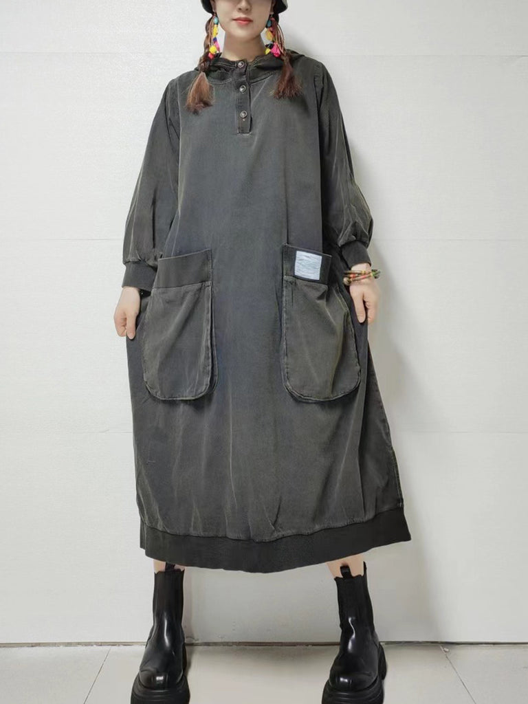 Women Autumn Retro Pure Color Denim Hooded Dress