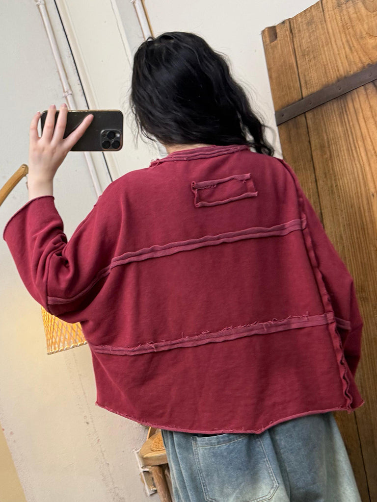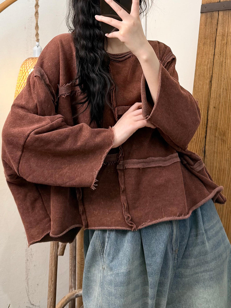 Women Autumn Retro Pure Color Spliced Cotton O-Neck Blouse