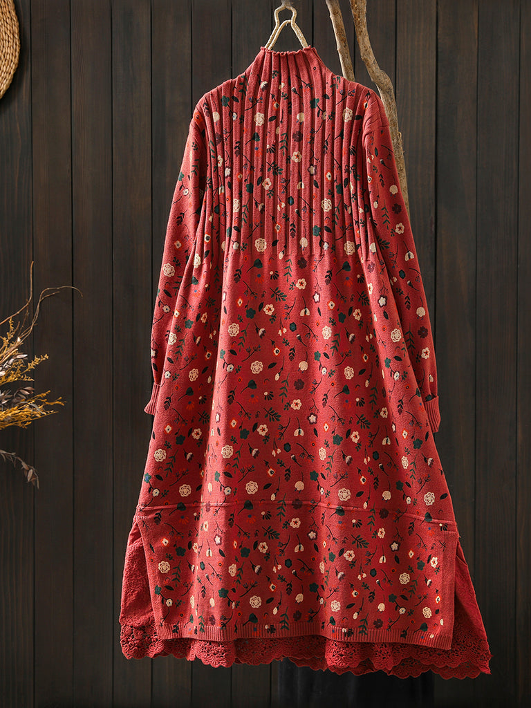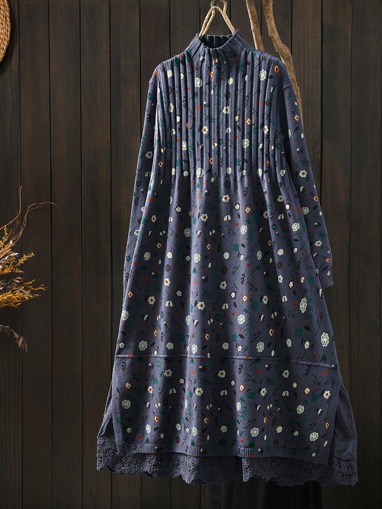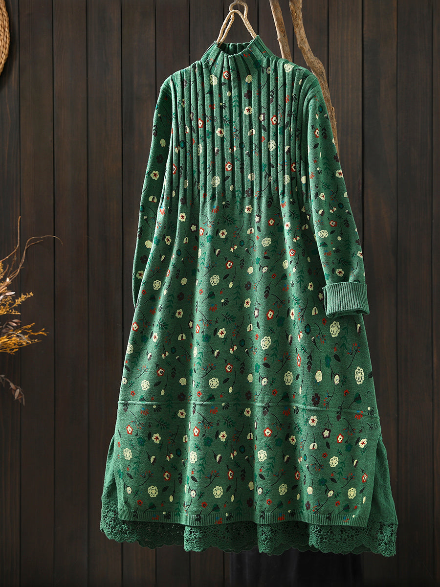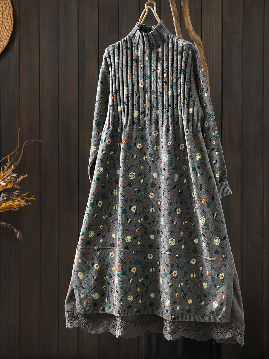 Women Autumn Vintage Floral Half-Turtleneck Knitted Dress