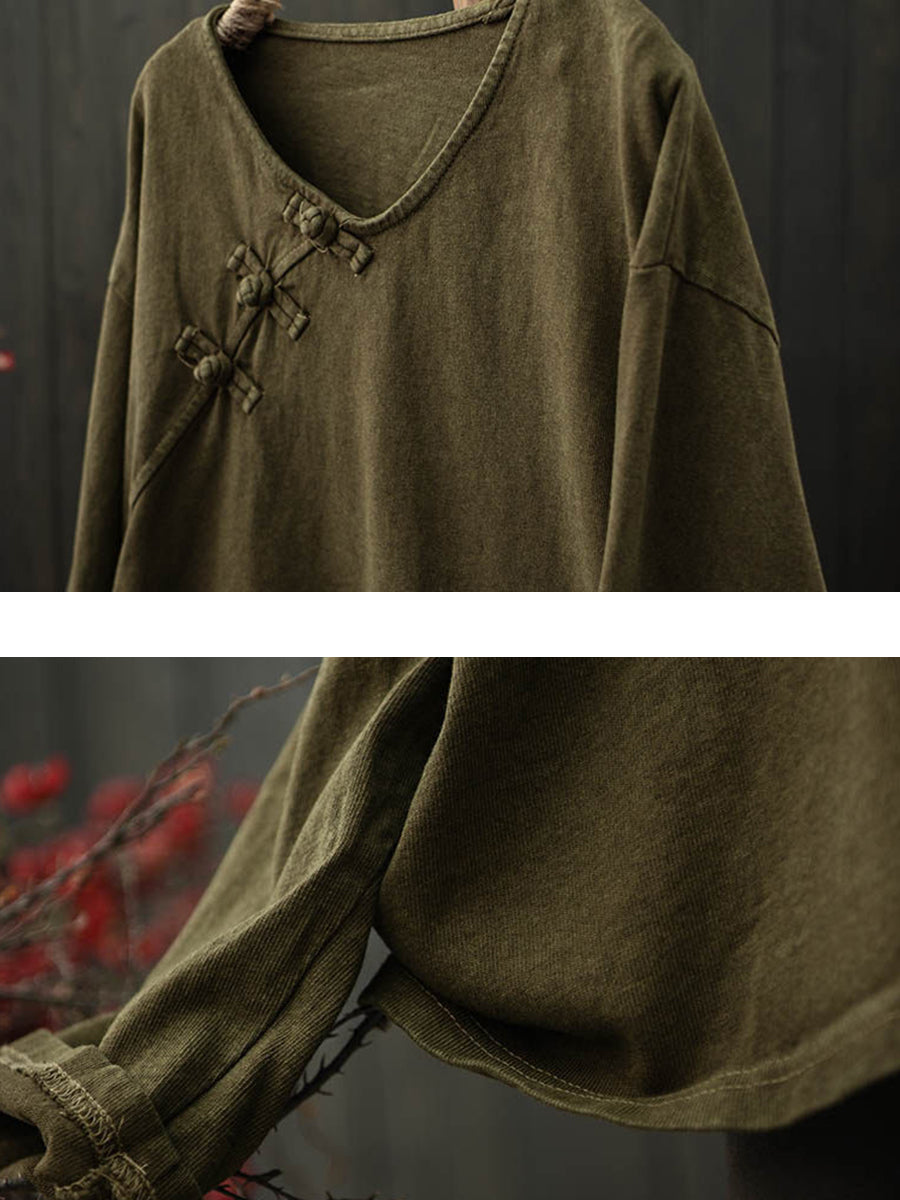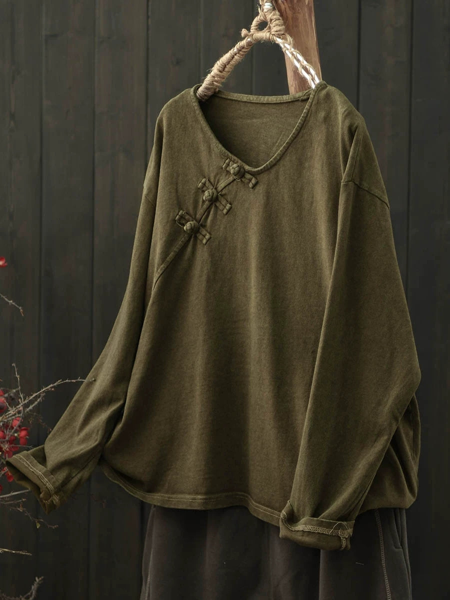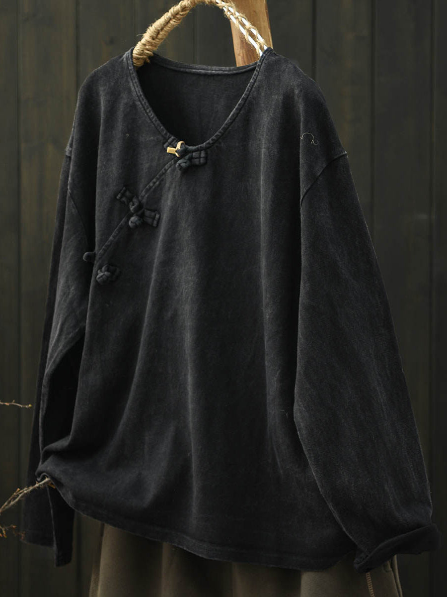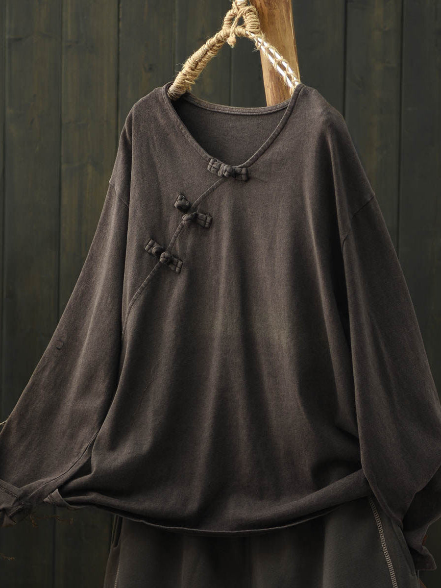 Women Ethnic Spring Pure Color Cotton O-Neck Shirt