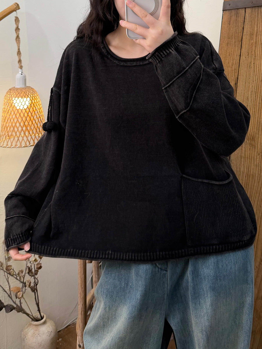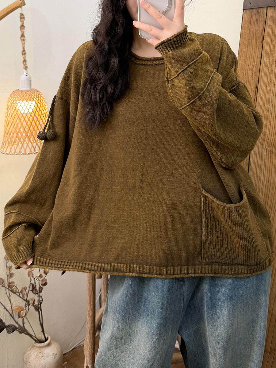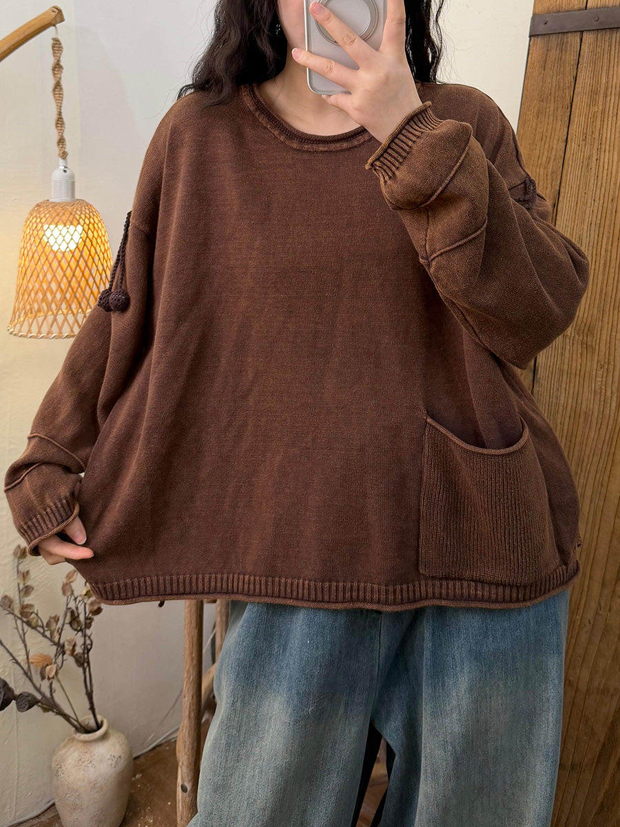 Women Retro Autumn Pure Color Pocket Cotton Blouse