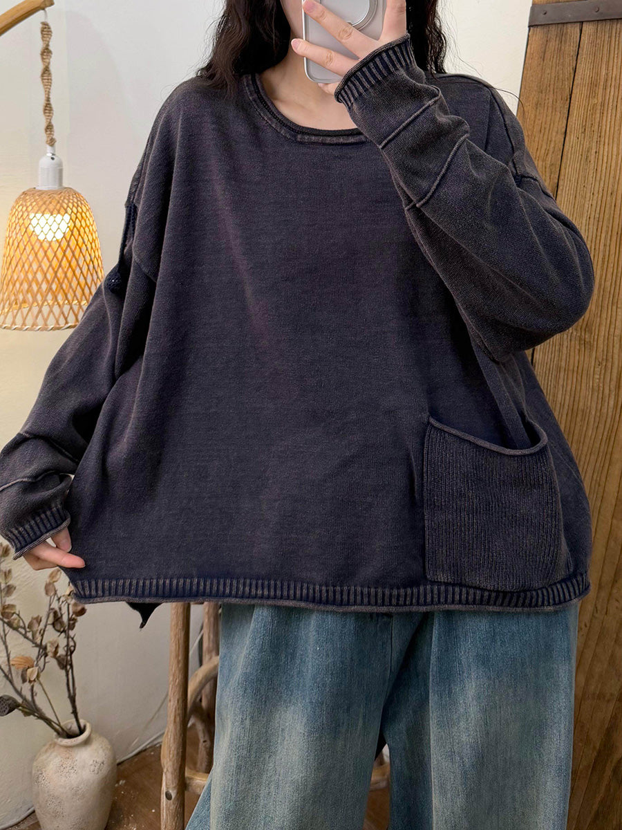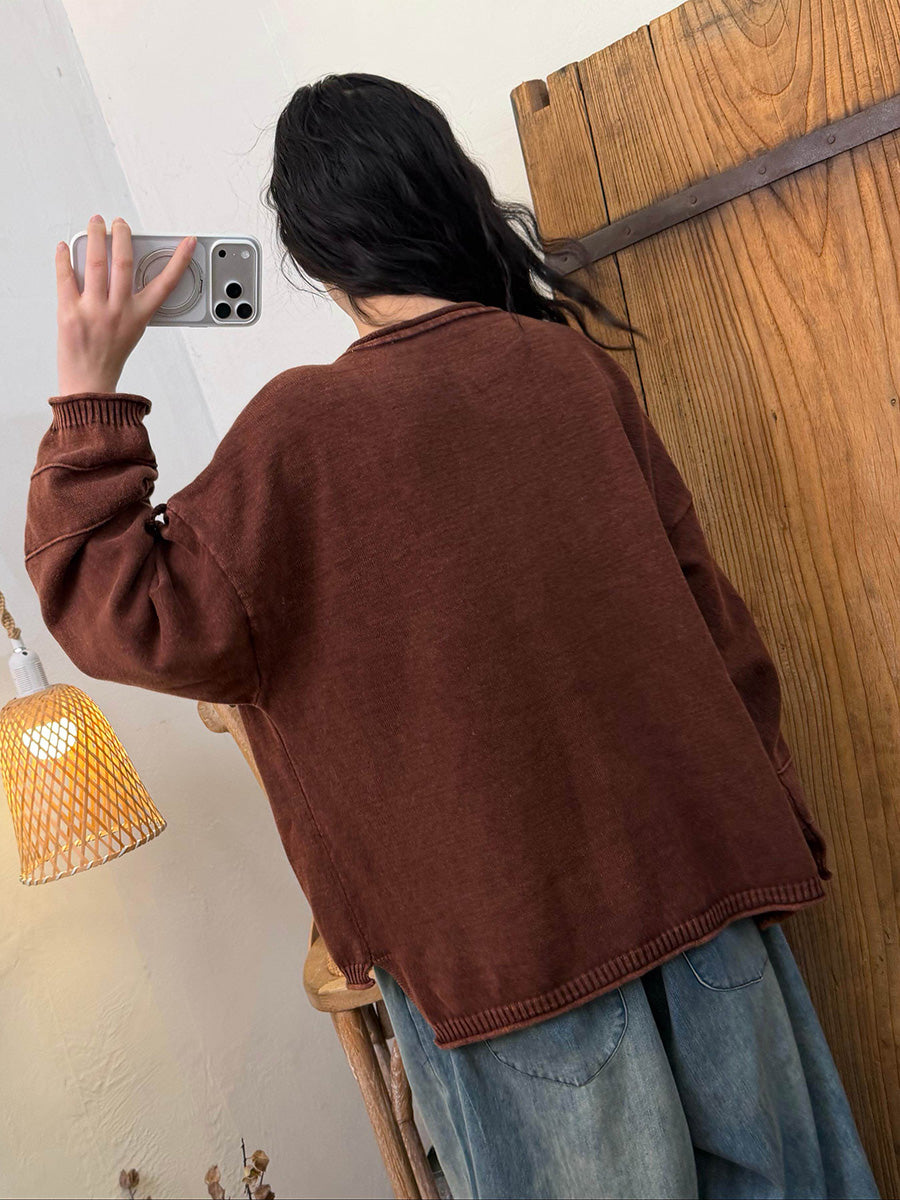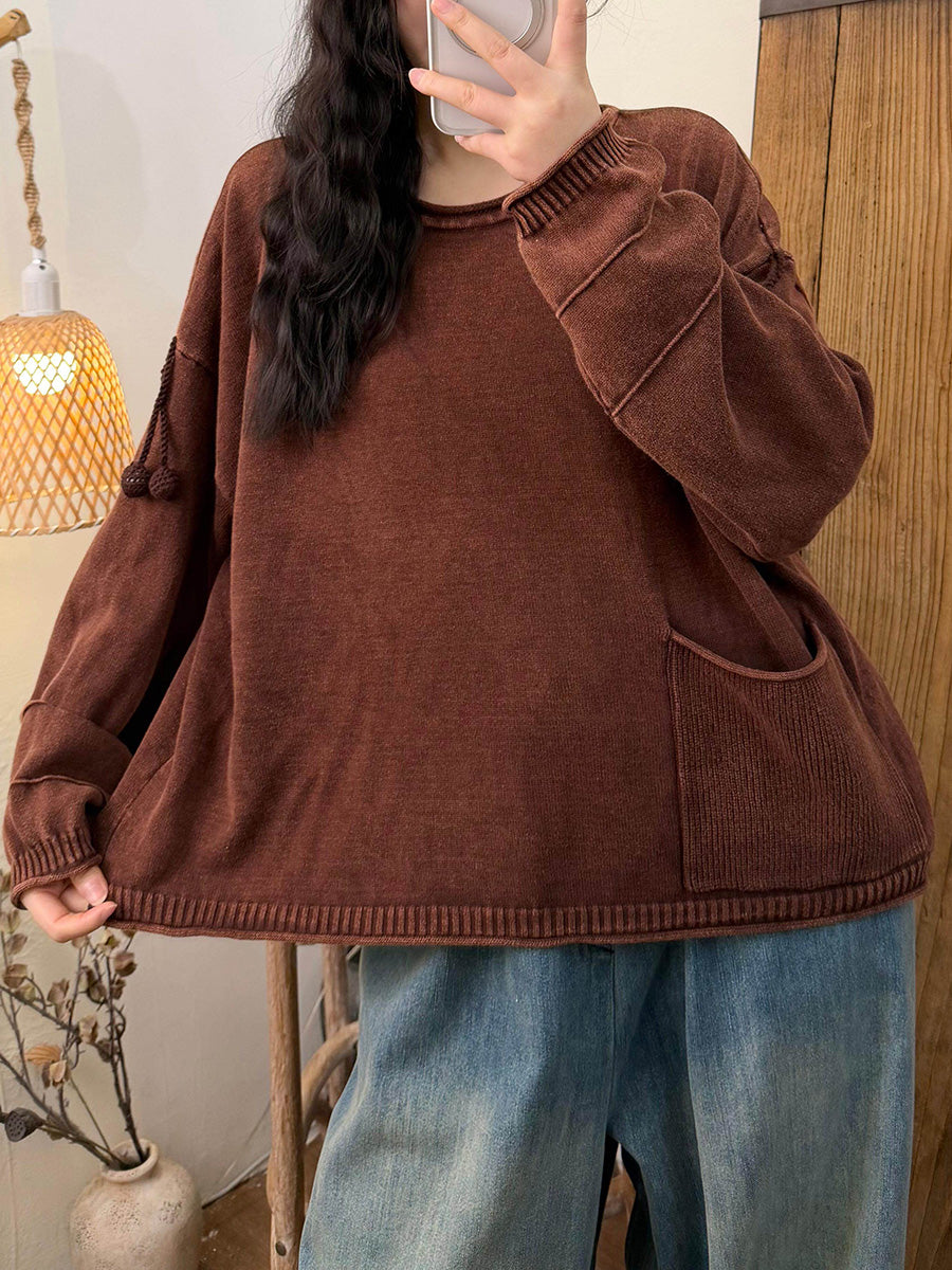 Women Retro Autumn Pure Color Pocket Cotton Blouse