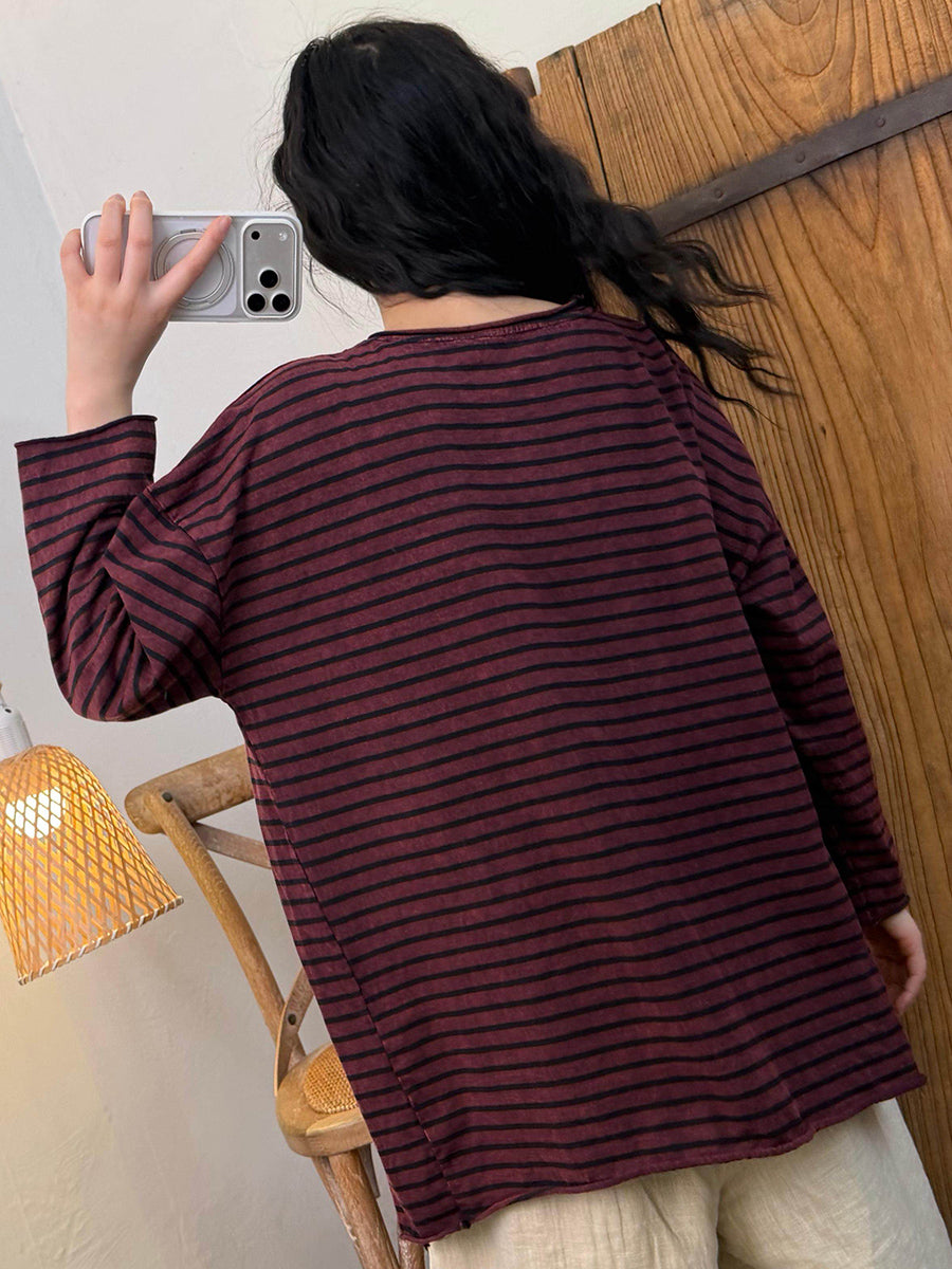 Women Retro Spring Stripe Side Split O-Neck Blouse
