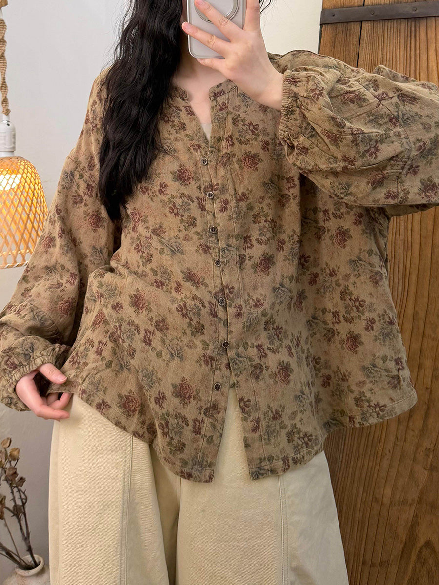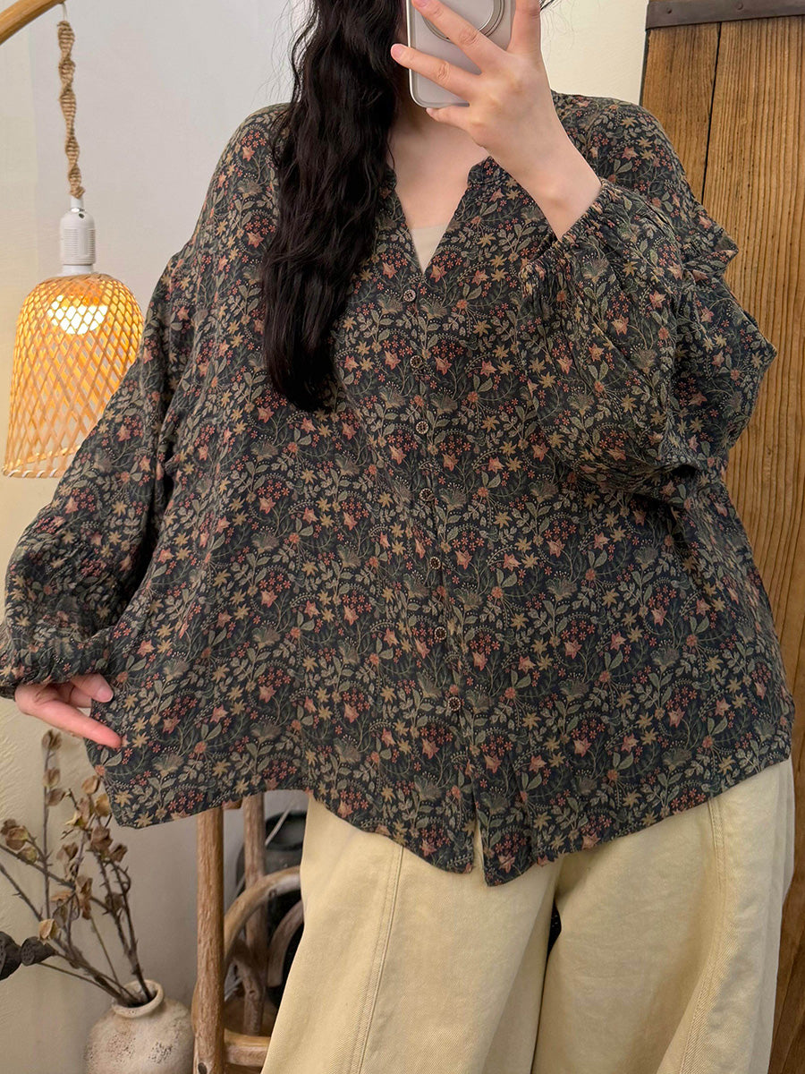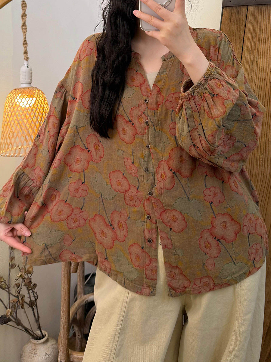 Women Spring Artsy Flower V-Neck Cotton Shirt