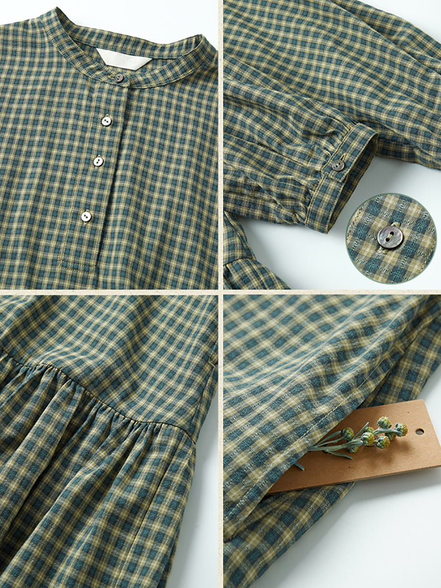 Women Spring Artsy Plaid 100%Cotton O-Neck Dress