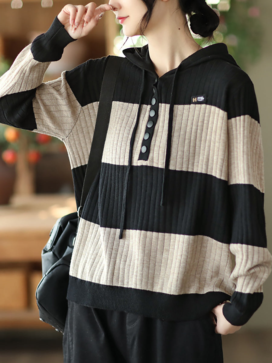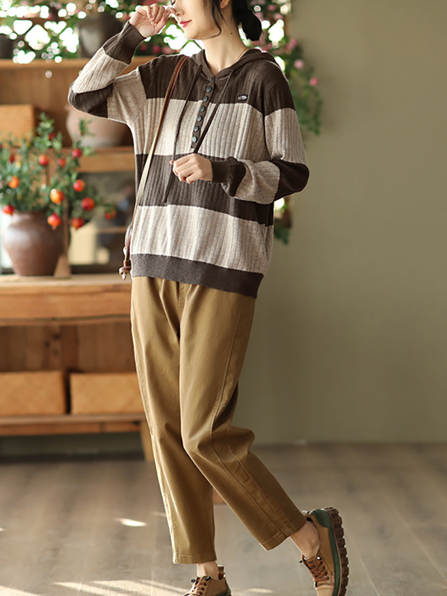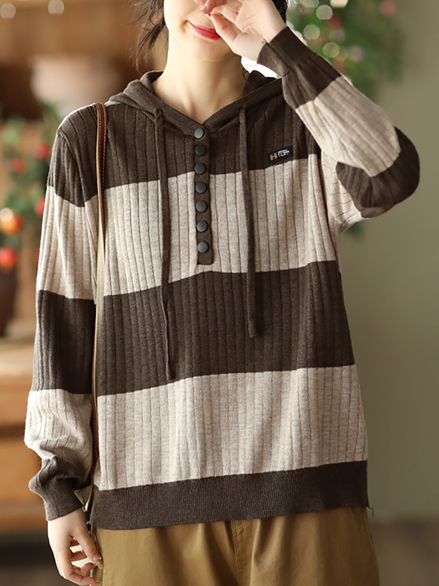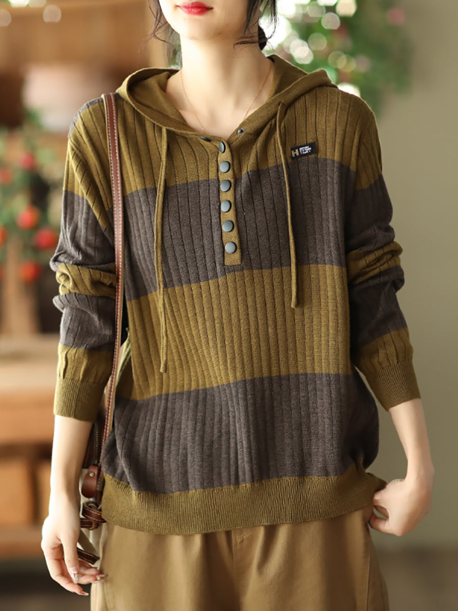 Women Spring Casual Stripe Button Loose Hooded Shirt