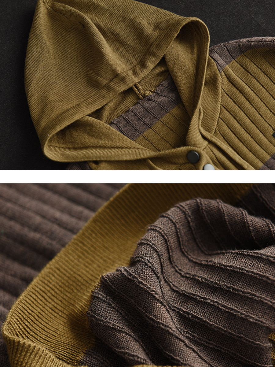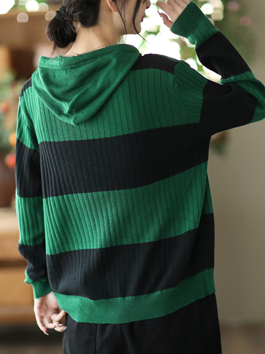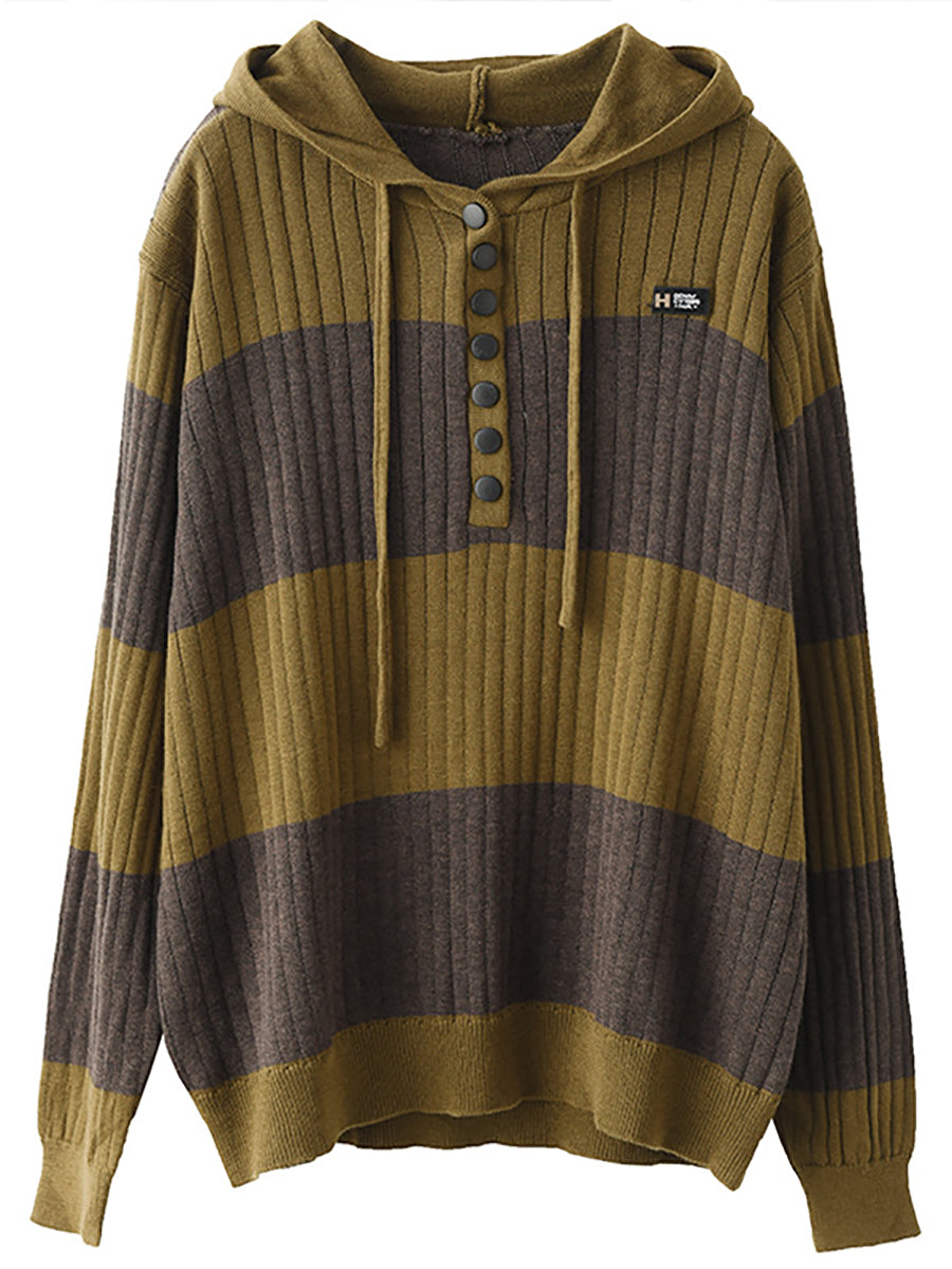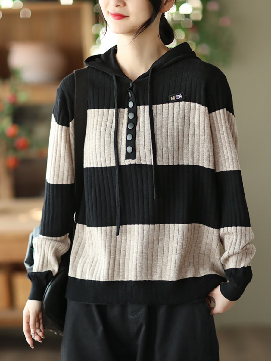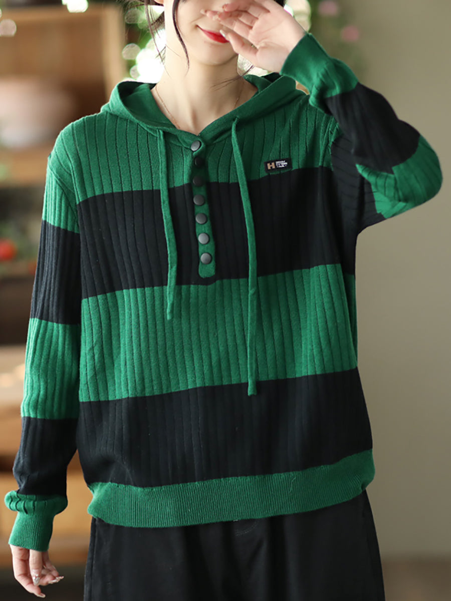 Women Spring Casual Stripe Button Loose Hooded Shirt