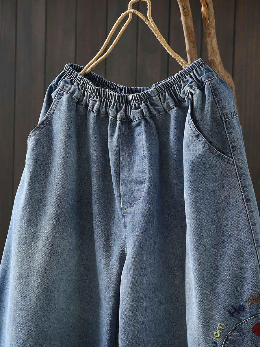 Women Spring Retro Embroidery Denim Wide-leg Pants