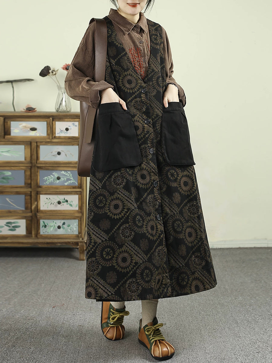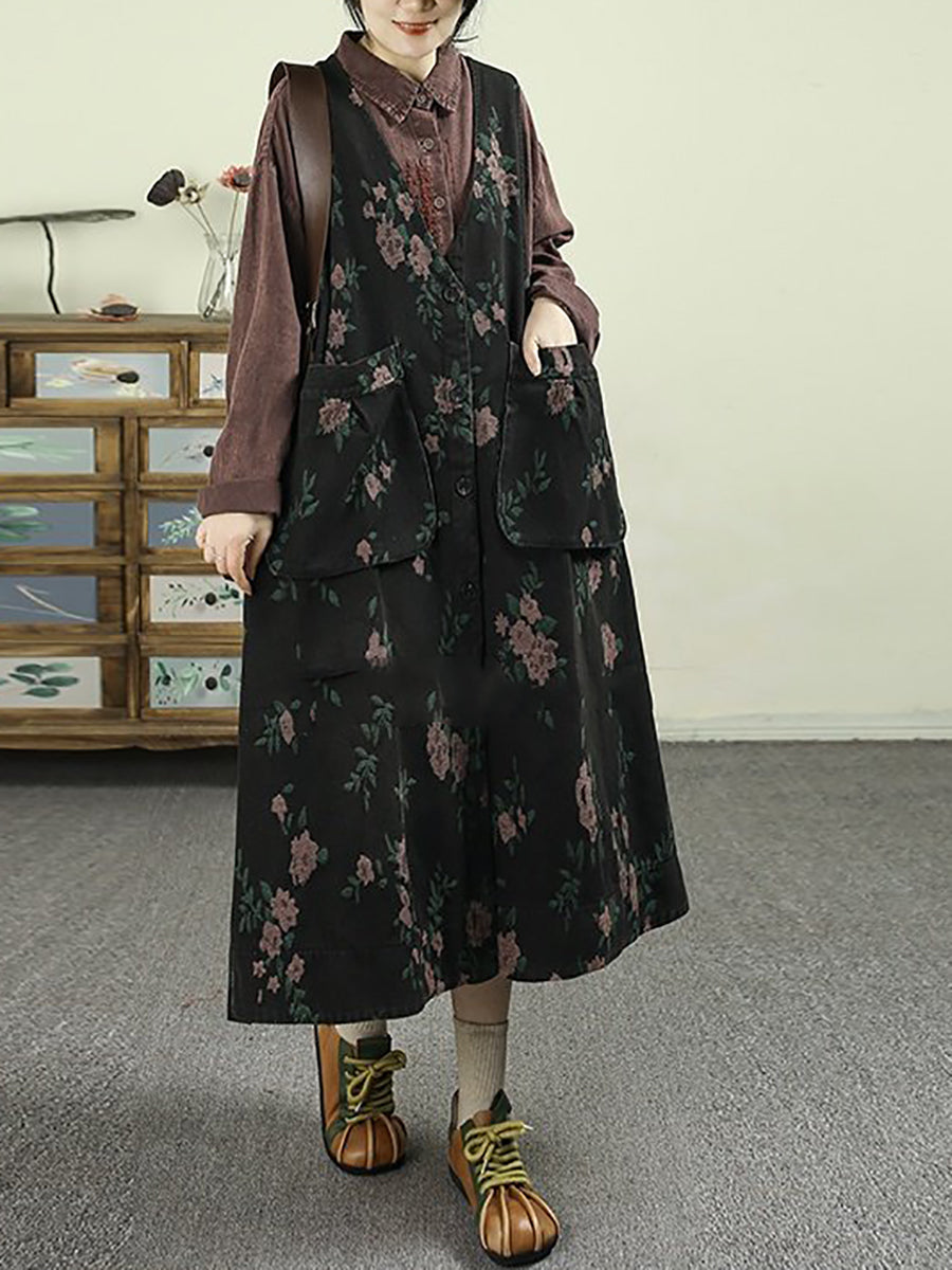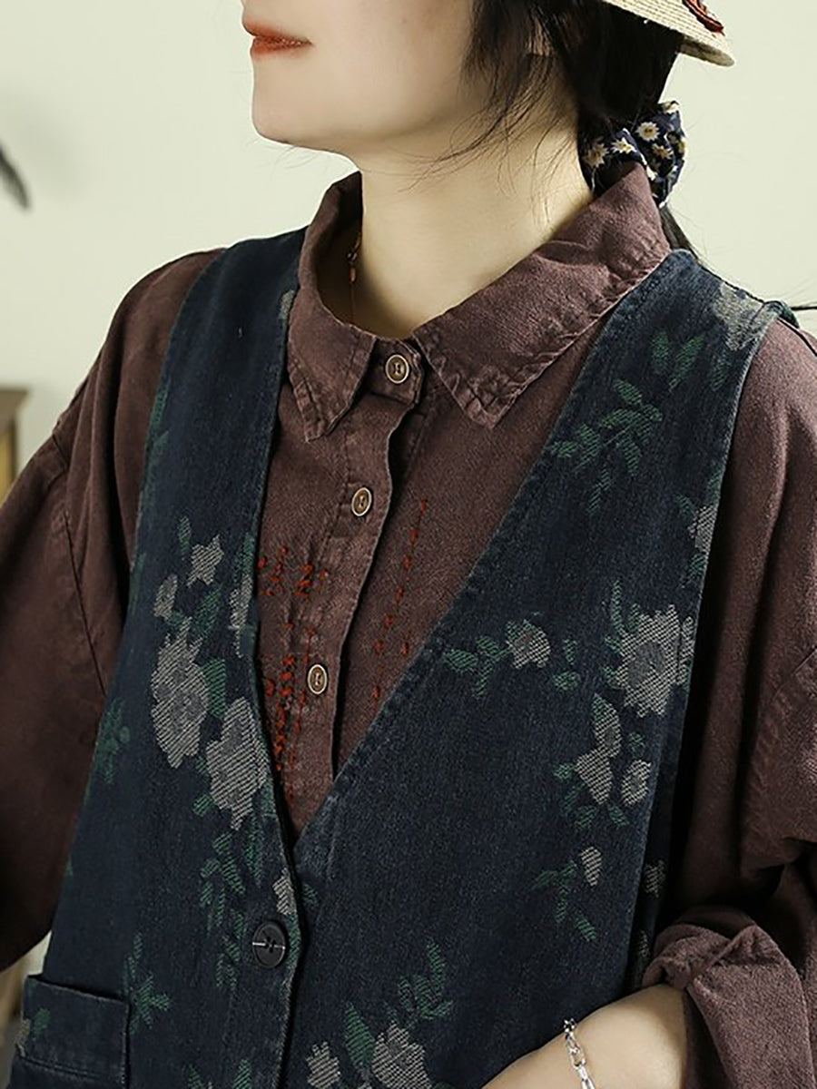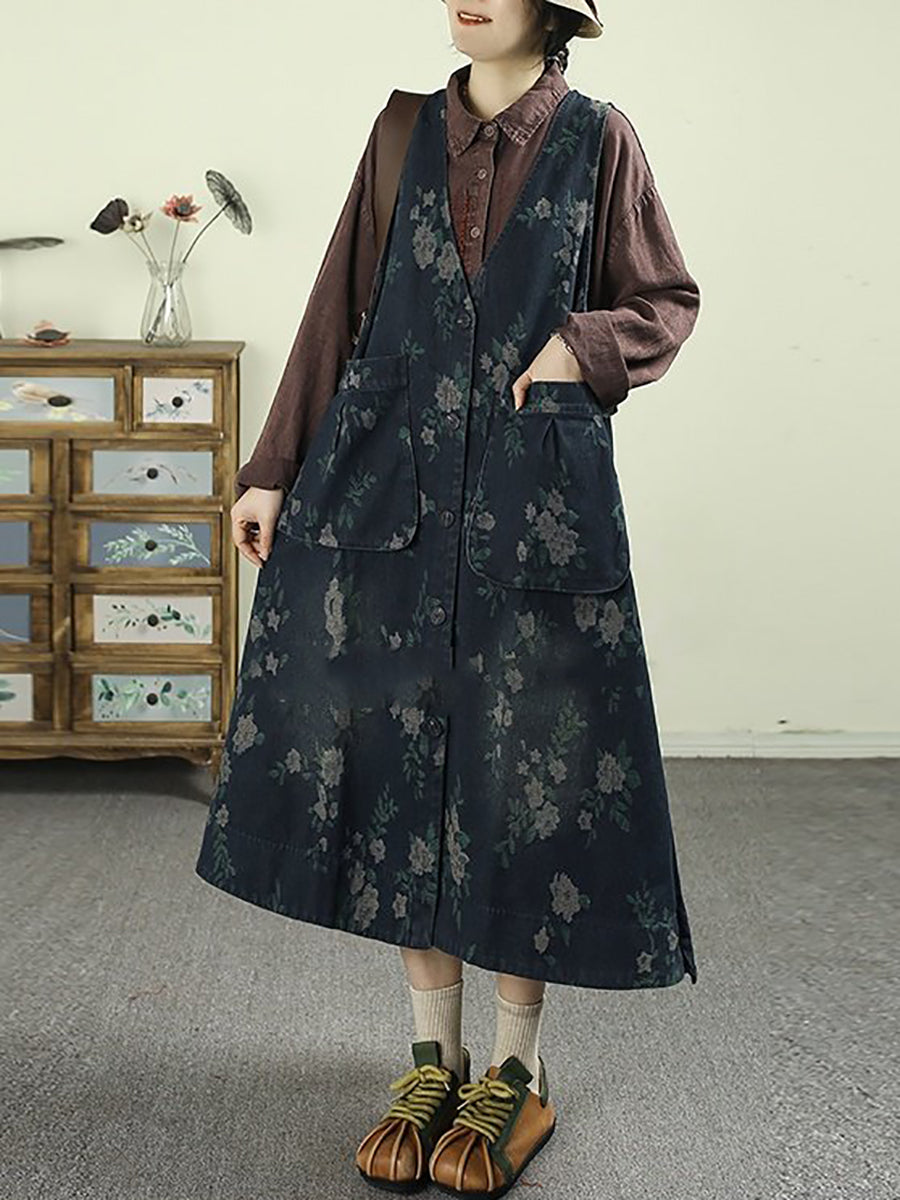 Women Spring Retro Floral Denim V-Neck Vest Dress