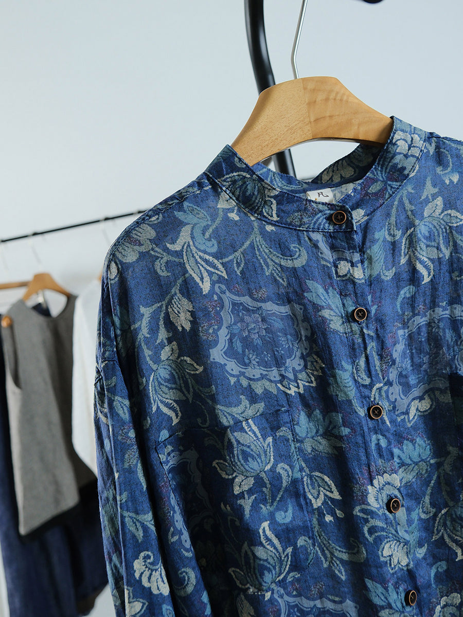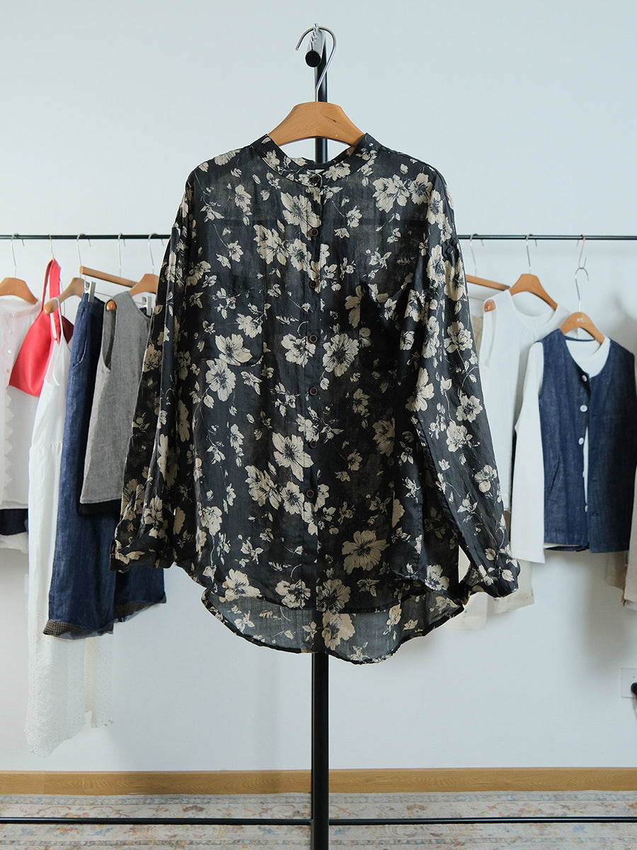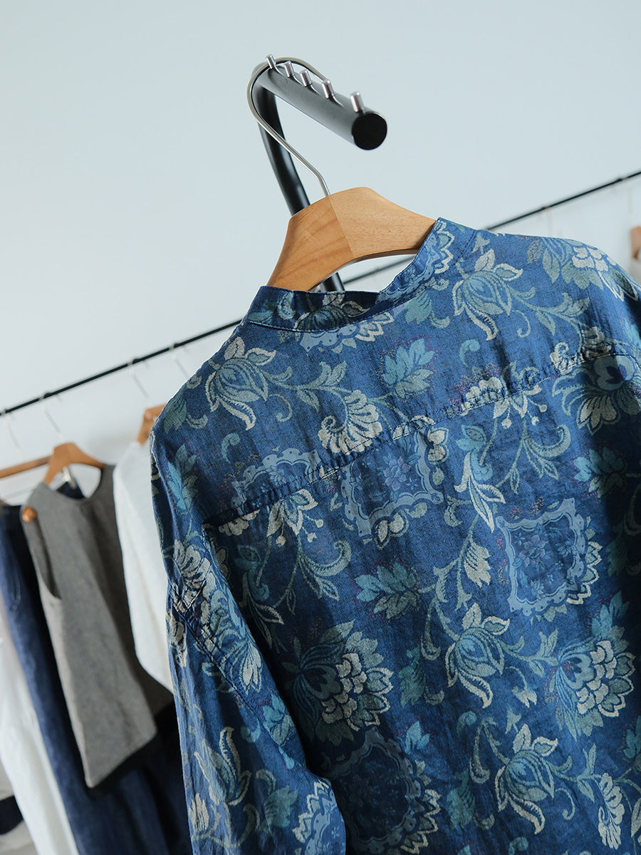 Women Spring Vintage Flower Linen Stand Collar Shirt
