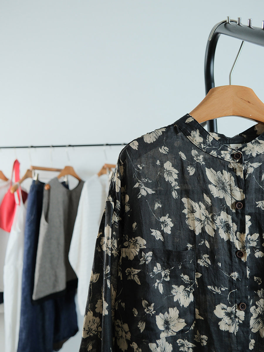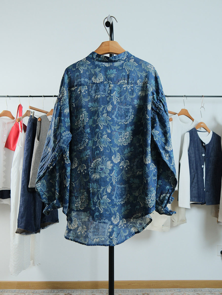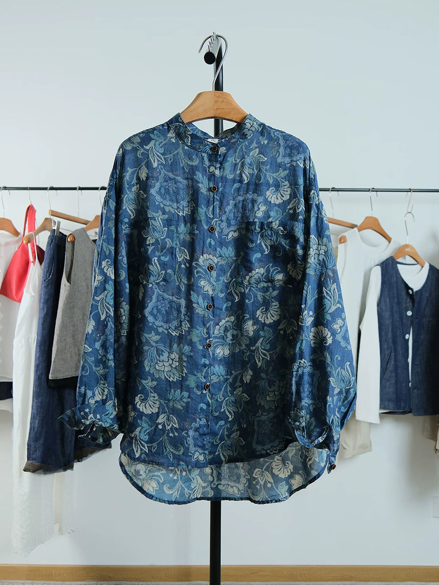 Women Spring Vintage Flower Linen Stand Collar Shirt