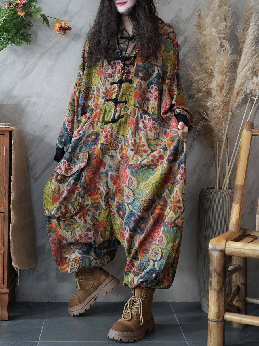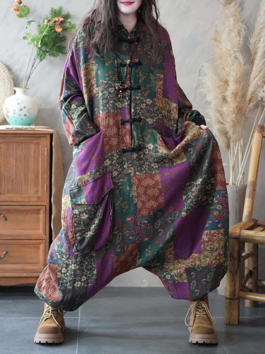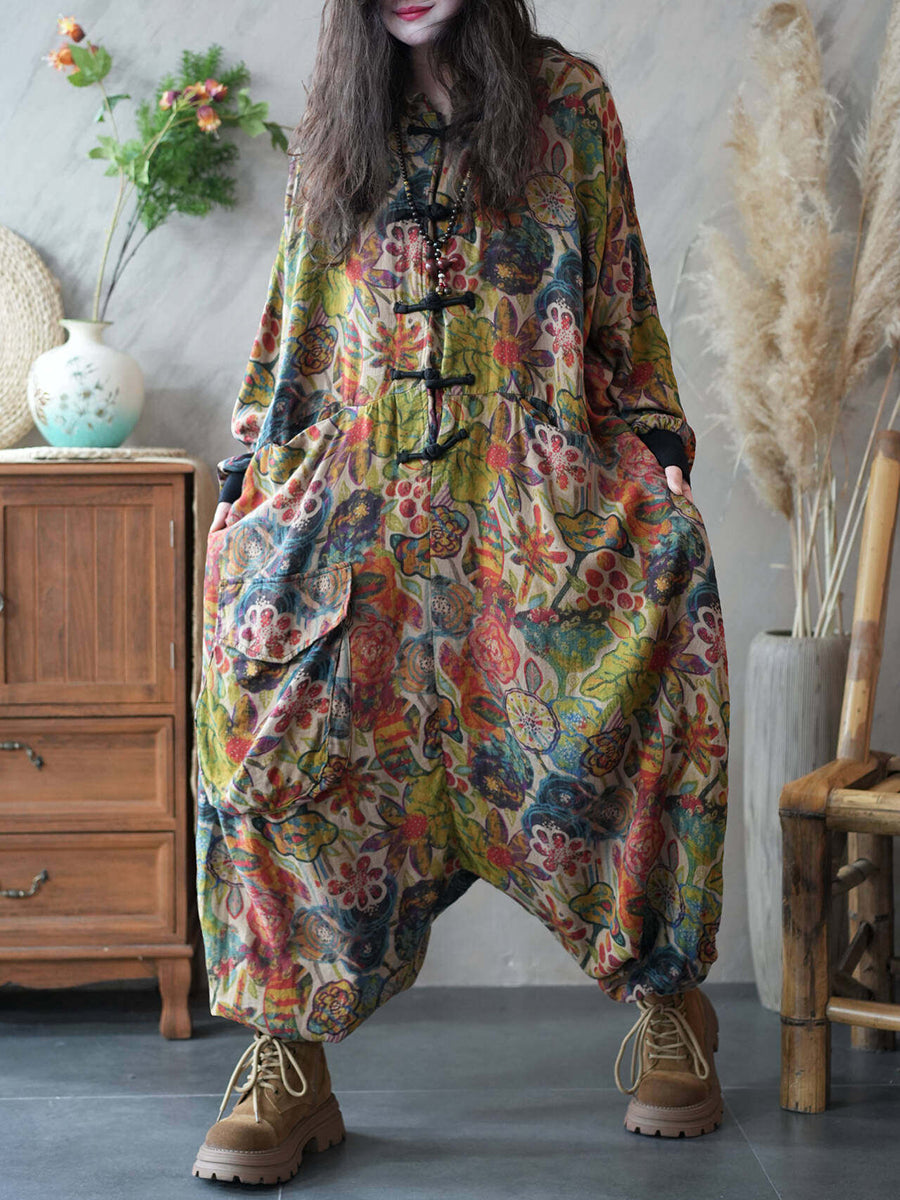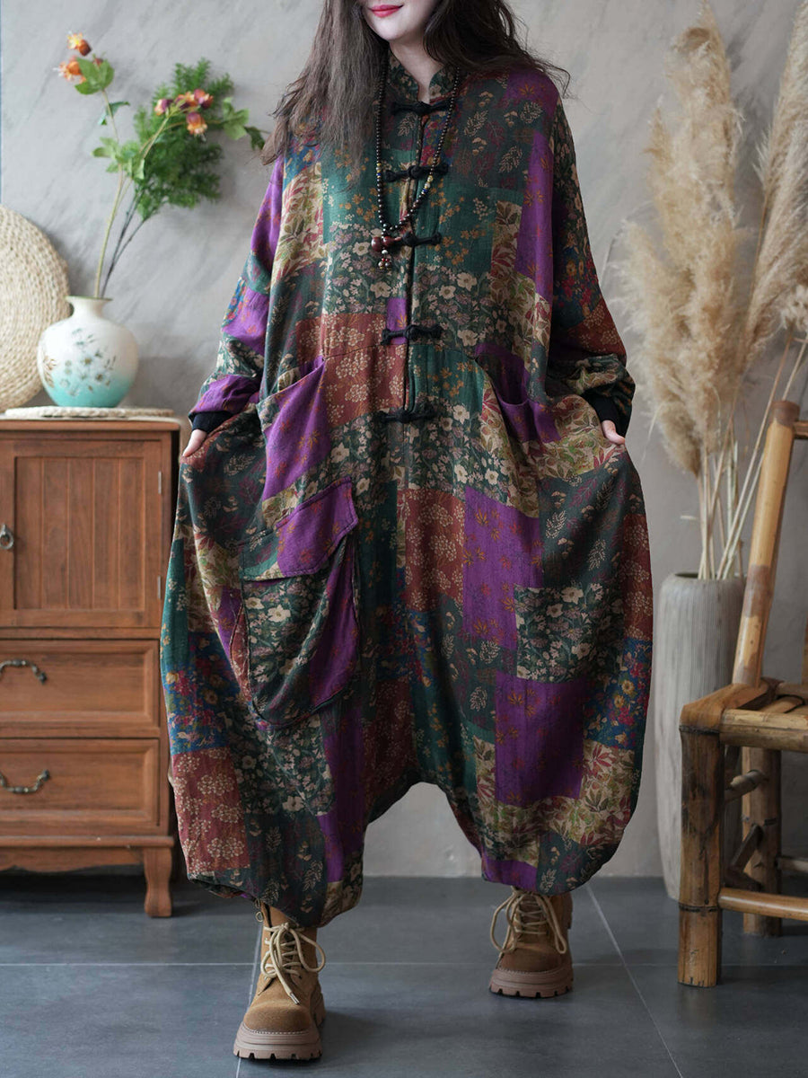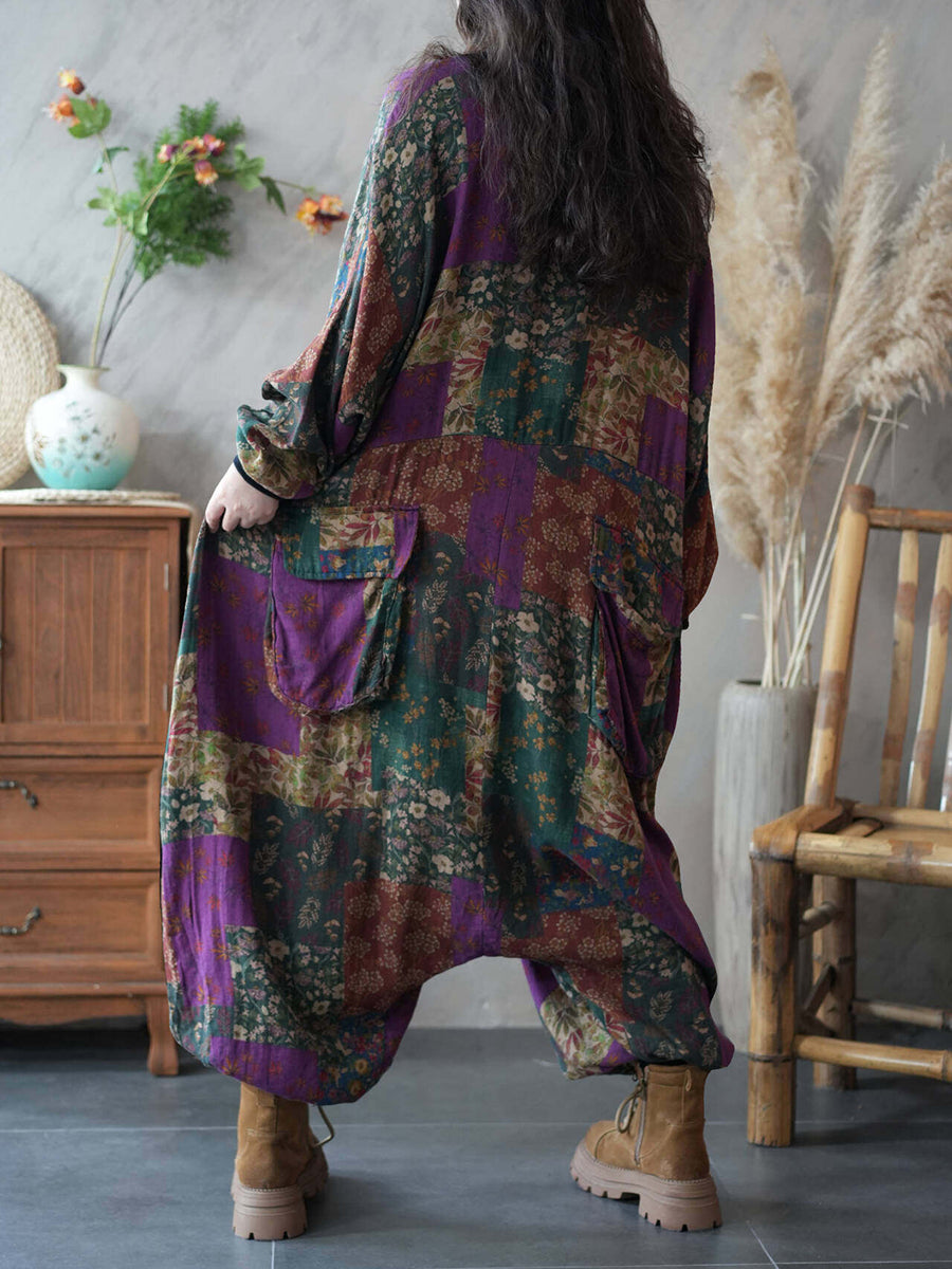 Women Spring Vintage Flower Patch Low Crotch Jumpsuits