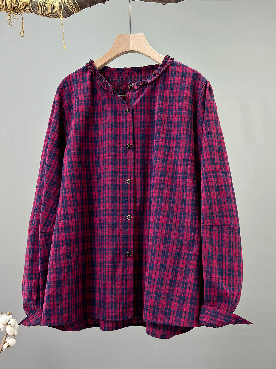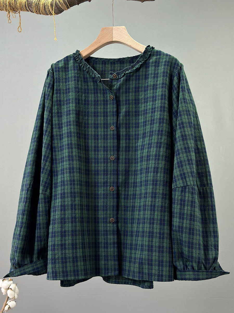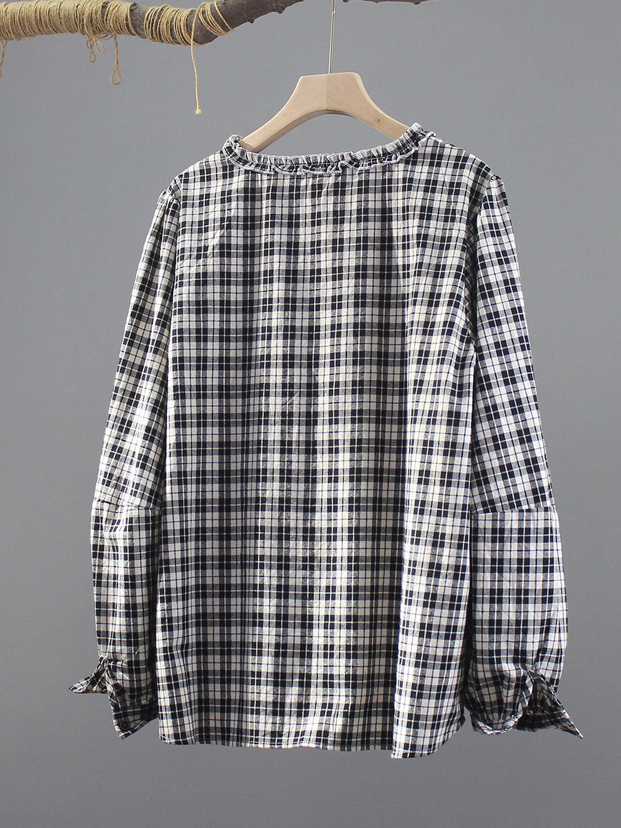 Women Spring Vintage Plaid O-Neck 100%Cotton Shirt
