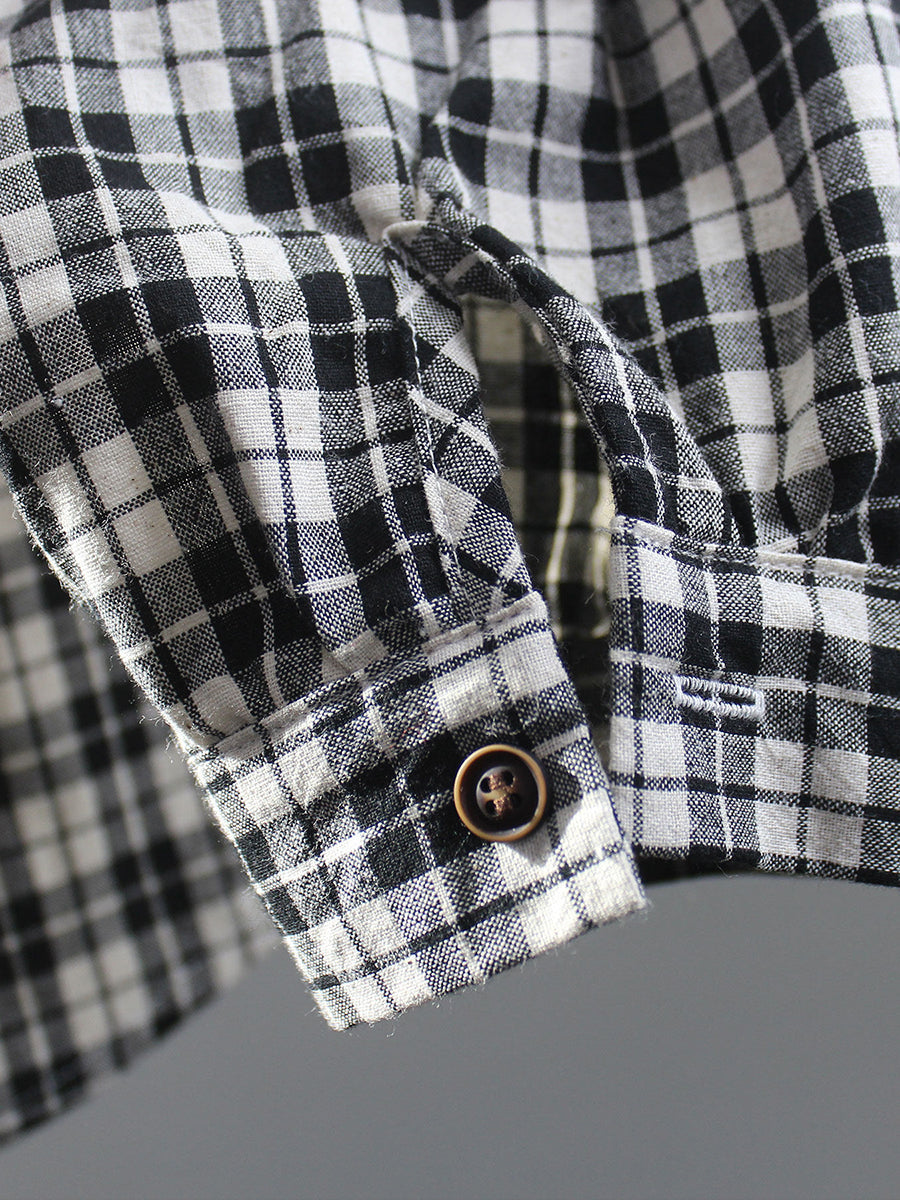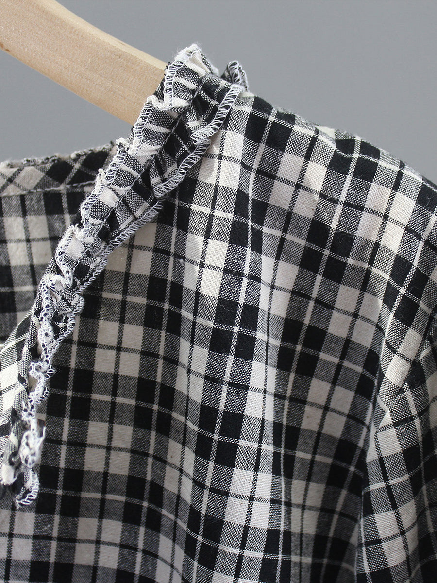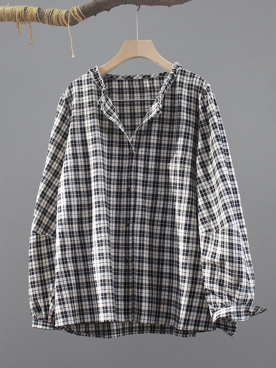 Women Spring Vintage Plaid O-Neck 100%Cotton Shirt