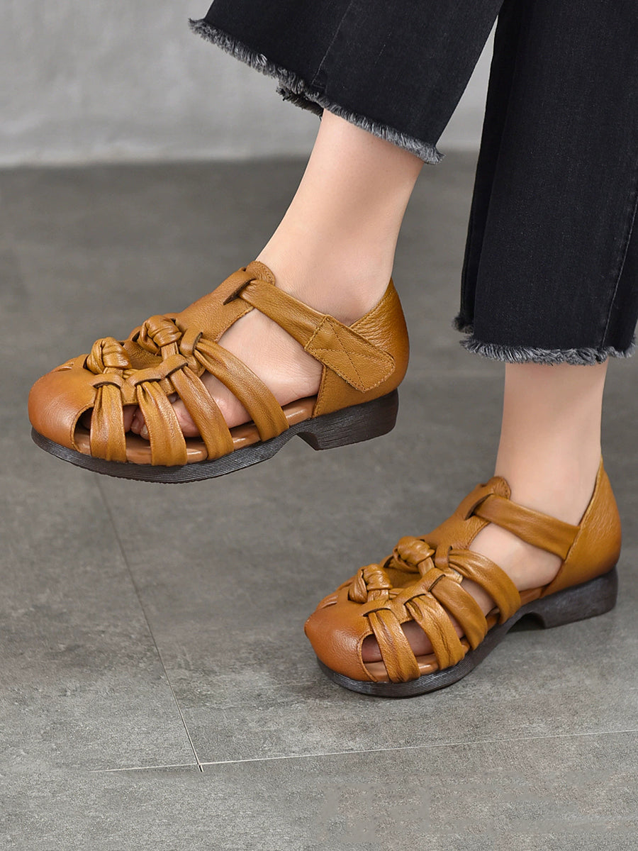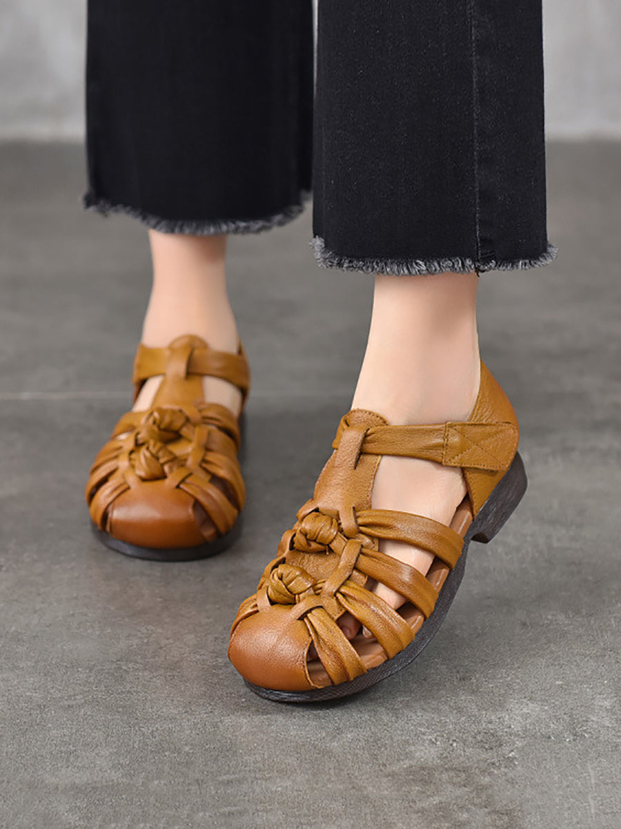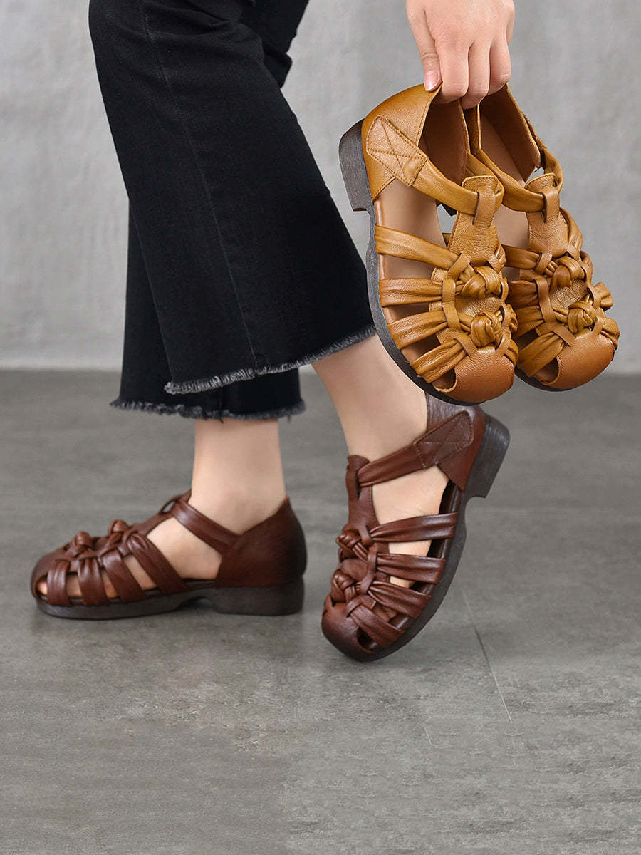 Women Summe Genuine Leather Weave Low Heel Sandals