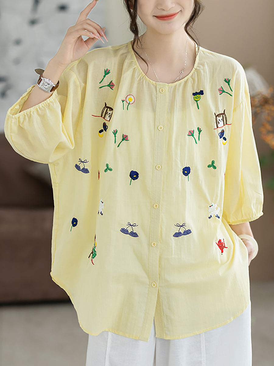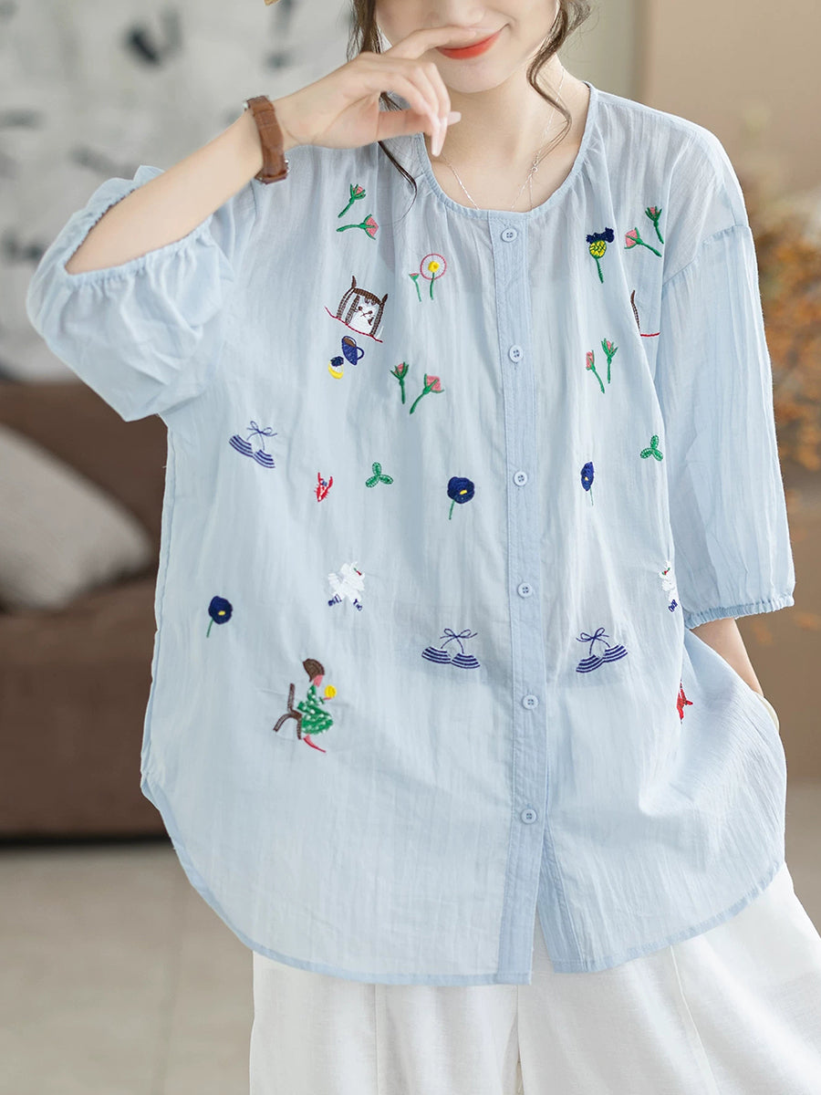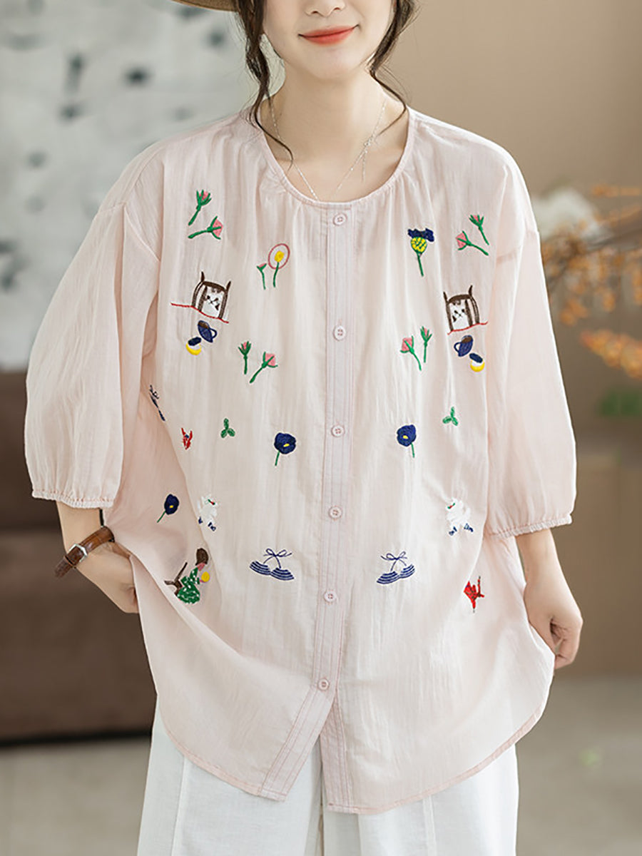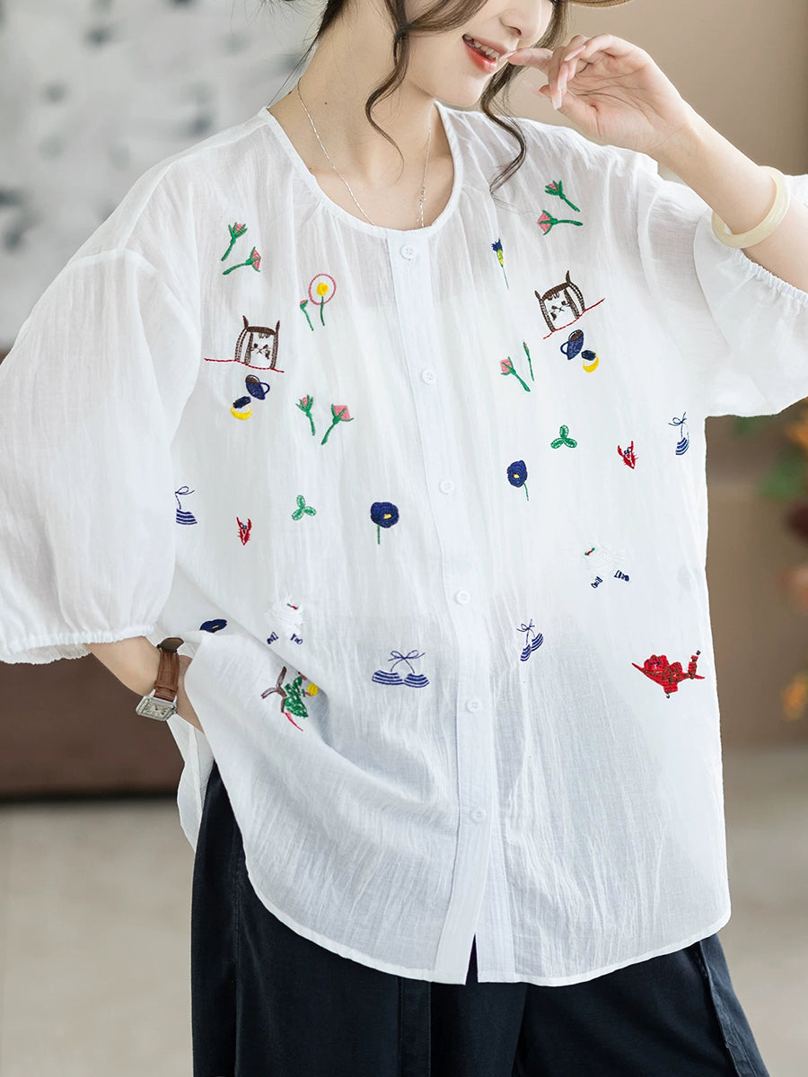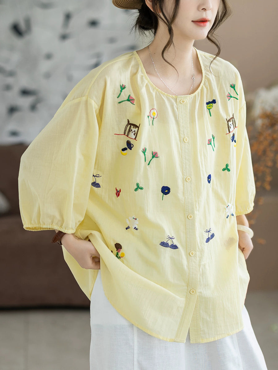 Women Summer Artsy Embroidery O-Neck 100%Cotton Blouse