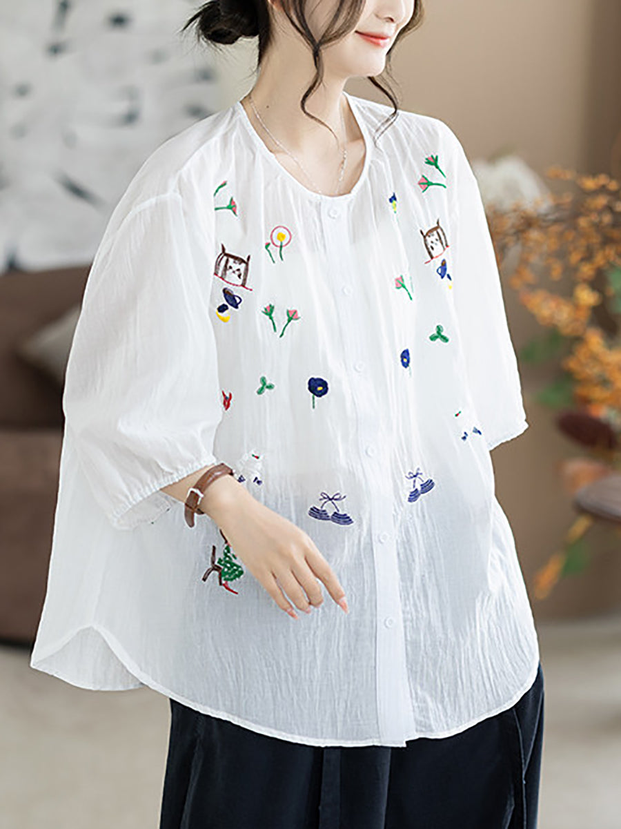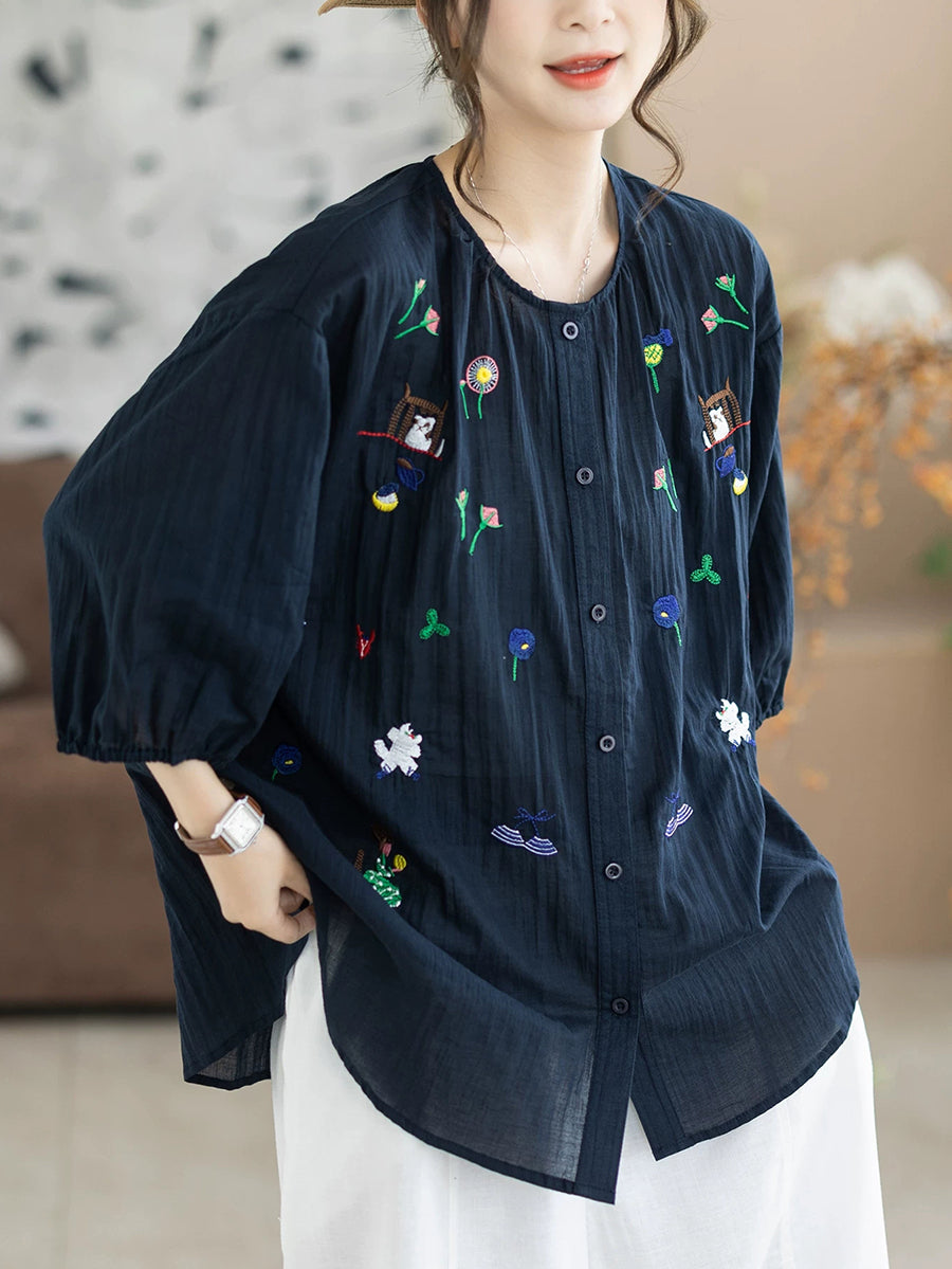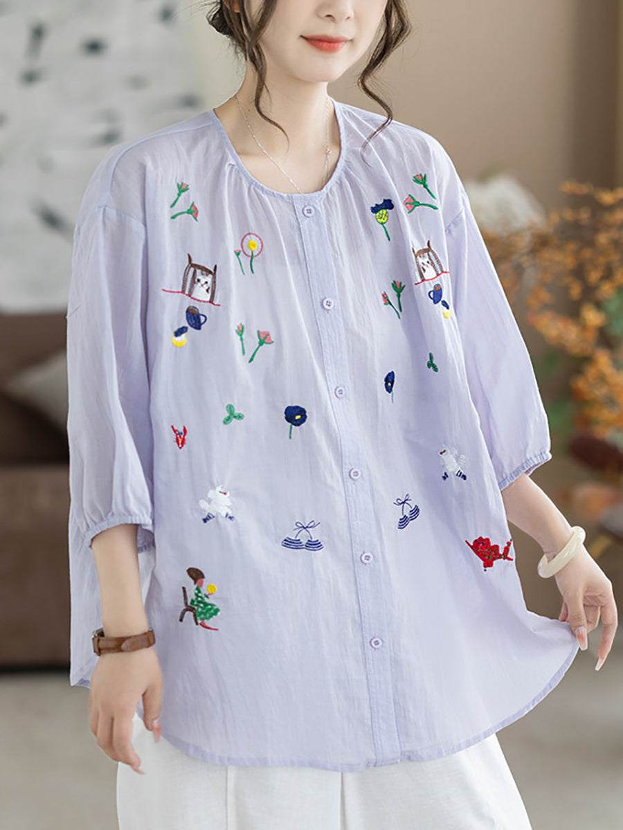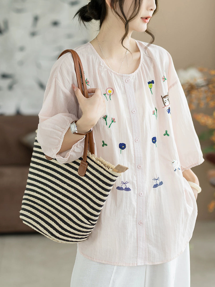 Women Summer Artsy Embroidery O-Neck 100%Cotton Blouse
