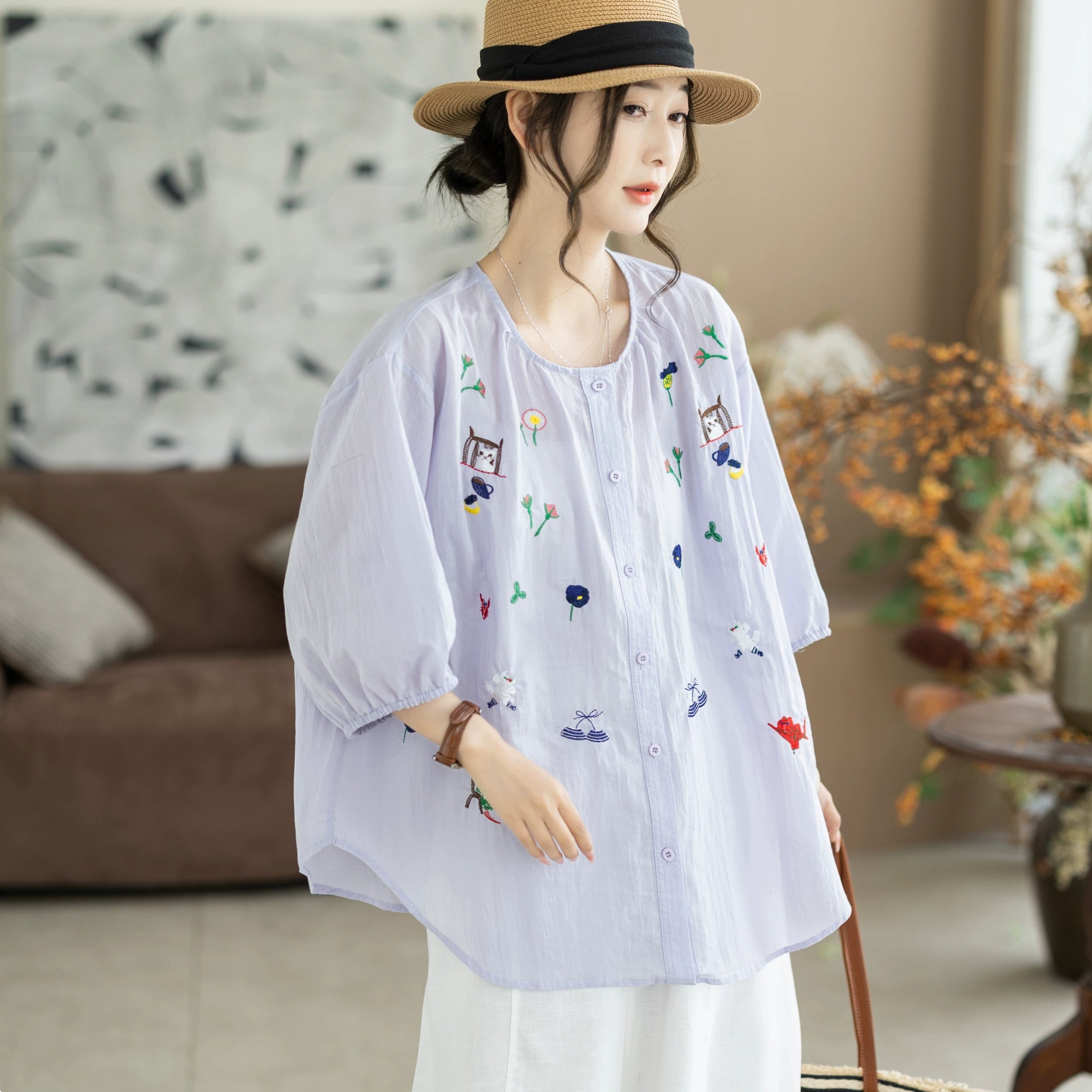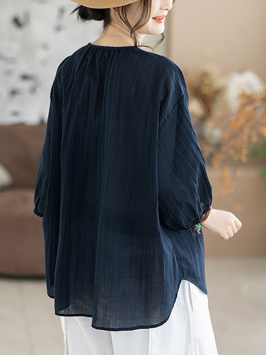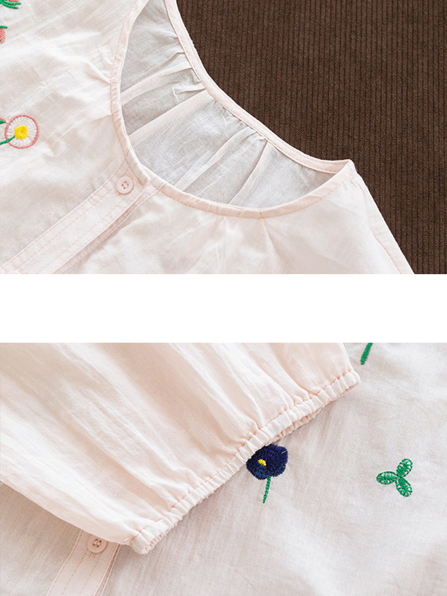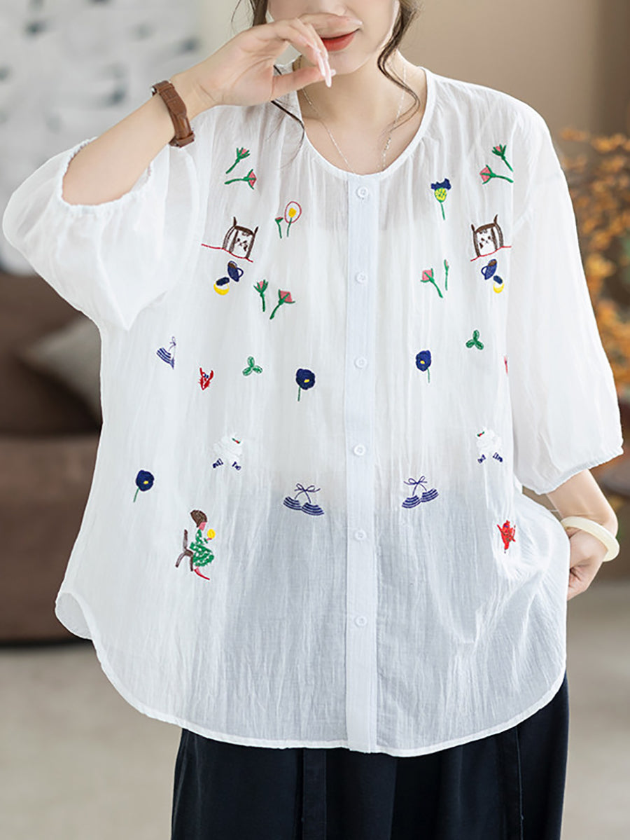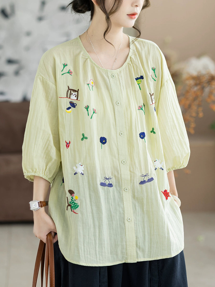 Women Summer Artsy Embroidery O-Neck 100%Cotton Blouse