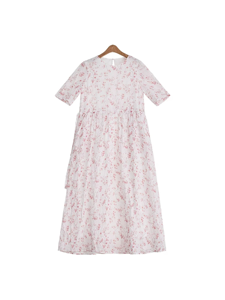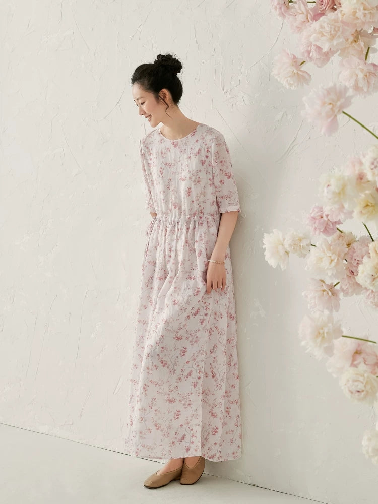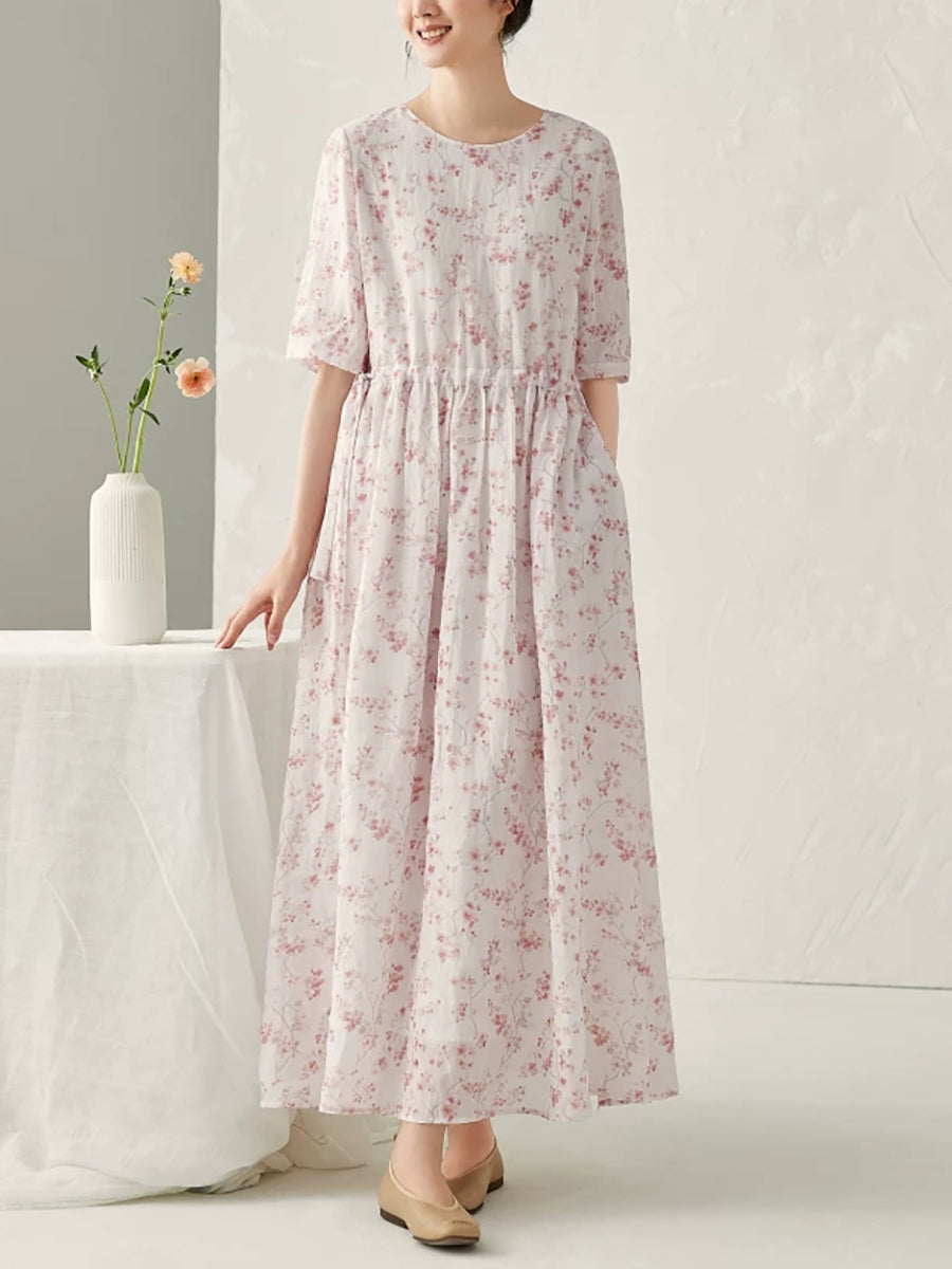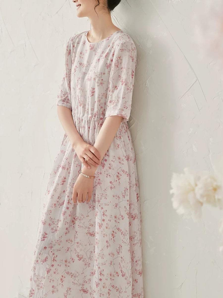 Women Summer Artsy Floral 100%Ramie O-Neck Dress
