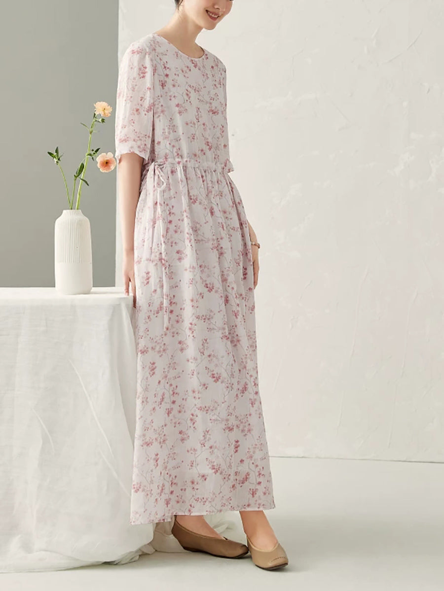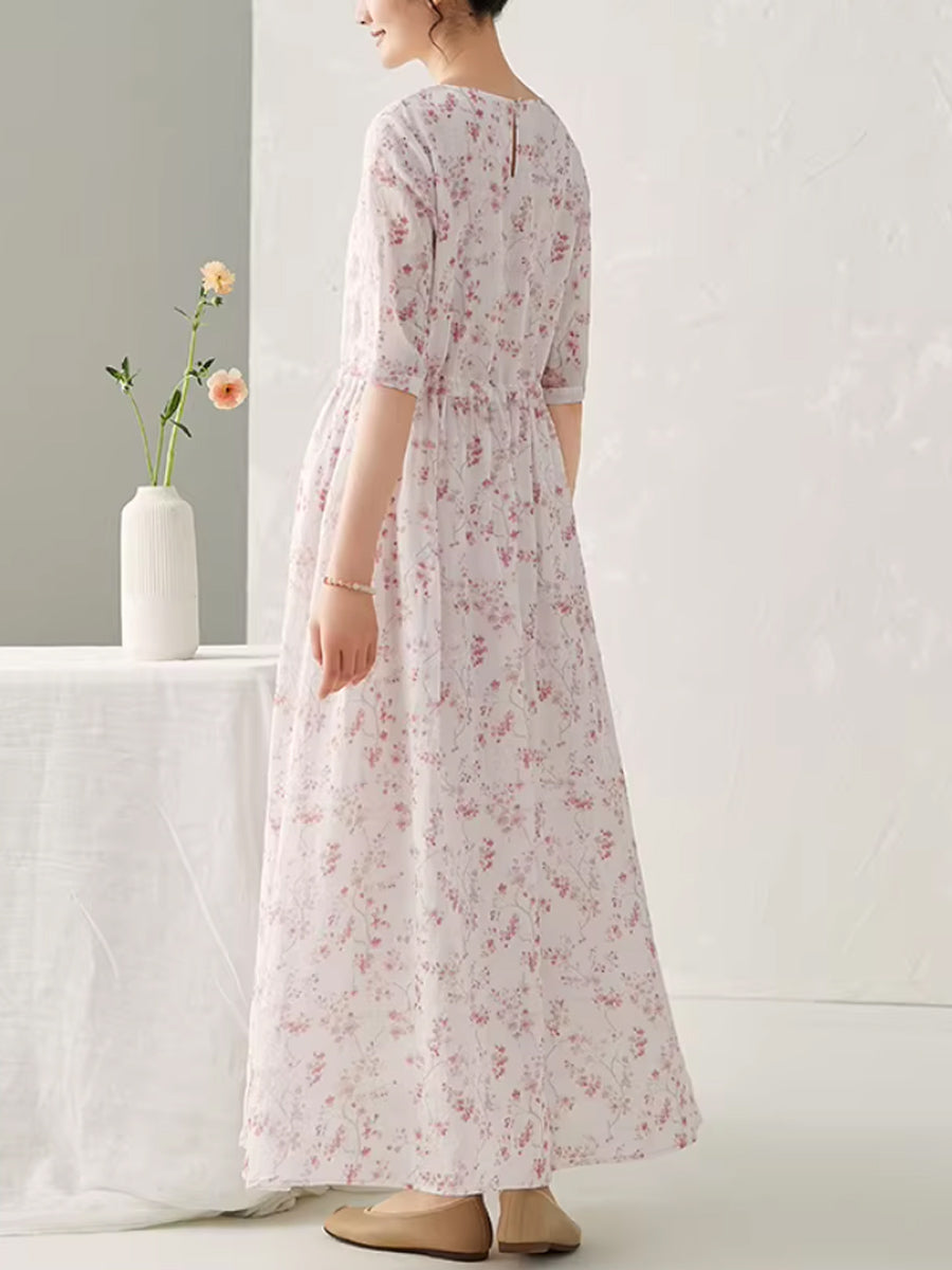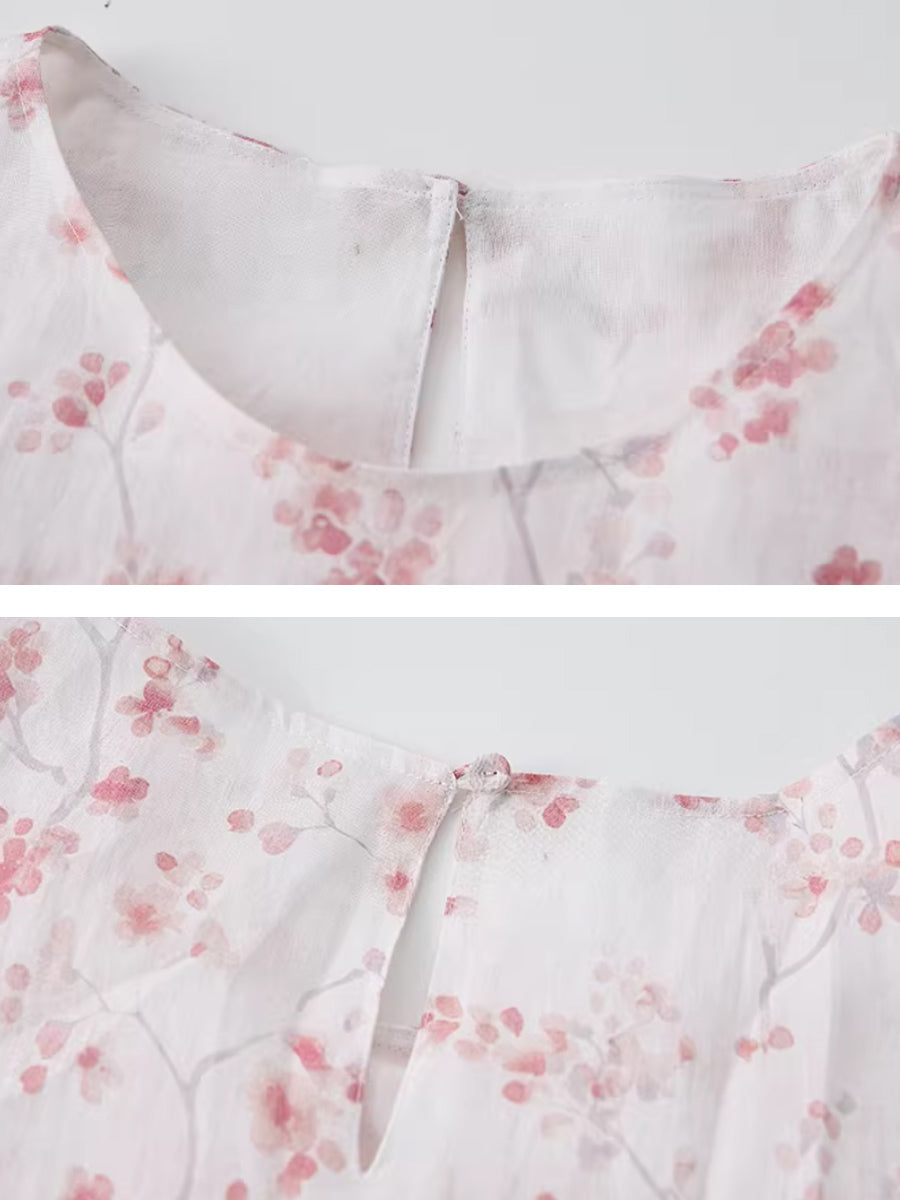 Women Summer Artsy Floral 100%Ramie O-Neck Dress