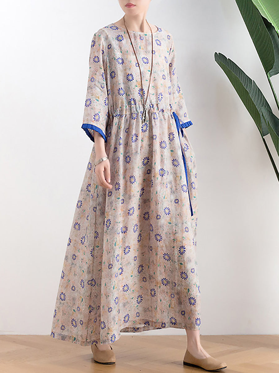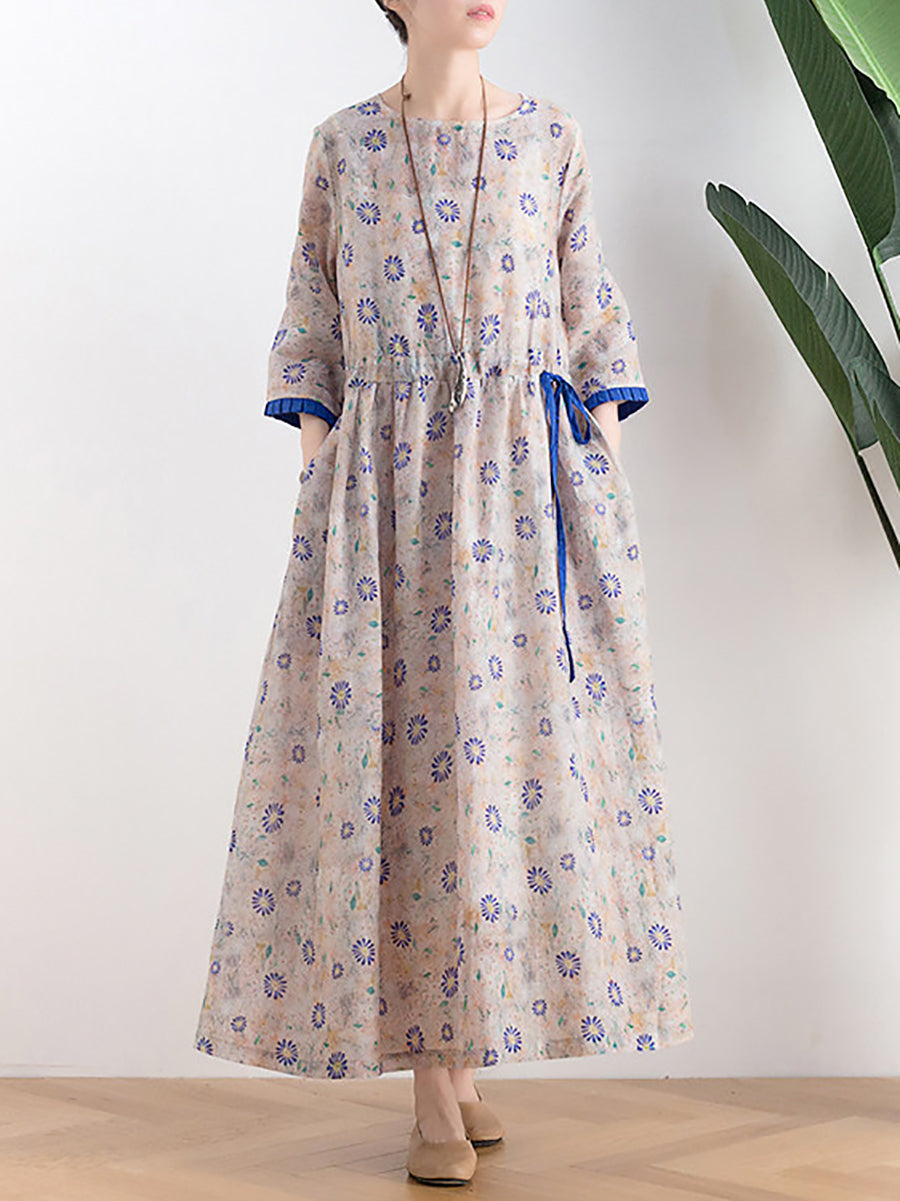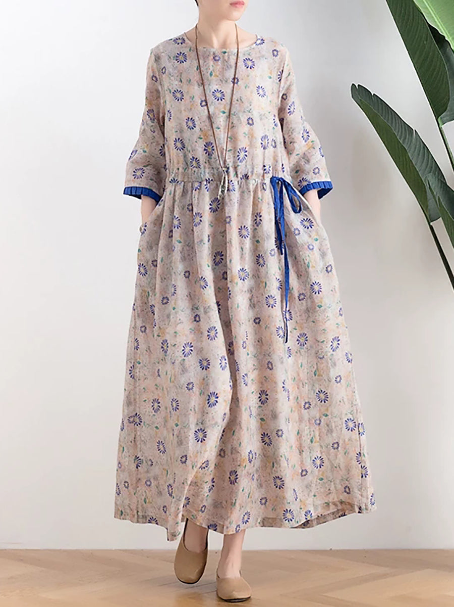 Women Summer Artsy Flower O-Neck 100%Linen Dress