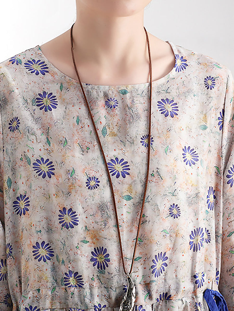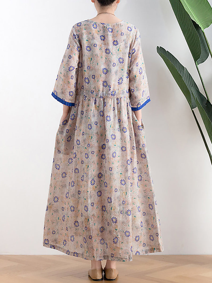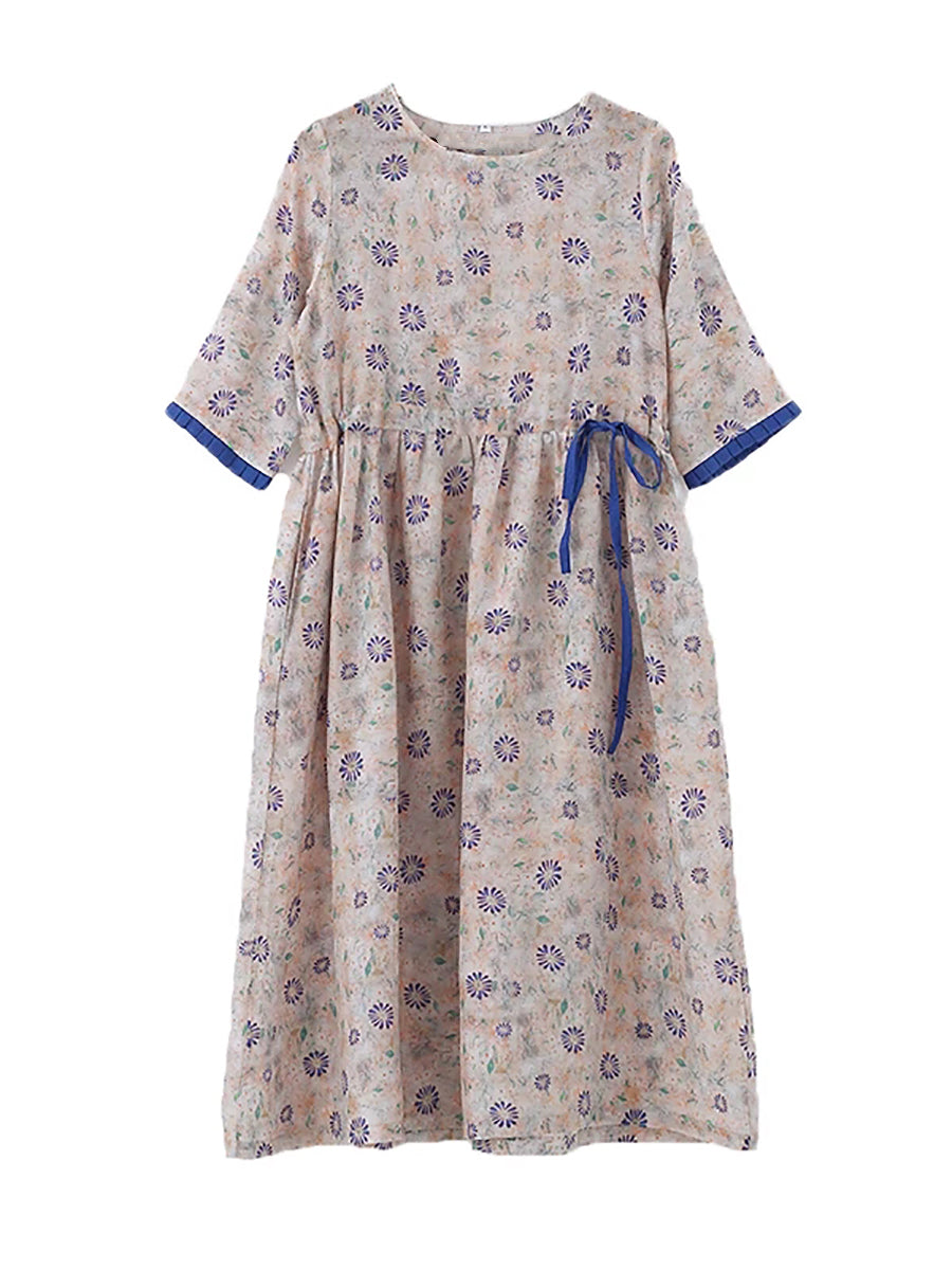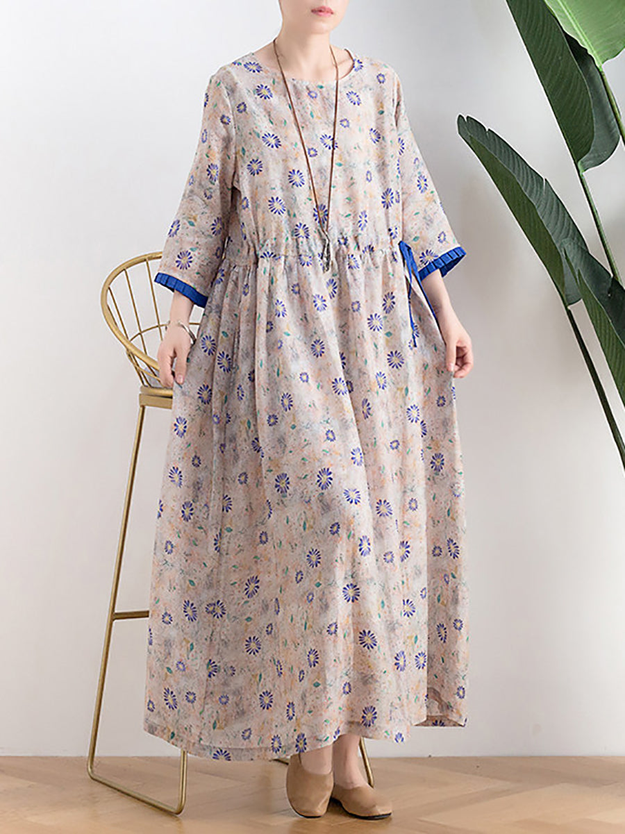 Women Summer Artsy Flower O-Neck 100%Linen Dress