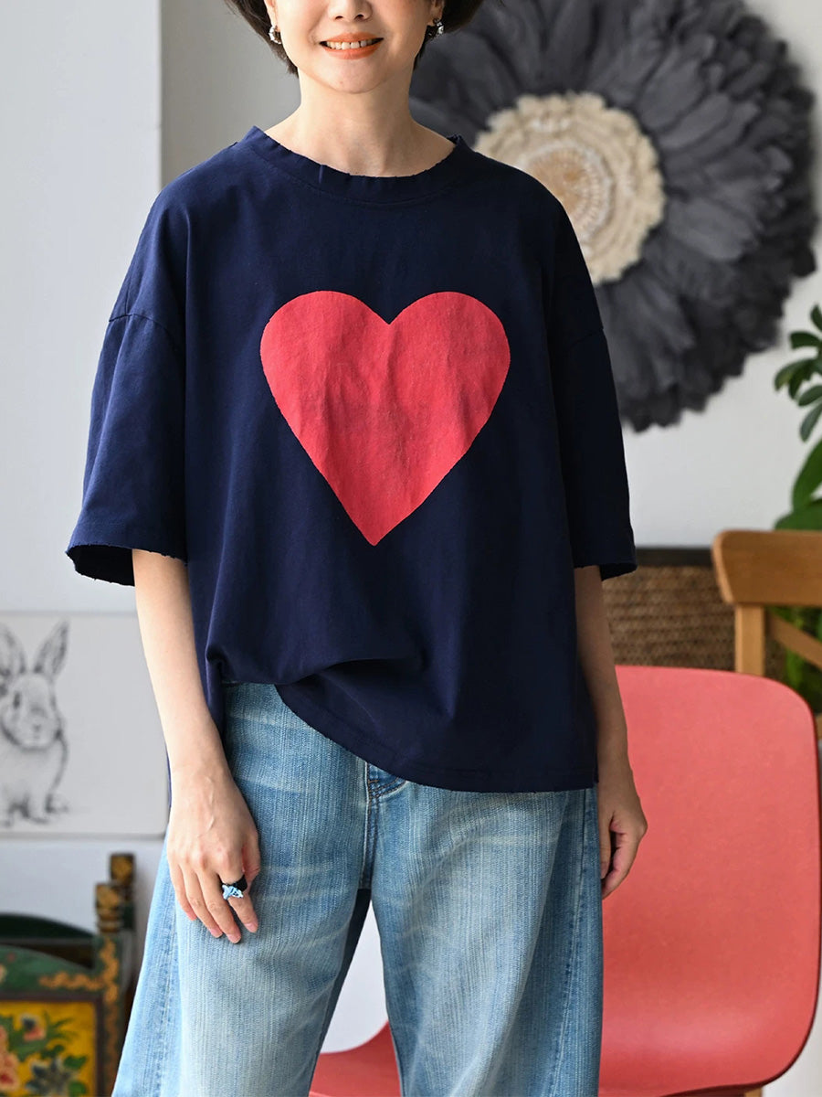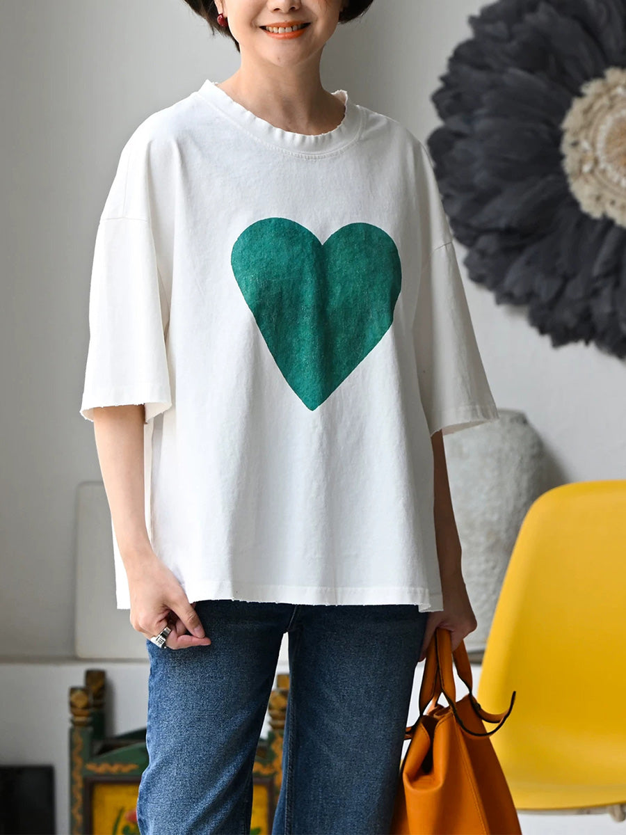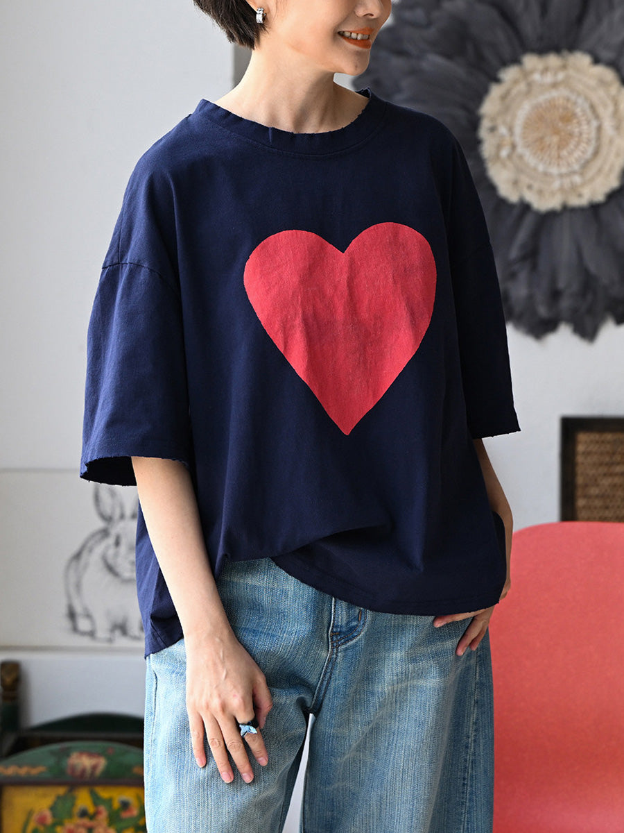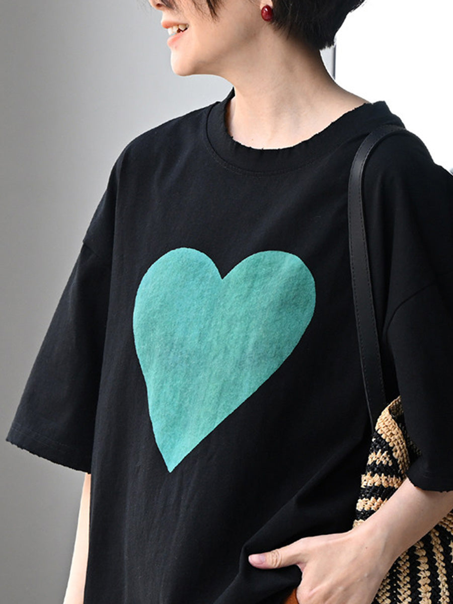 Women Summer Casual Heart O-Neck 100%Cotton T-Shirt