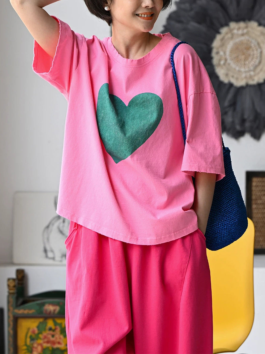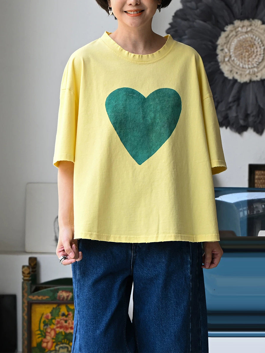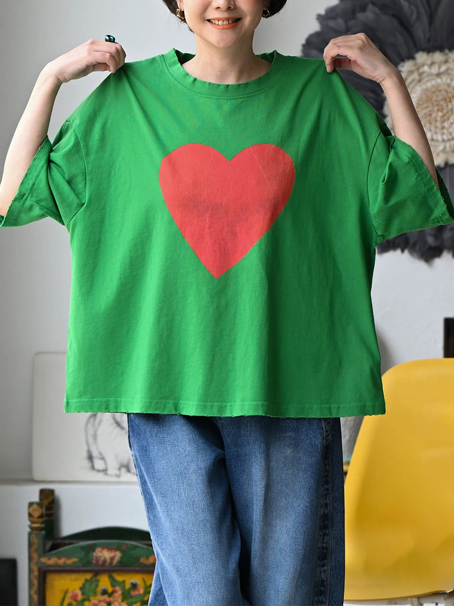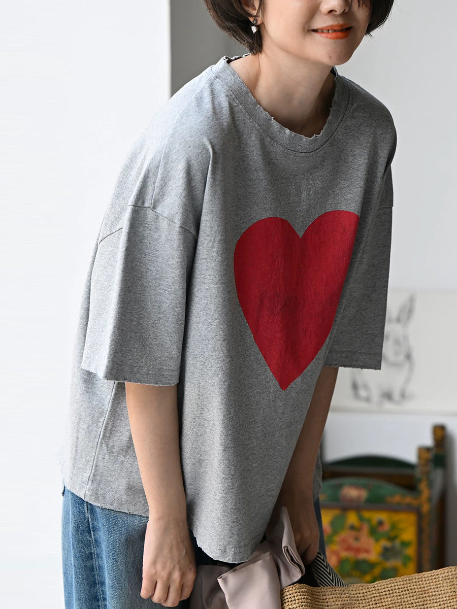 Women Summer Casual Heart O-Neck 100%Cotton T-Shirt