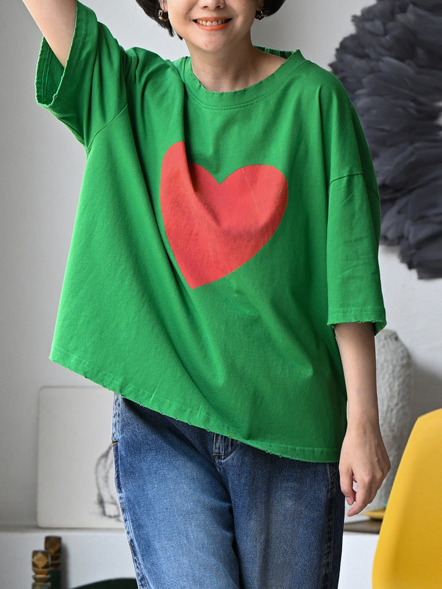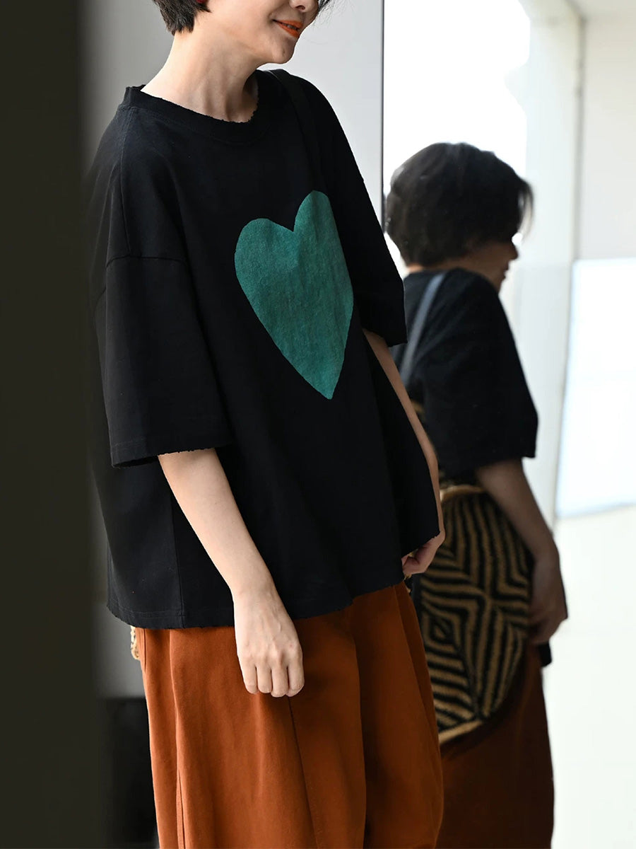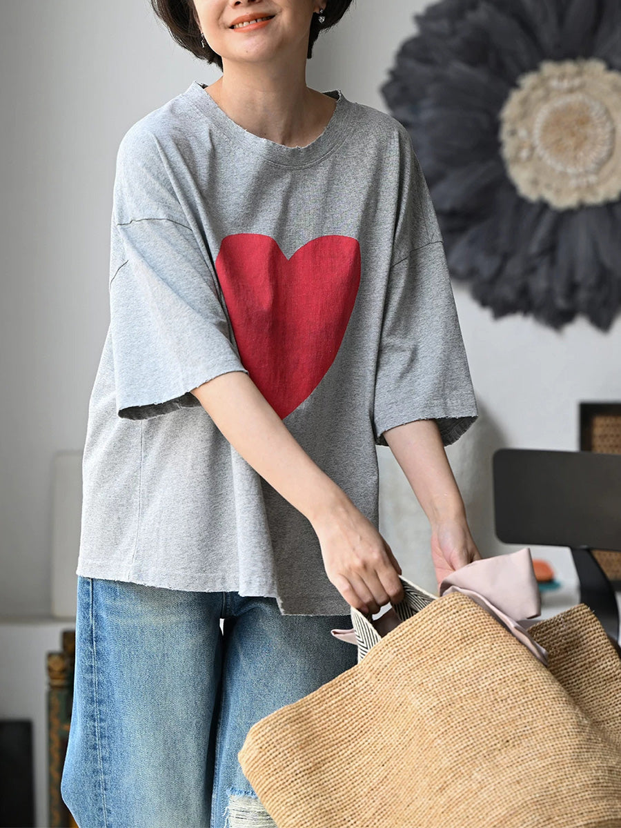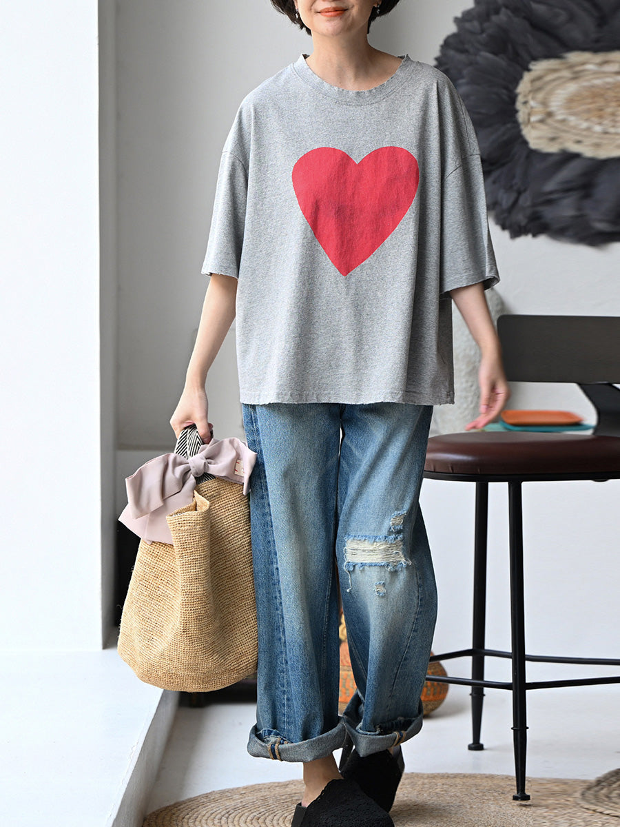 Women Summer Casual Heart O-Neck 100%Cotton T-Shirt