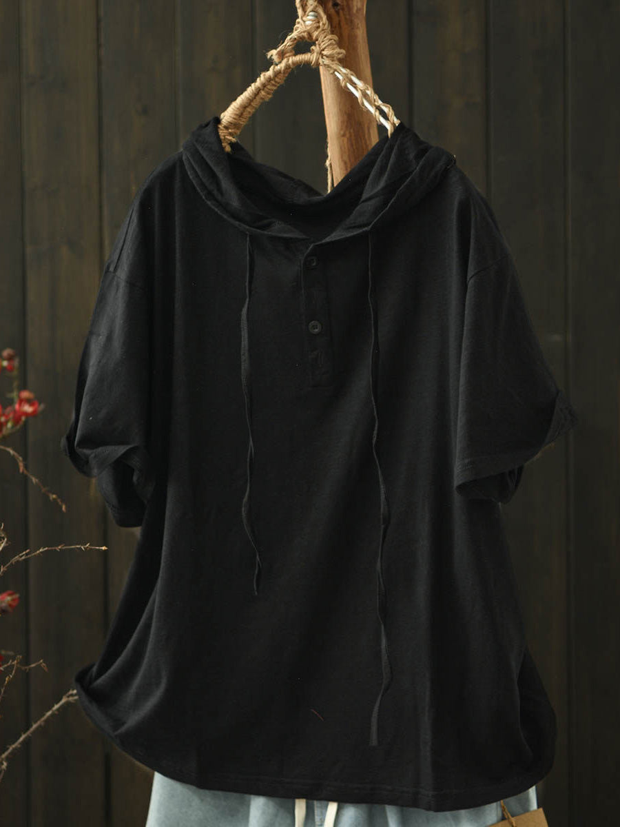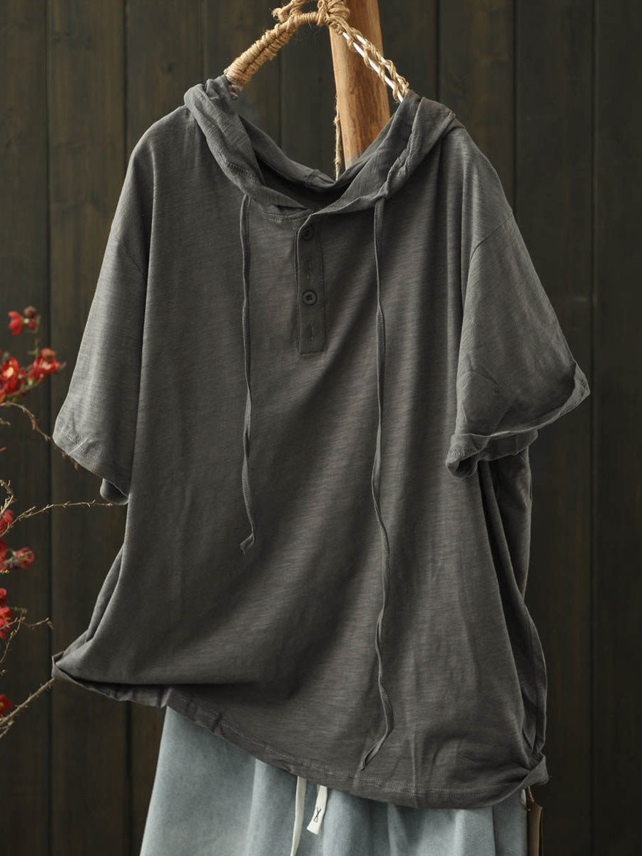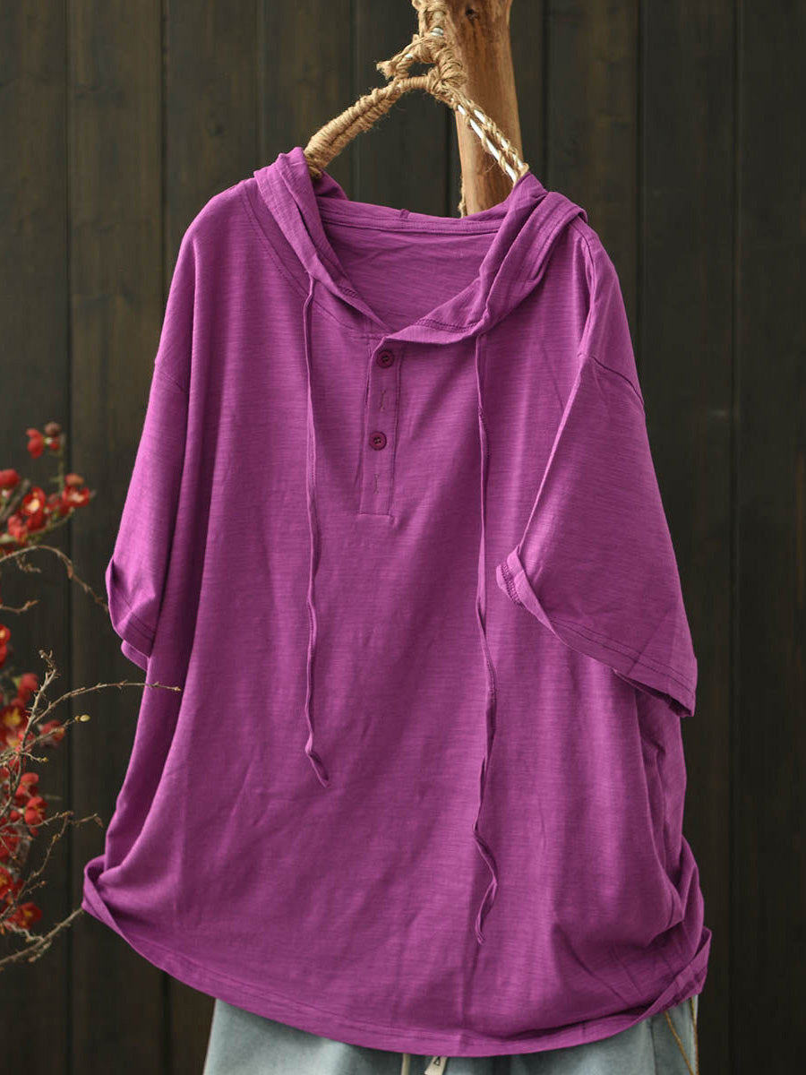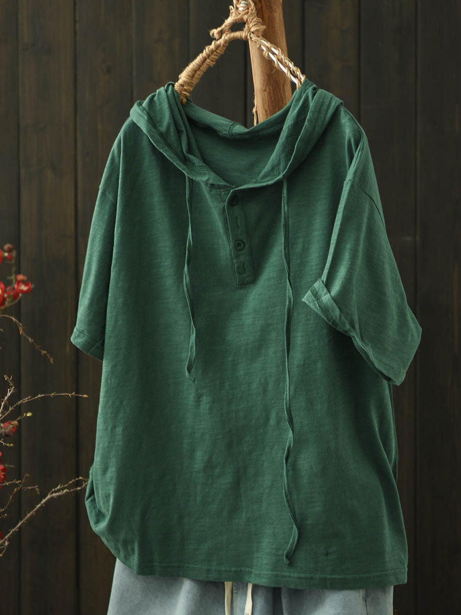 Women Summer Casual Pure Color Cotton Hooded