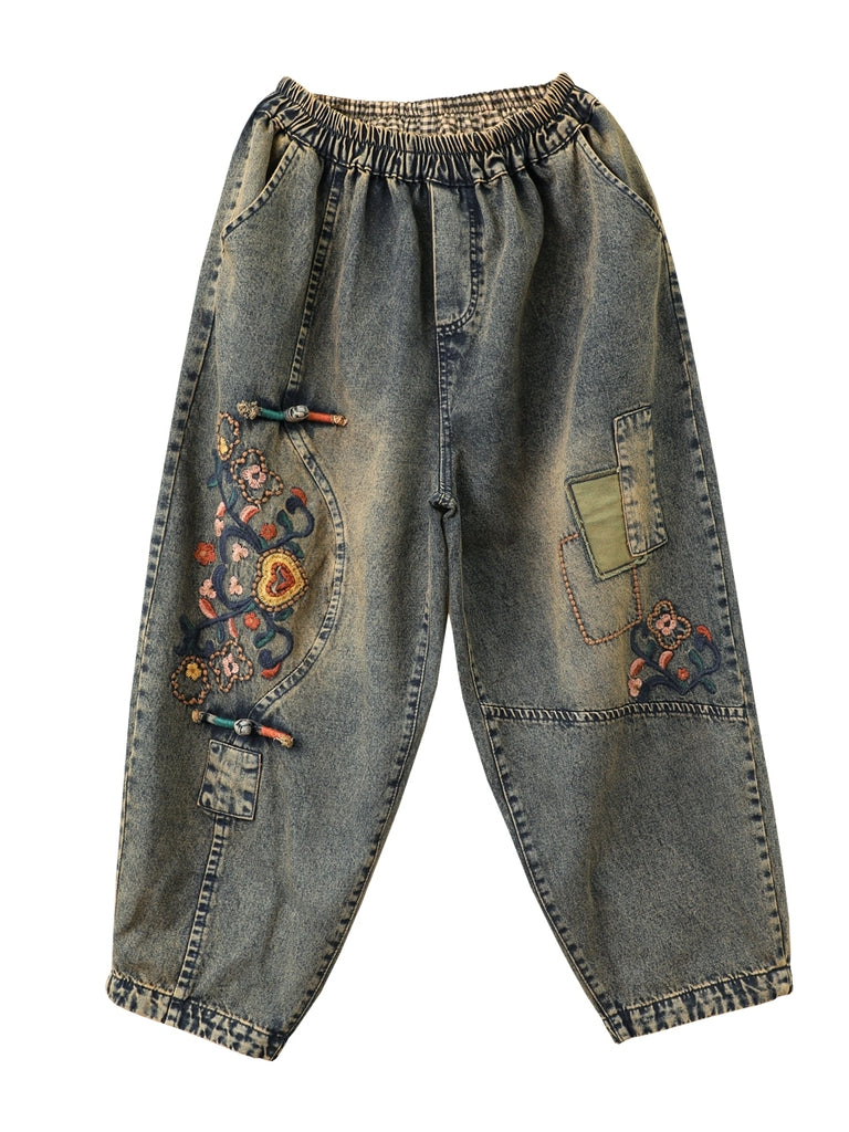Women Ethnic Flower Embroidery Denim Harem Pants