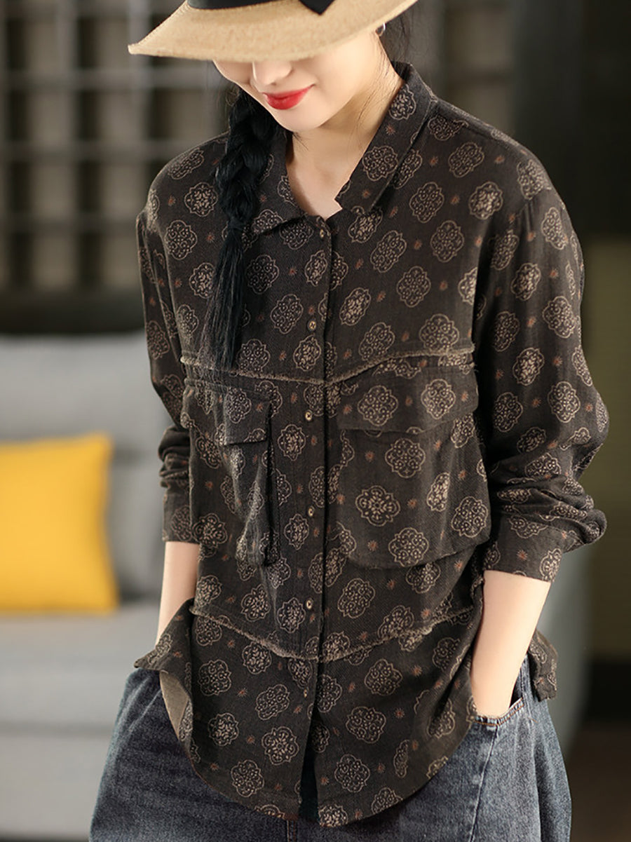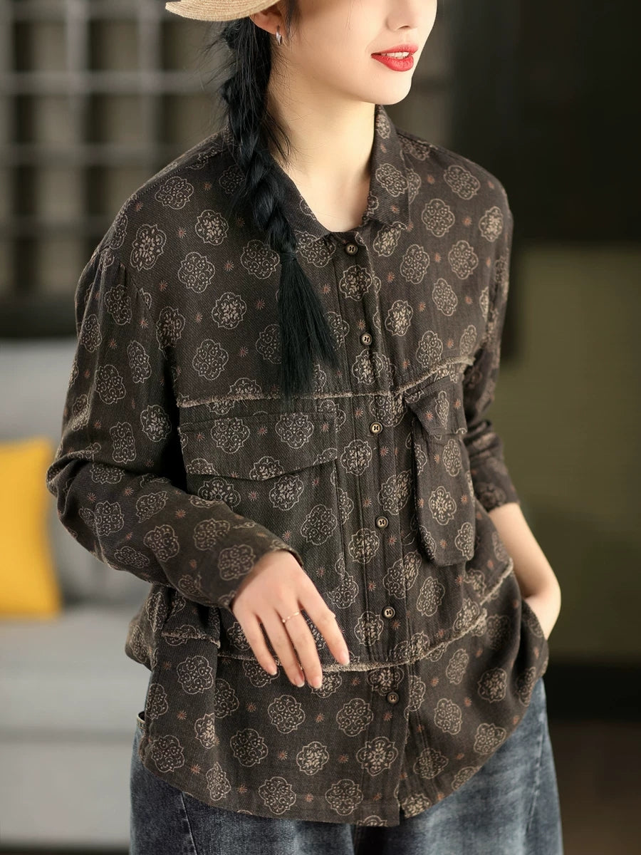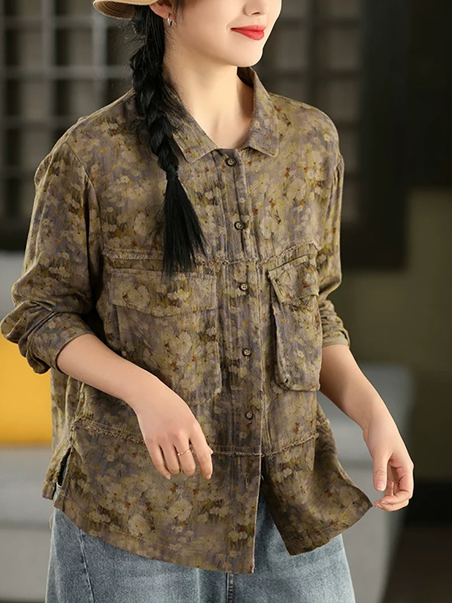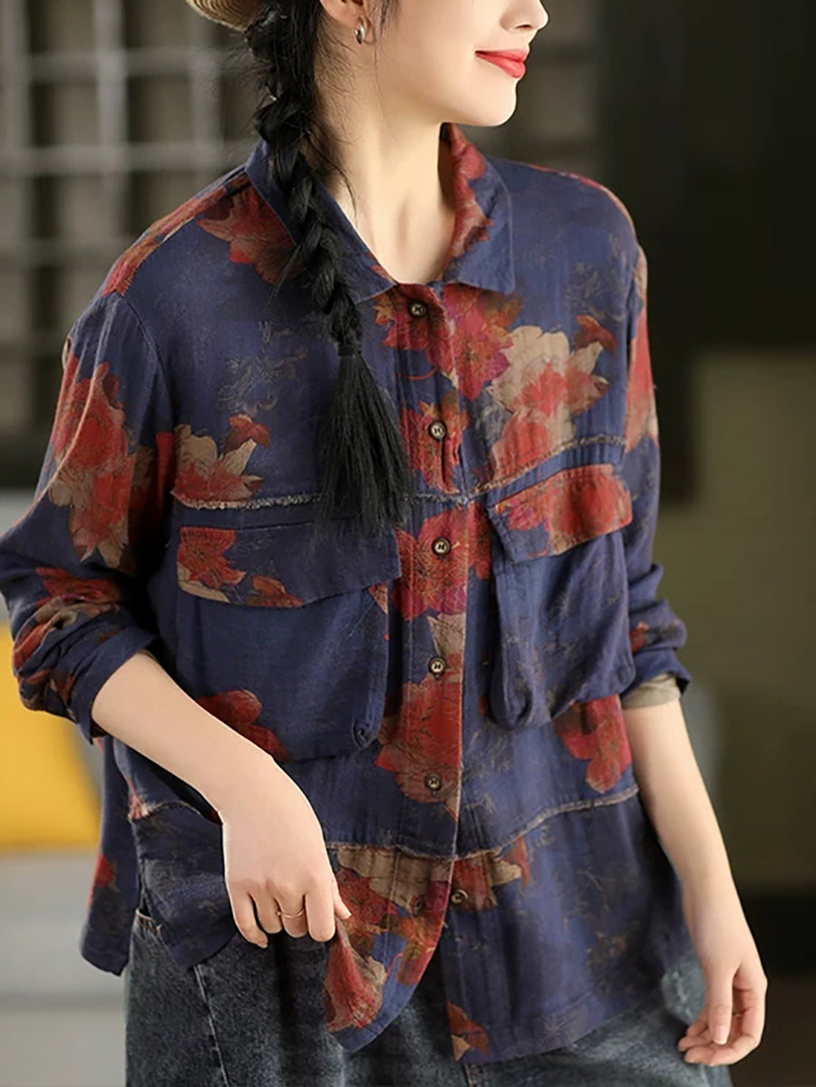 Women Summer Flower Turn-down Collar 100%Cotton Shirt