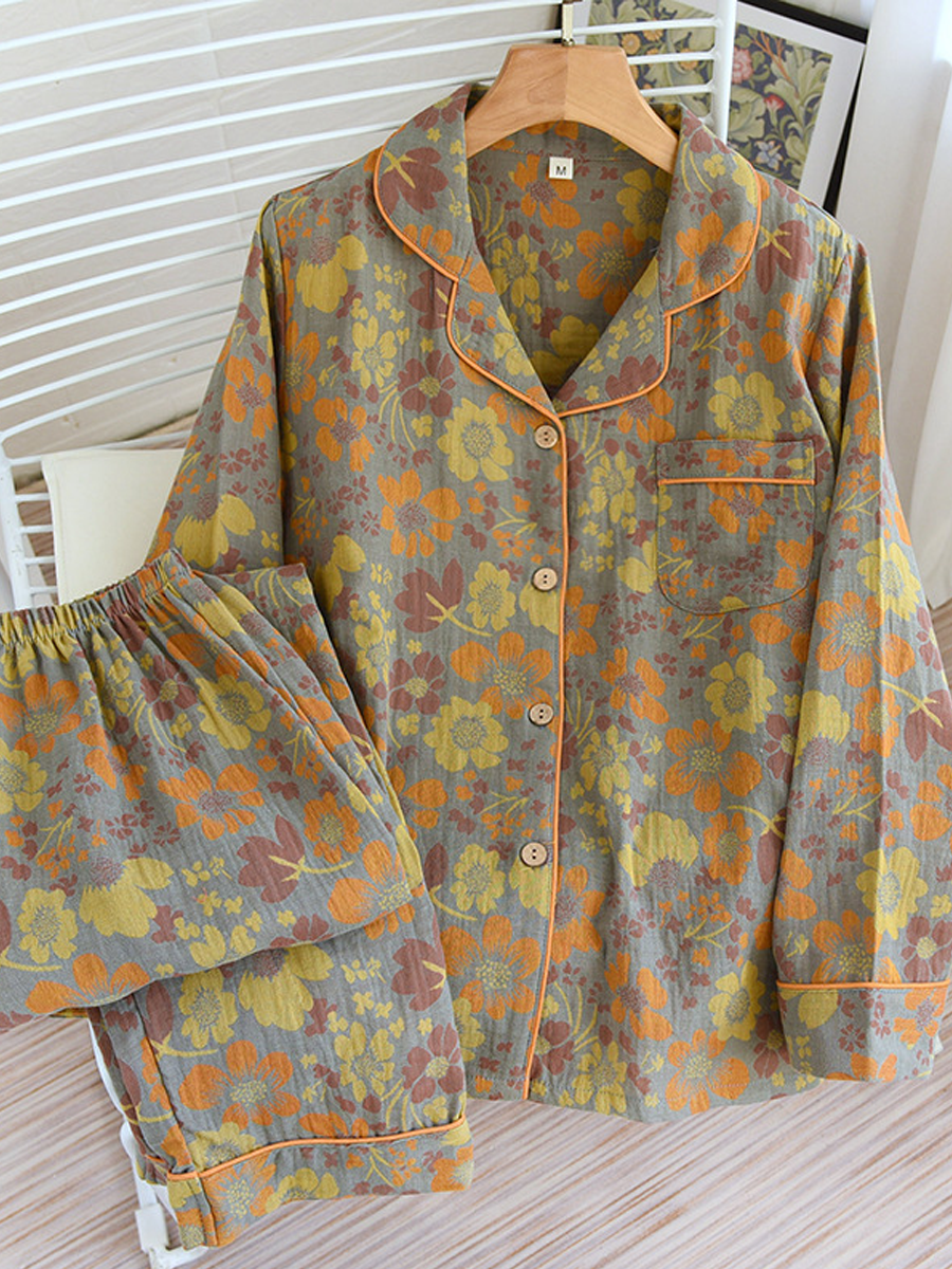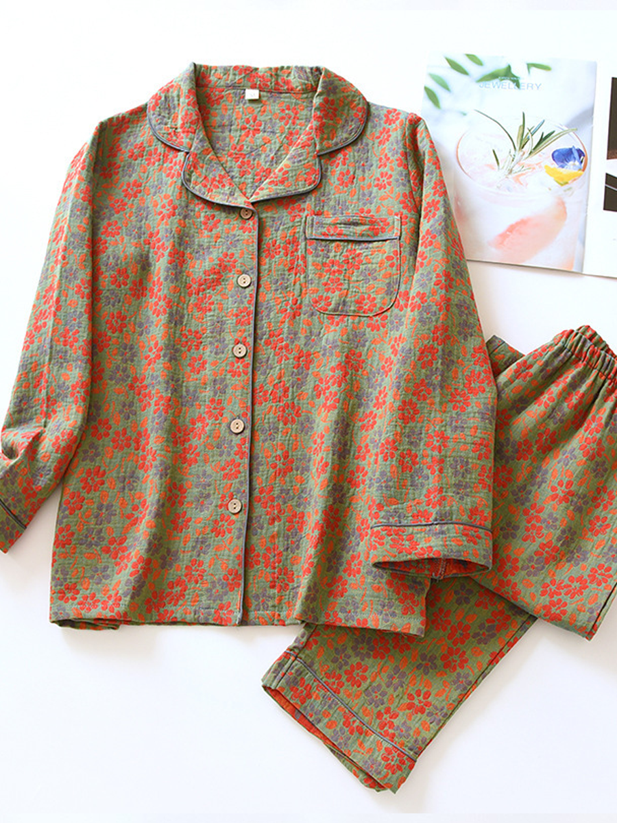 The Women’s Summer Floral Homewear Pajama Set is crafted from soft jacquard double-layer gauze for comfort. This stylish set features a V-neck, floral pattern, long sleeves, and an elastic waistband, with full-length pants perfect for lounging at home.