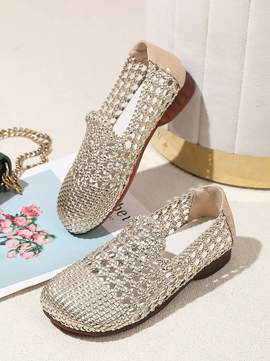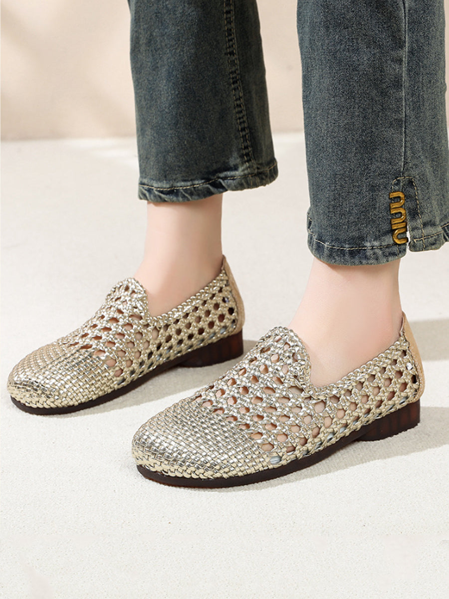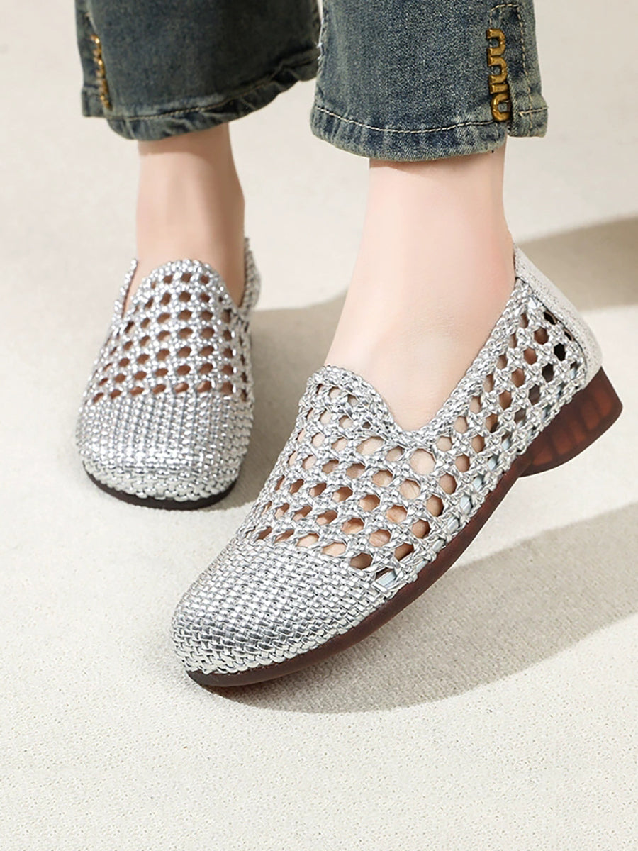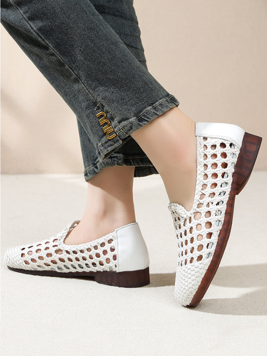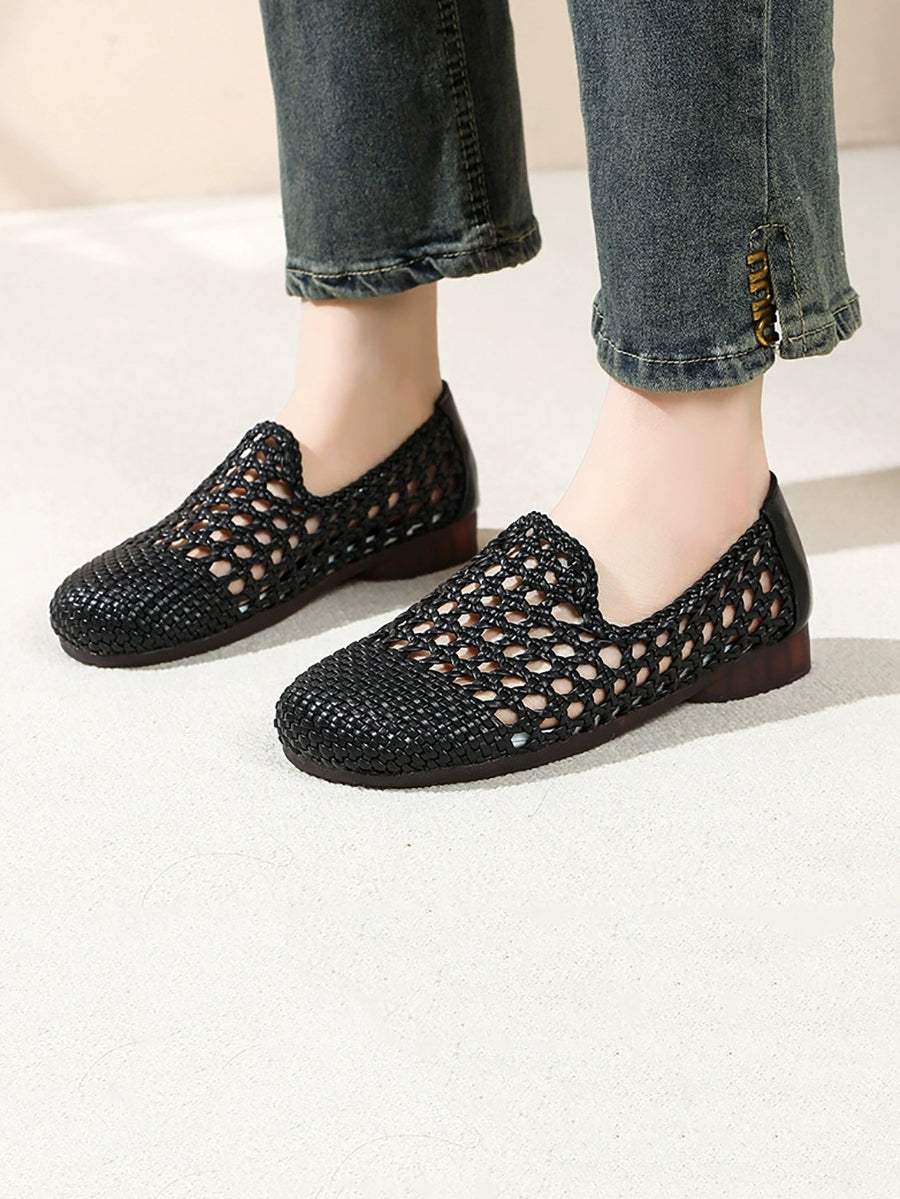 Women Summer Hole Leather Weave Low Heel Sandals