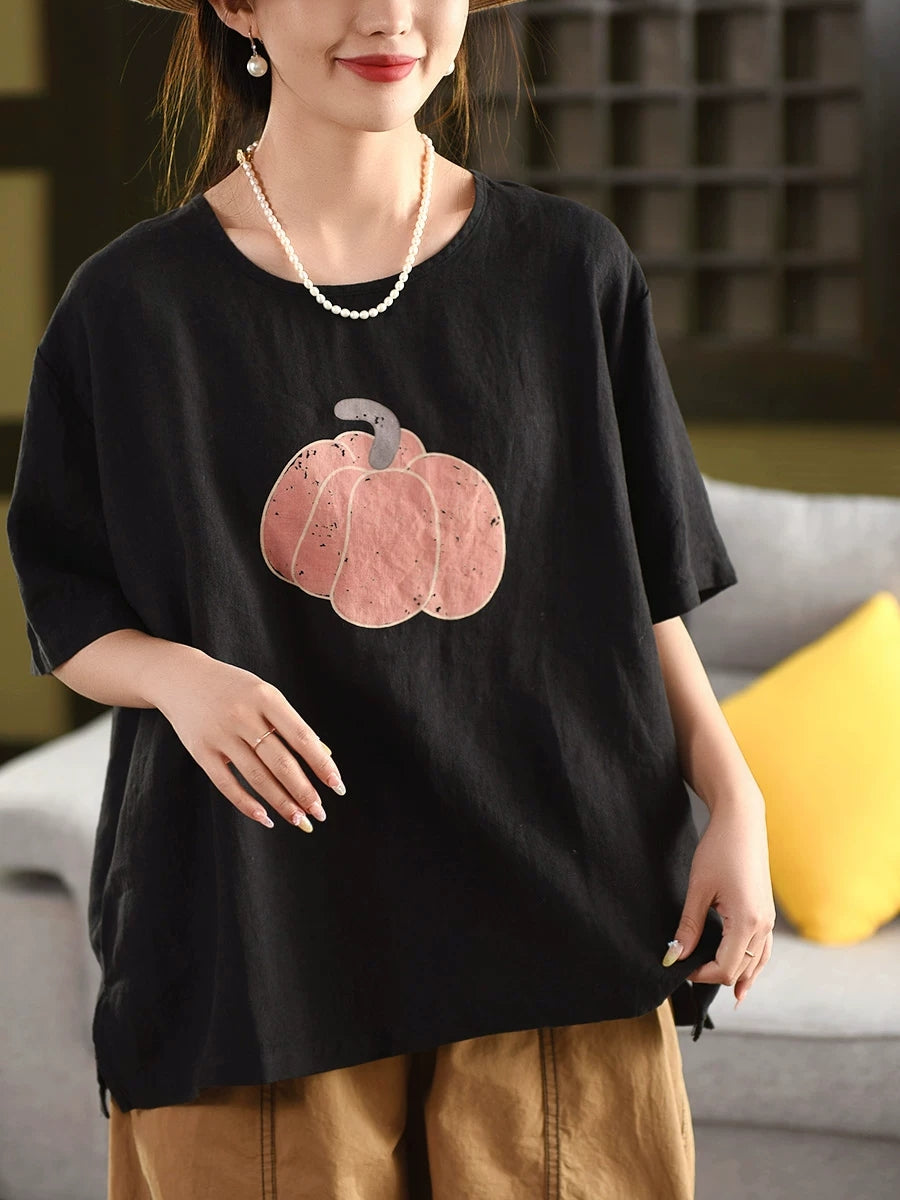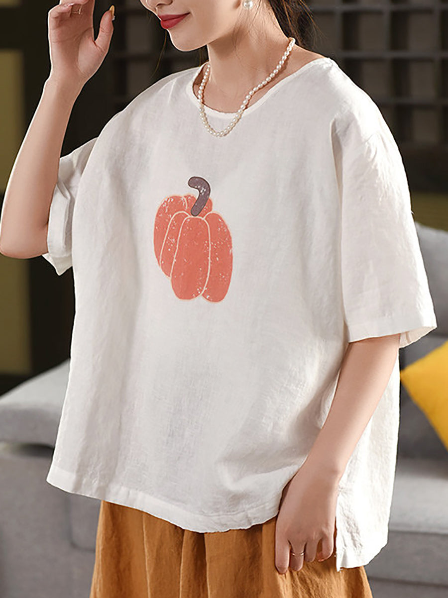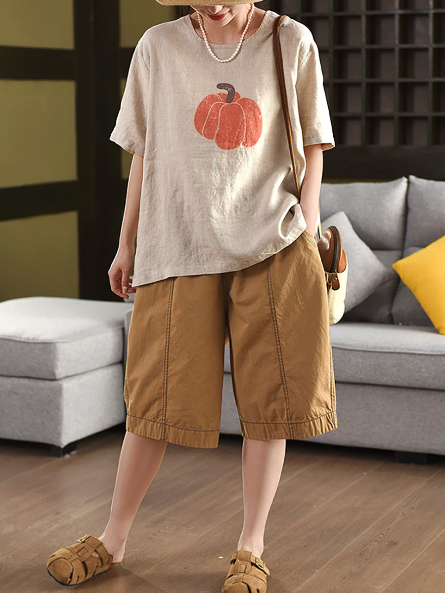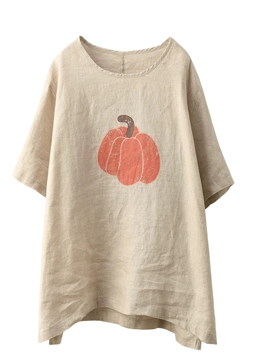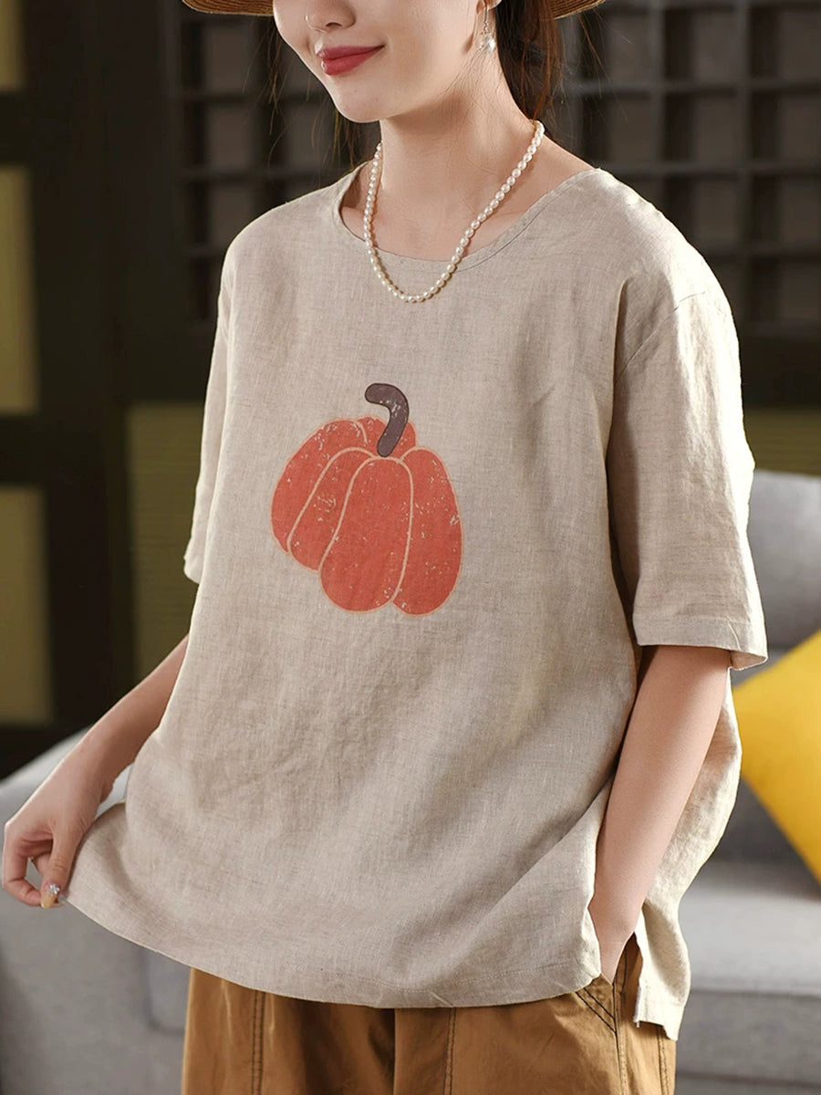 Women Summer Pumkin O-Neck 100%Linen Blouse
