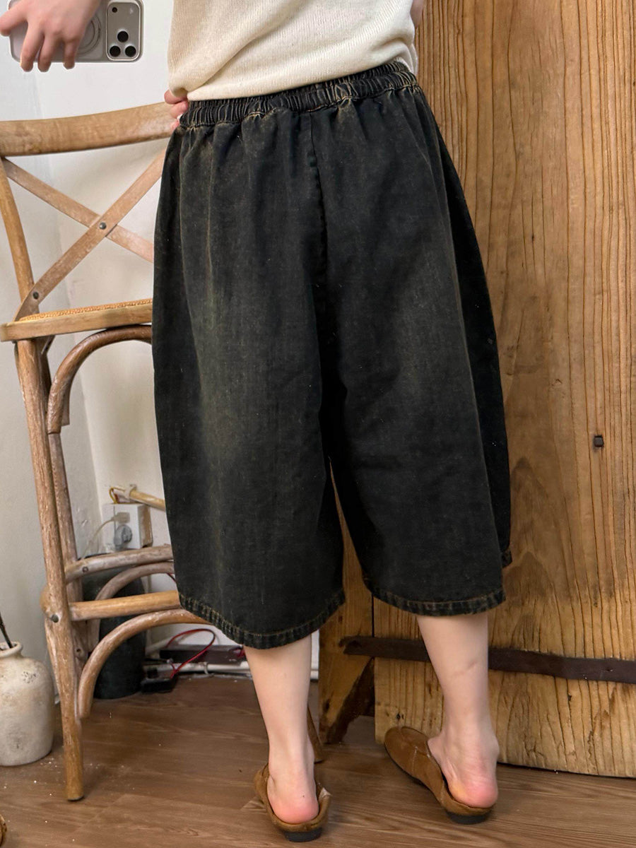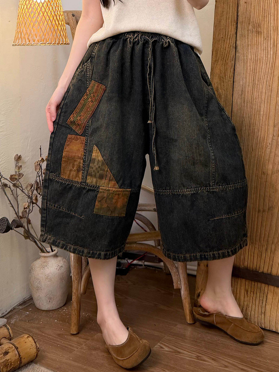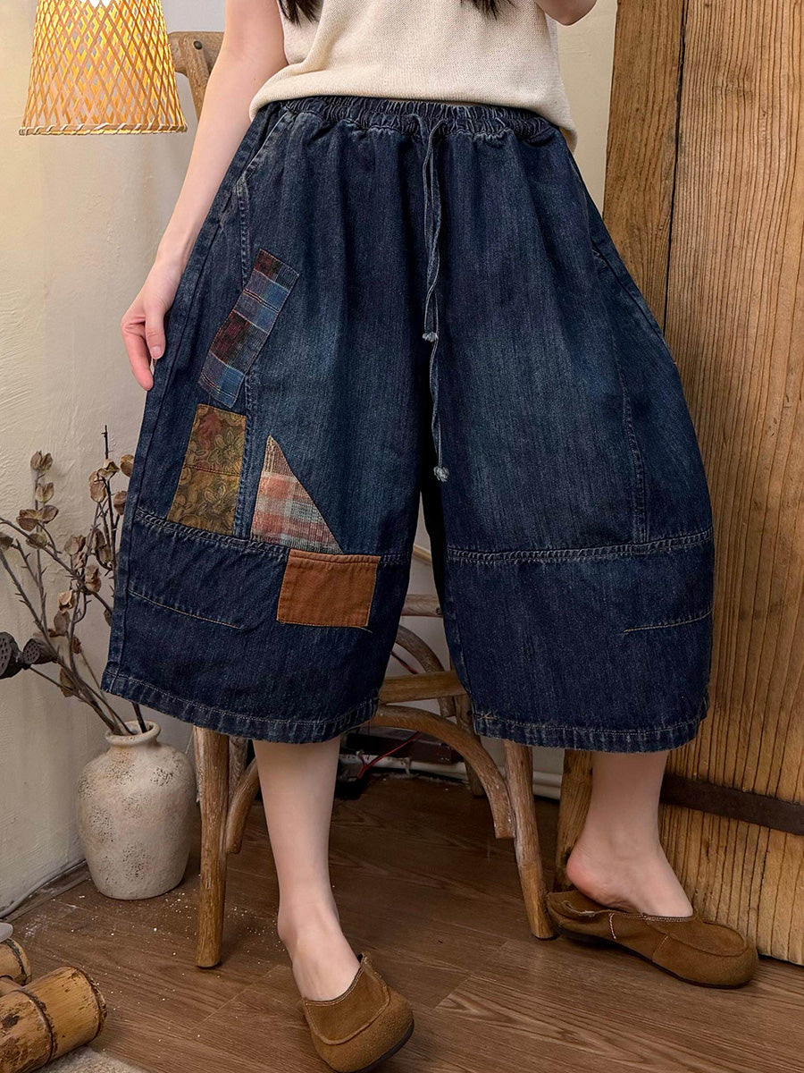 Women Summer Retro Patchwork Denim Wide-leg Pants