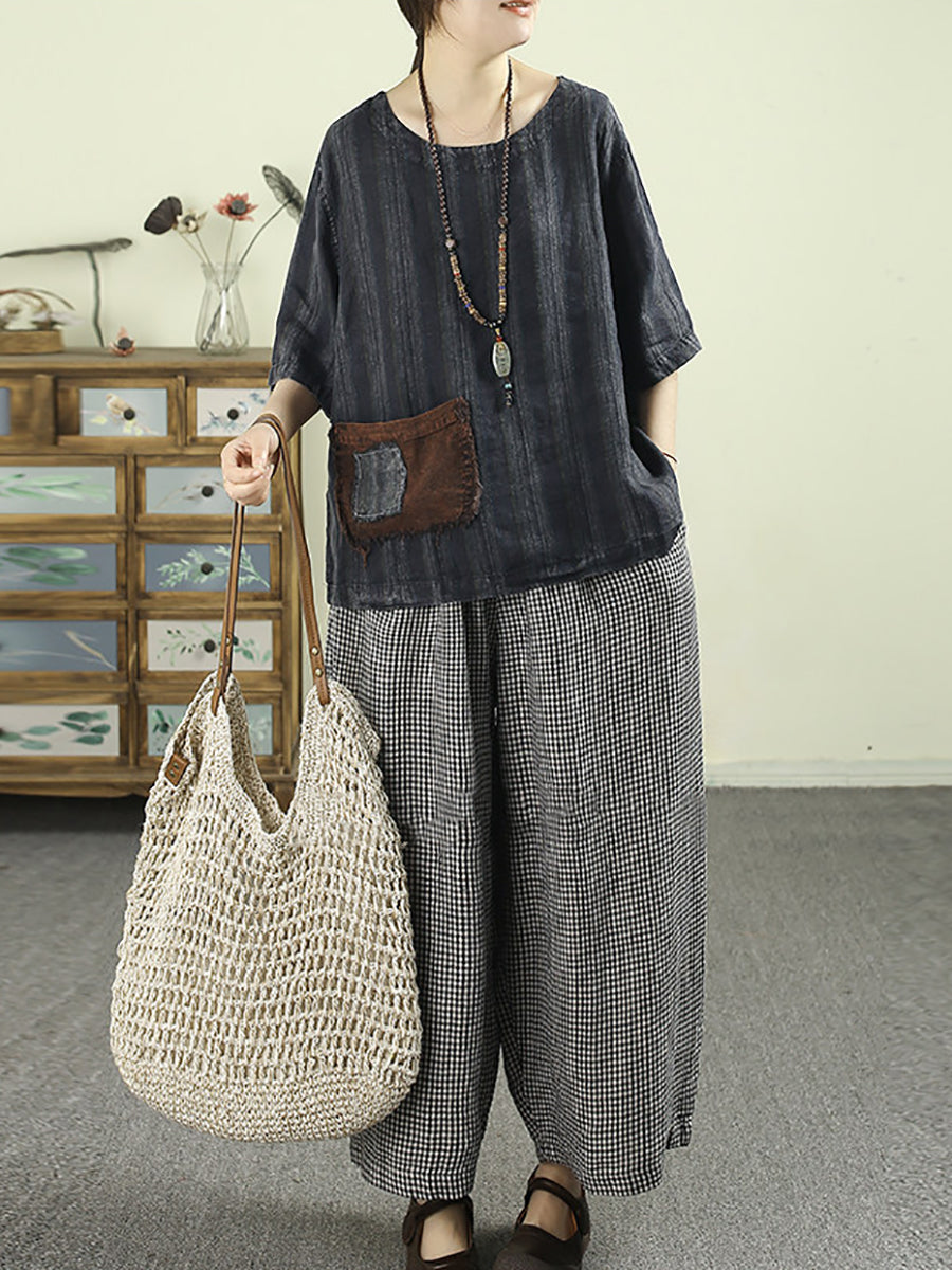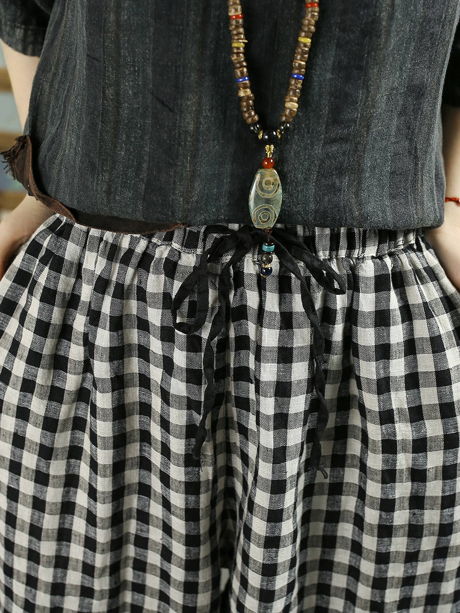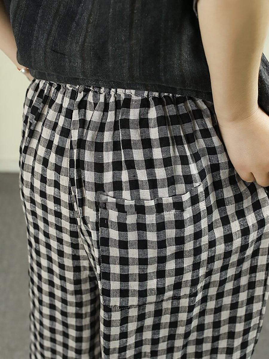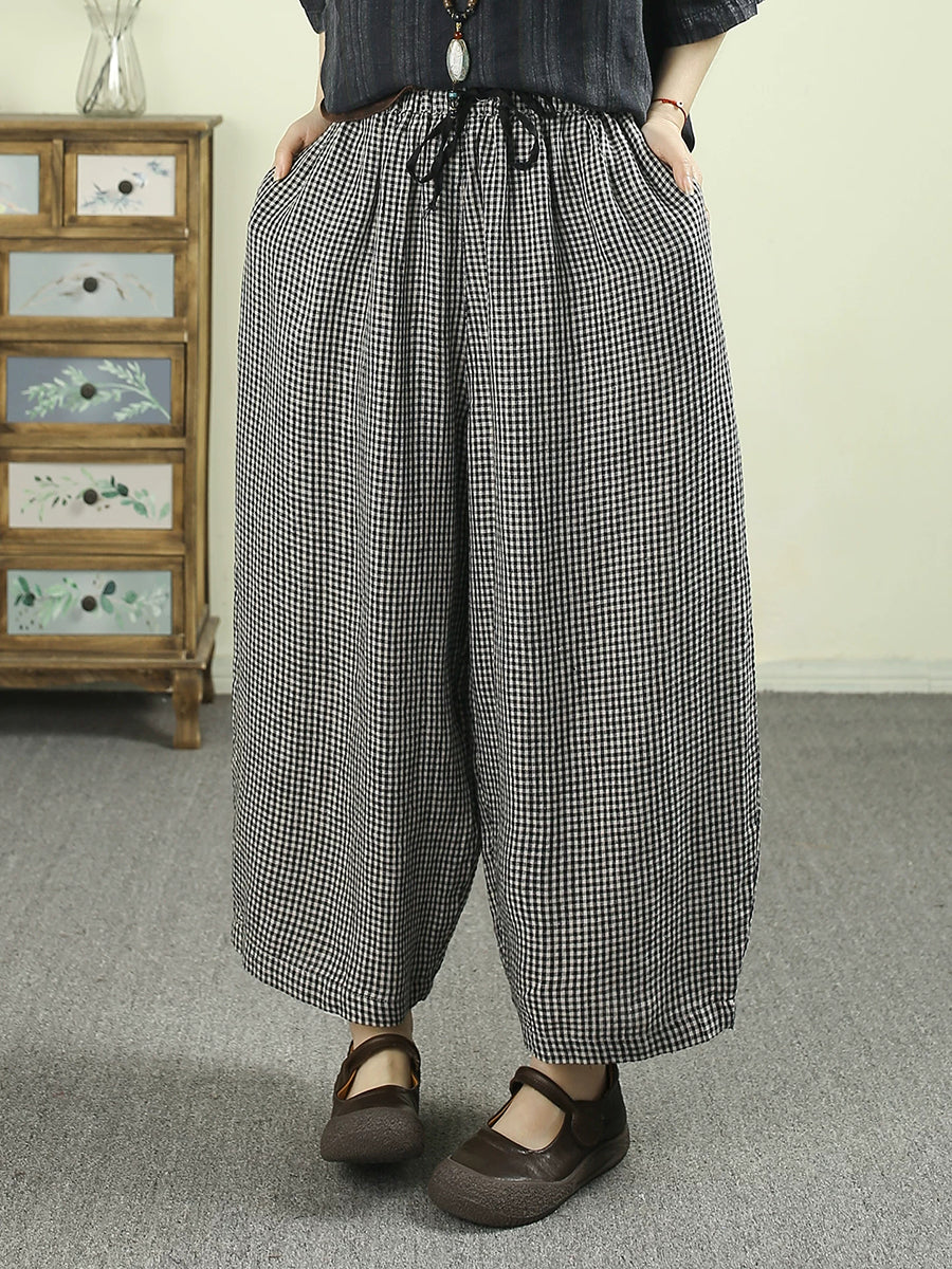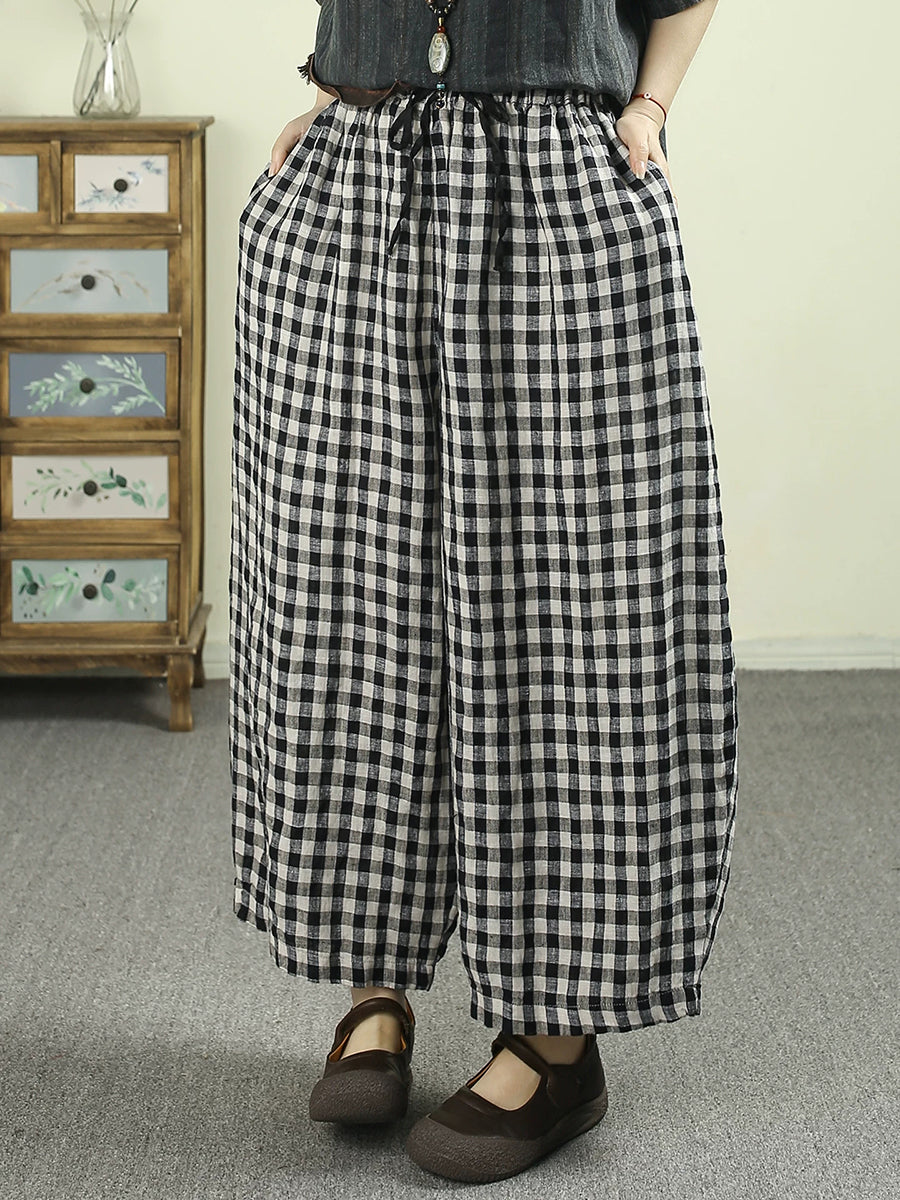 Women Summer Retro Plaid 100%Linen Wide-leg Pants