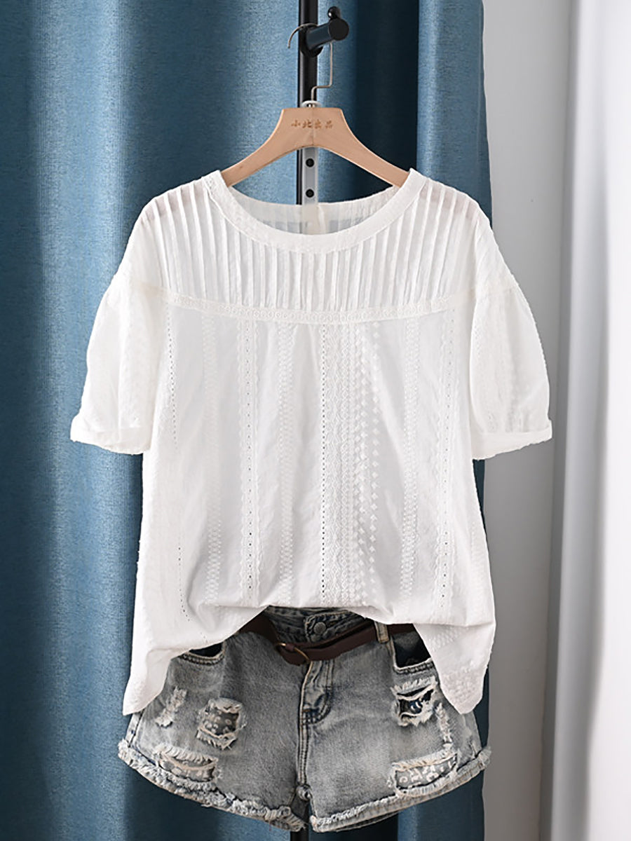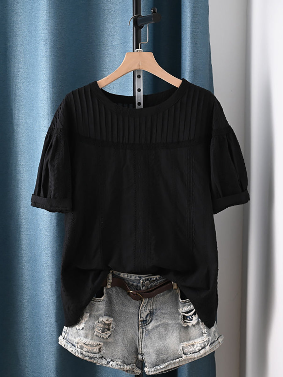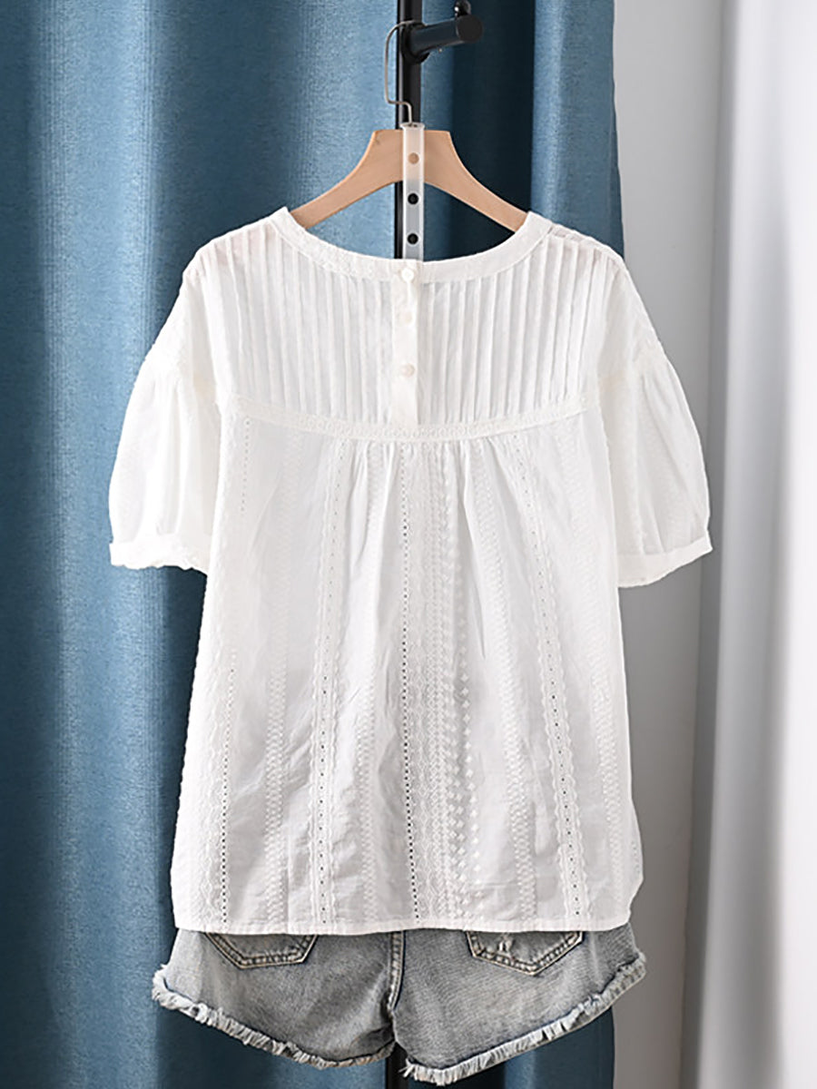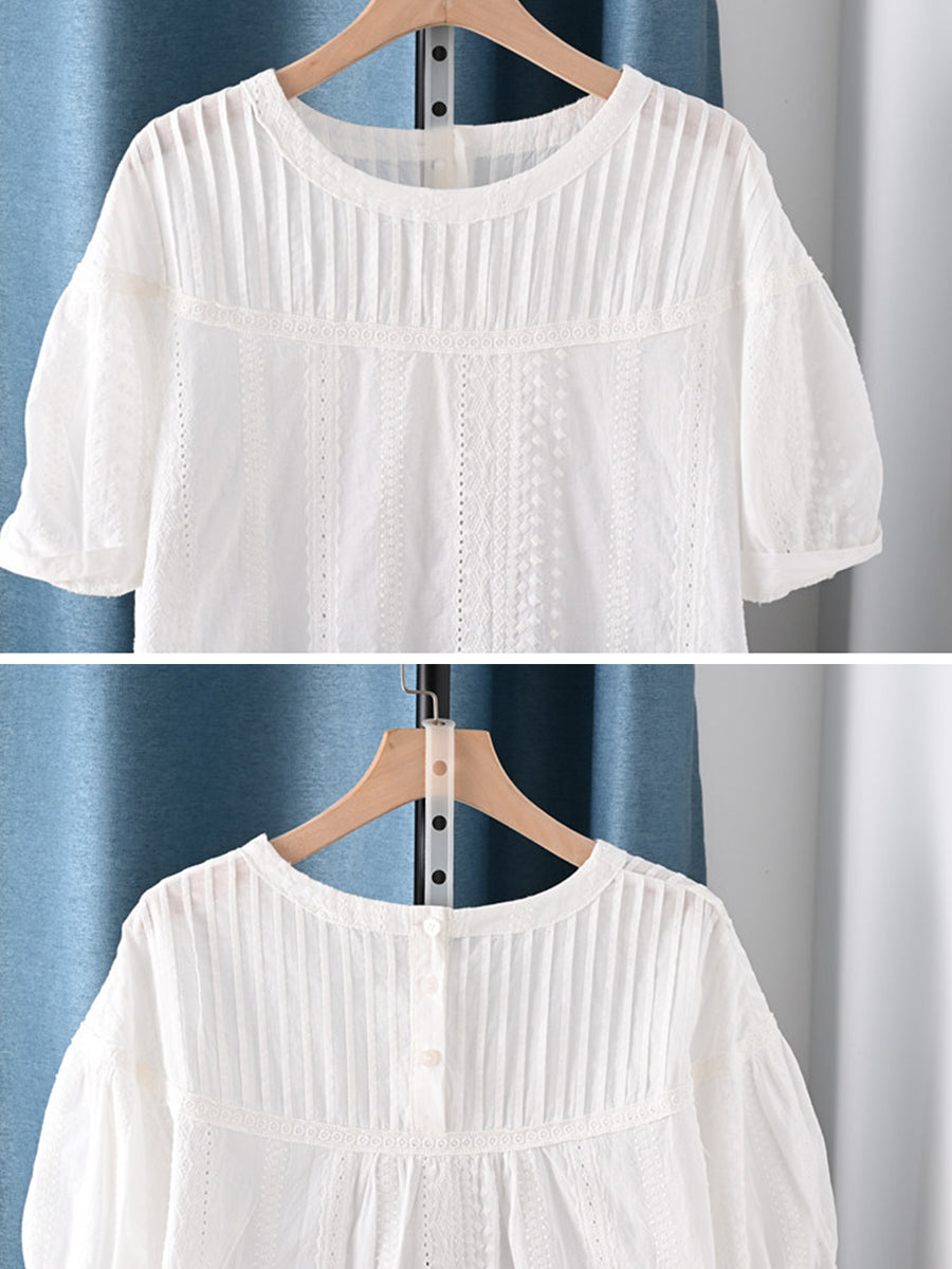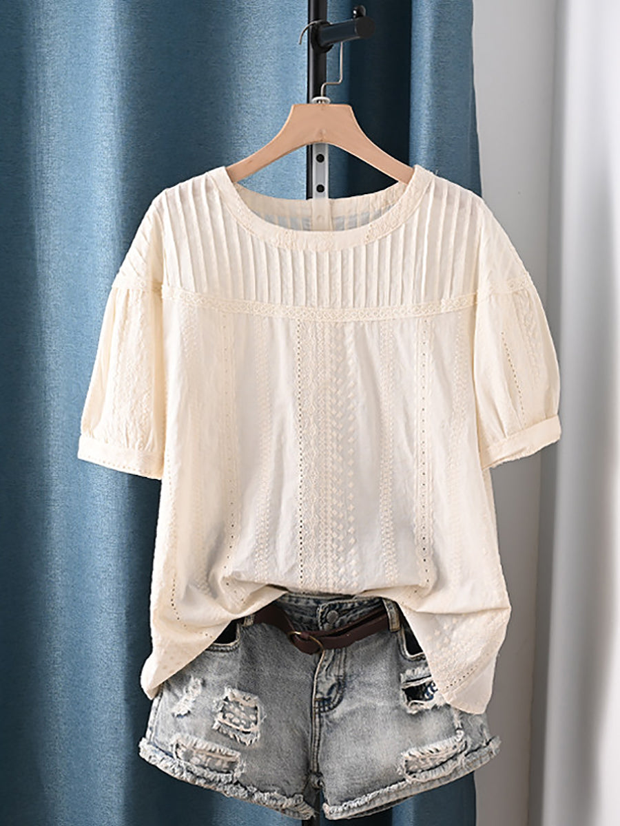 Women Summer Shirred O-Neck 100%Cotton Blouse