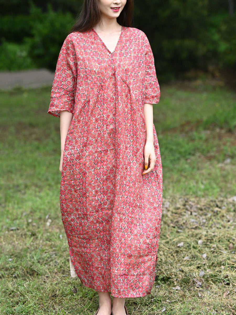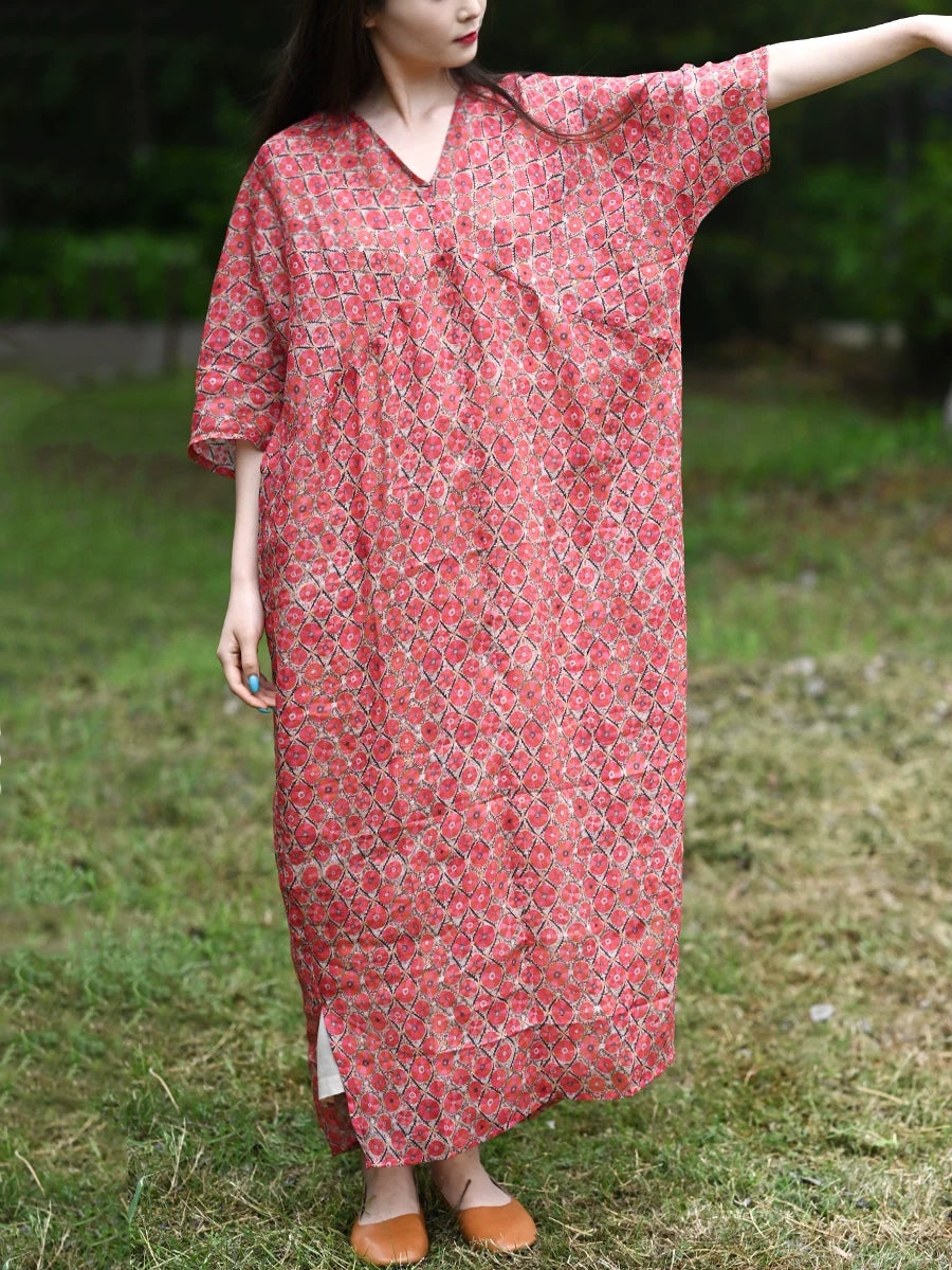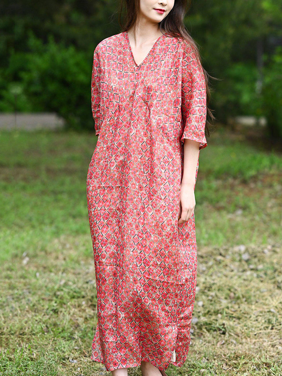 Women Summer Vintage Floral 100%Ramie V-Neck Dress