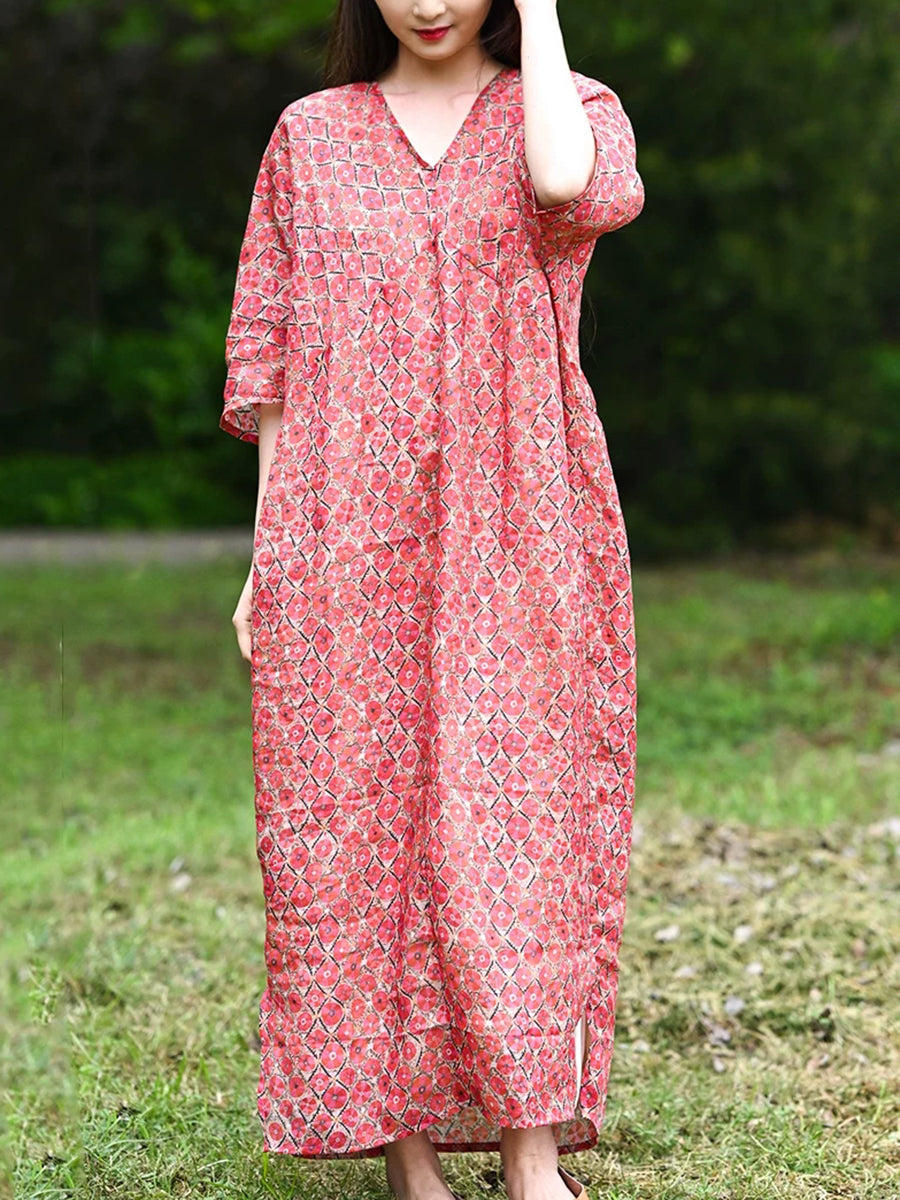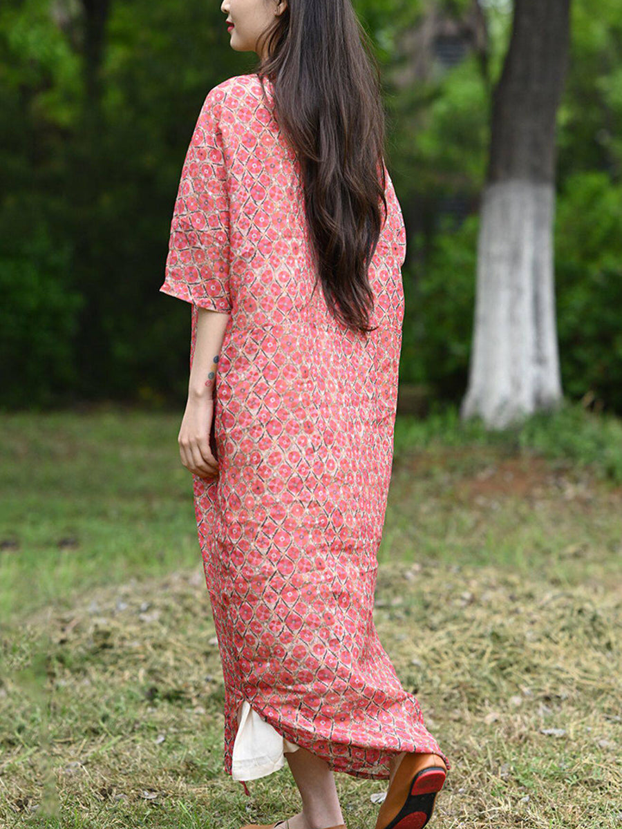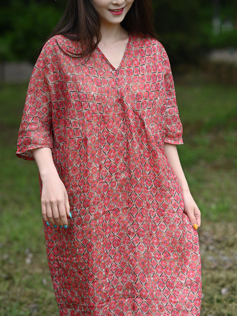 Women Summer Vintage Floral 100%Ramie V-Neck Dress