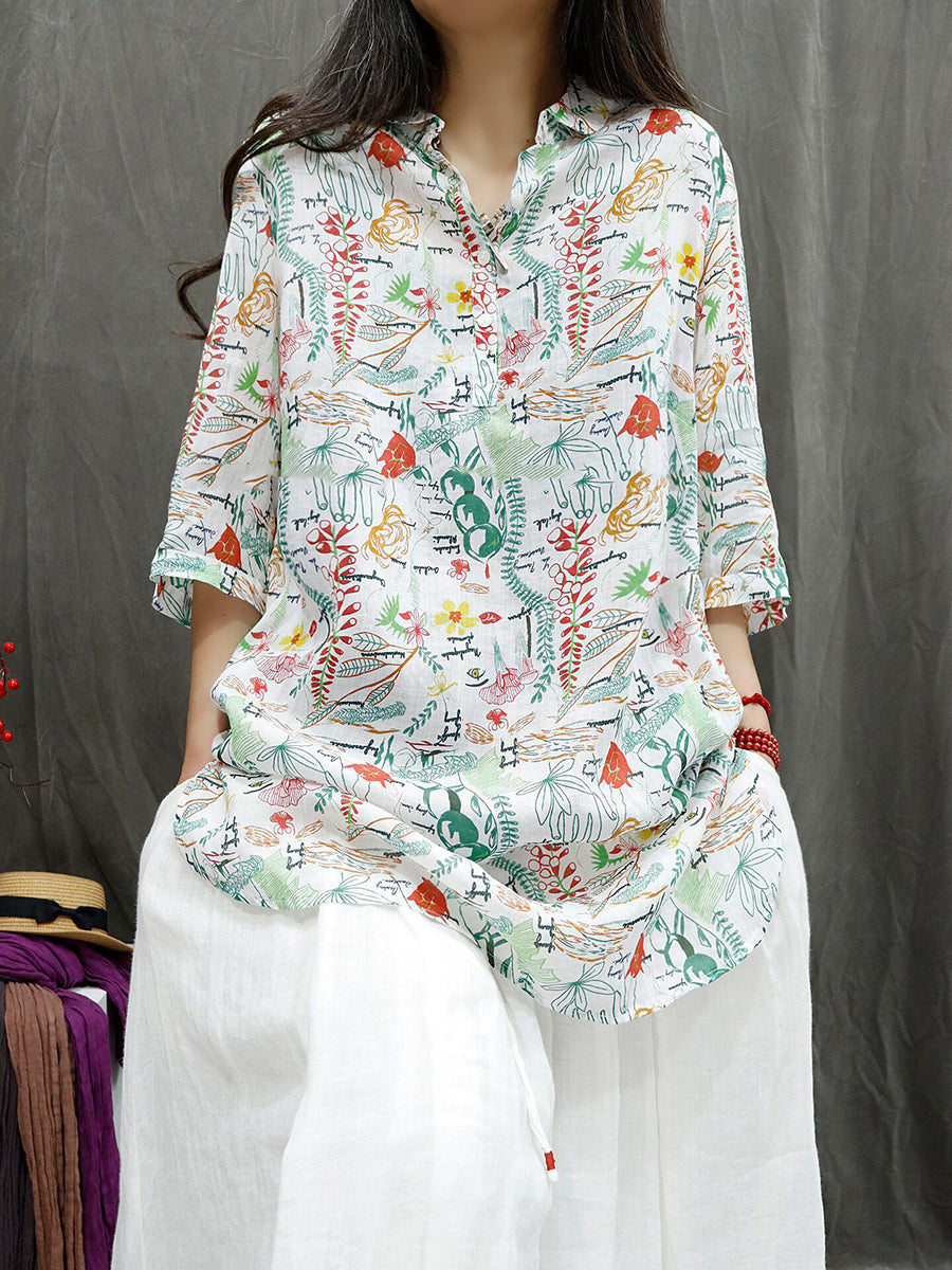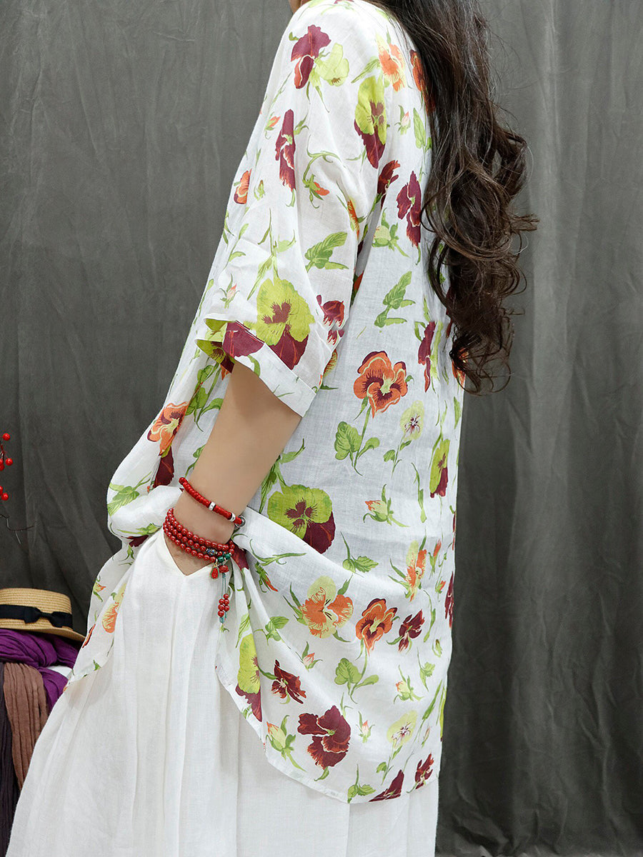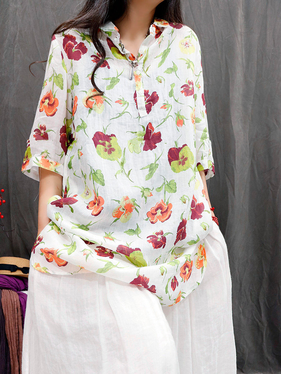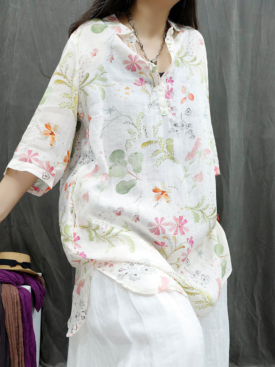 Women Summer Vintage Flower 100%Ramie Blouse