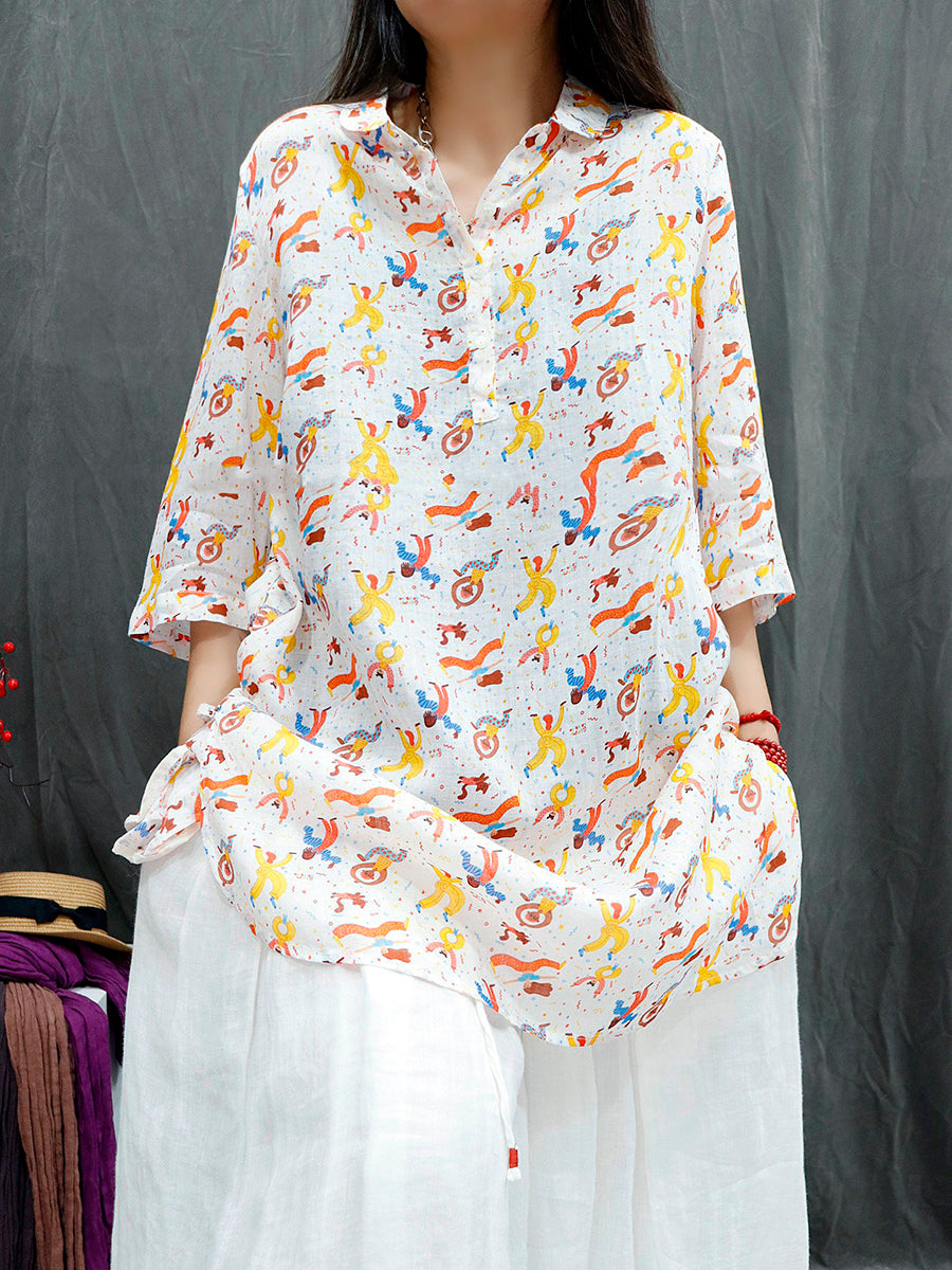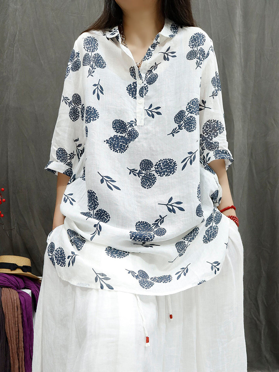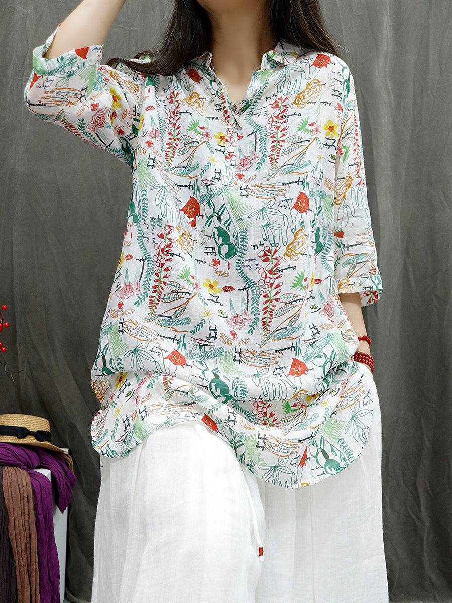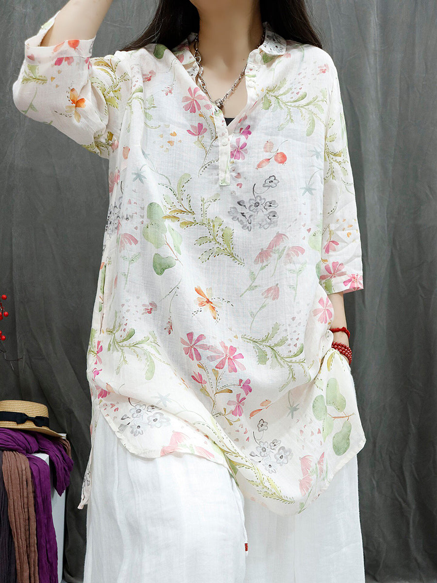 Women Summer Vintage Flower 100%Ramie Blouse