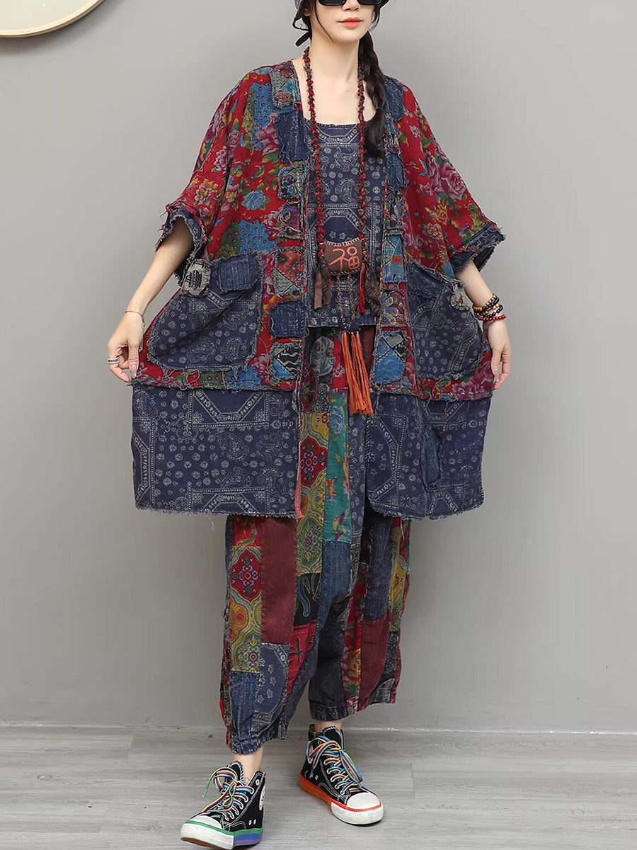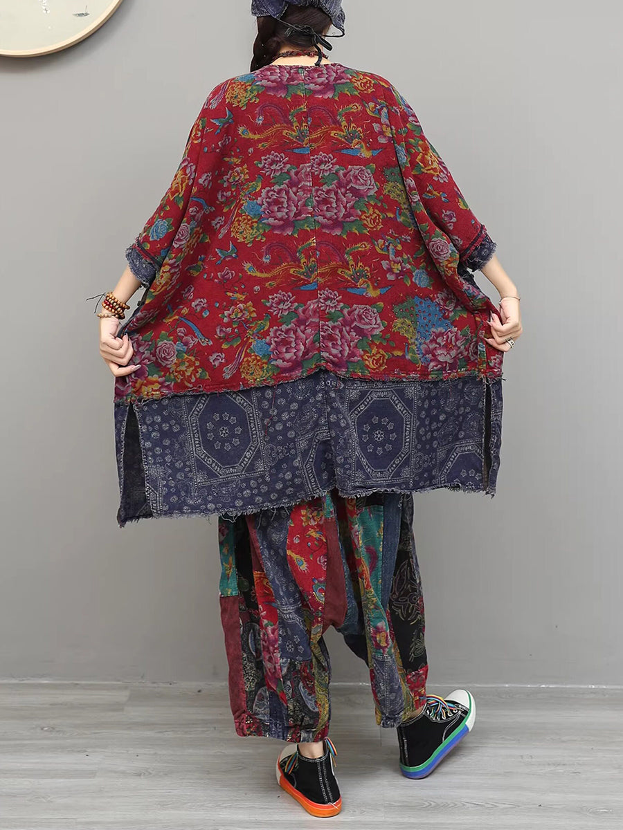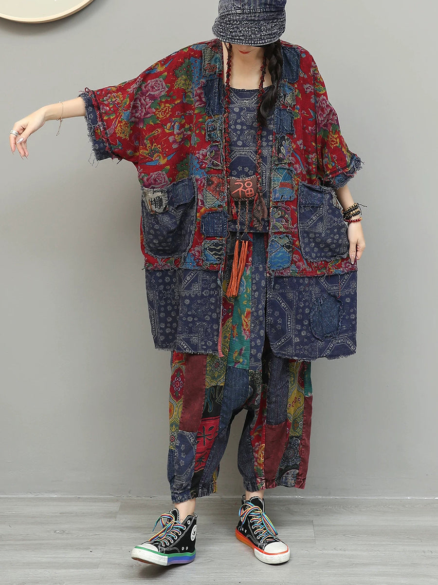 Women Summer Vintage Flower Patchwork V-Neck Suits