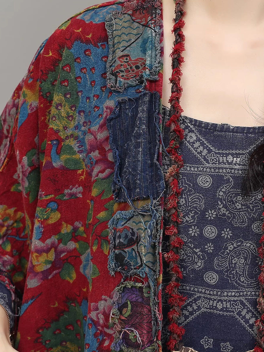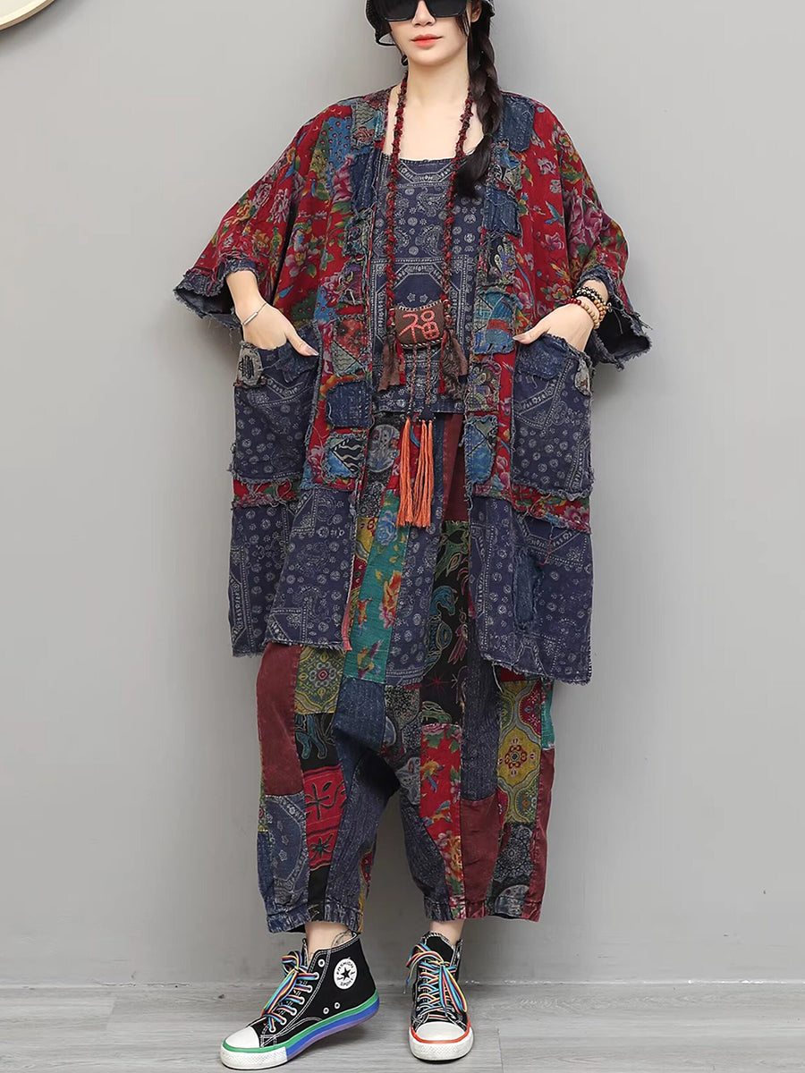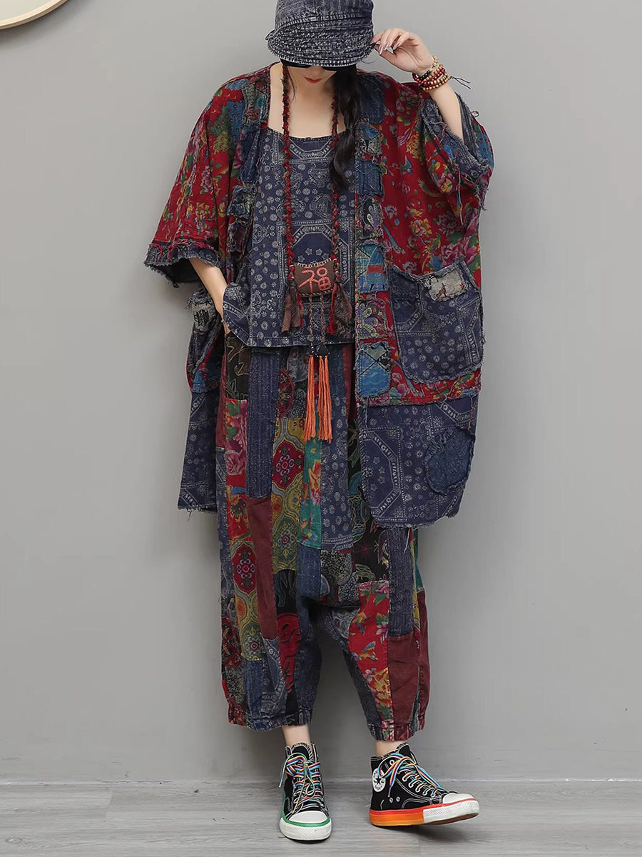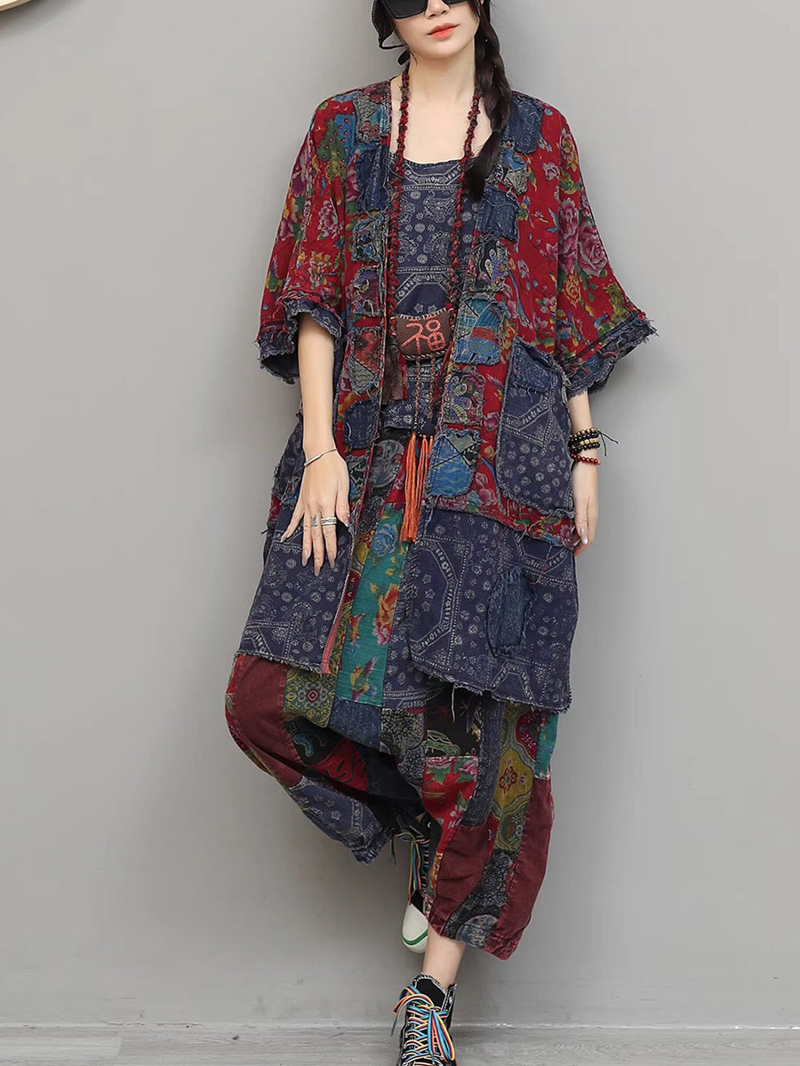 Women Summer Vintage Flower Patchwork V-Neck Suits