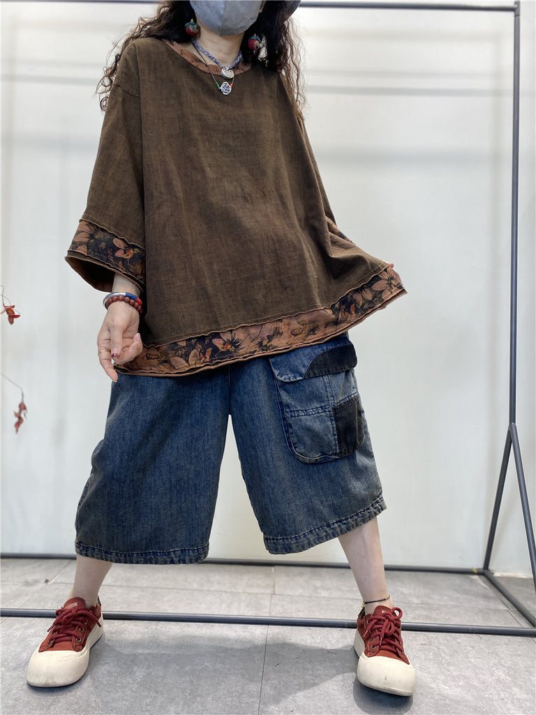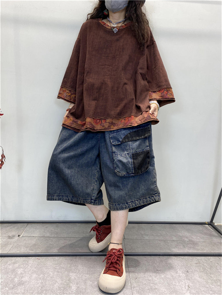 Women Summer Vintage Spliced Worn Solid Cotton Shirt
